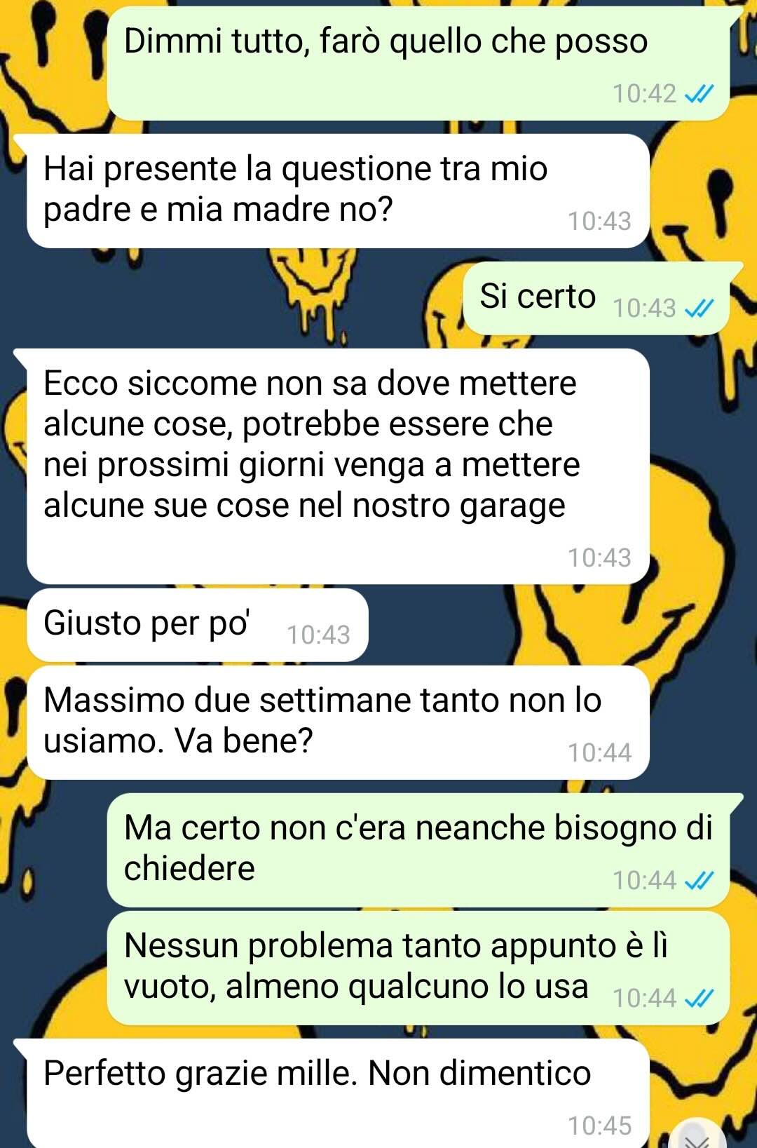 Sono una persona assolutamente pacifica, me lo dicono tutti e me ne rendo conto anch’io: odio portare rancore perciò perdono tutti subito se mi è possibile, cerco di evitare gli scontri se non sono necessari e uso la comunicazione come arma per disinnescare i conflitti piuttosto che le urla o le male parole. Grazie a queste mie doti ho sempre convissuto con i miei coinquilini in un clima sereno e disteso (possiedo una casa in una zona universitaria e ho avuto vari coinquilini che mi versavano un piccolo affitto). Ma che io abbia un animo ostile ai conflitti non significa che permetta agli altri di mettermi i piedi in testa, ovviamente: anche io ho dei limiti che non consento a nessuno di superare, per nessun motivo. Uno di questi limiti è il rispetto di base; se c’è una cosa che proprio non tollero è quando una persona a cui hai dato la mano si prende tutto il braccio o anche di più: mi sembra un comportamento davvero infimo perché non dimostra un minimo di gratitudine. In questo caso ho deciso di aiutare la madre del mio amico nonché coinquilino, prestandole il garage per metterci dentro degli scatoloni di trasloco, ma lei lo ha trasformato in tutt’altro…