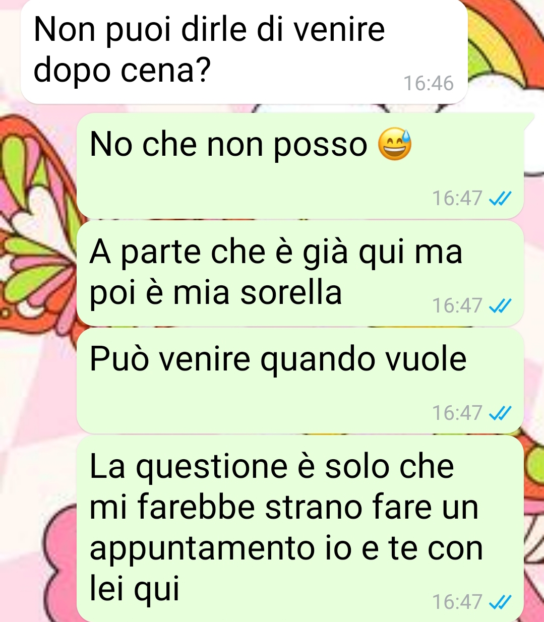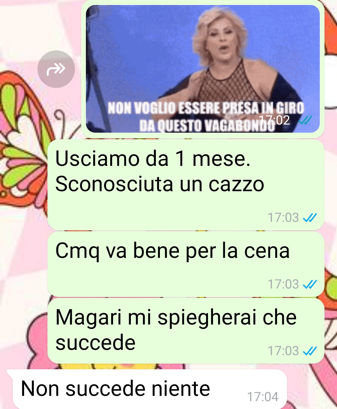 Faccio solo un passo indietro per ricapitolare e per aiutarvi a contestualizzare i messaggi e la conversazione che vi mando con il mio ormai ex “ragazzo” Davide. Metto ragazzo tra virgolette perché onestamente non so che etichetta dargli, visto che ci siamo frequentati per appena un mese, ma va beh. Non ha nemmeno fatto in tempo a diventare il mio ragazzo…
