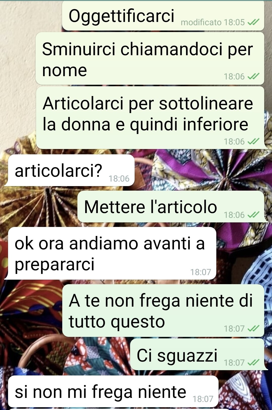 Il problema è che Mauro, in quel momento, aveva ben altro per la testa: doveva prepararsi per andare a una cena con alcuni parenti e, soprattutto, non voleva far tardi. La sua priorità, quindi, era del tutto diversa. Il risultato? Una chat surreale, dove da una parte c’era una riflessione quasi accesa sul sessismo nel linguaggio giornalistico, e dall’altra un susseguirsi di risposte frettolose, sbrigative, e in certi casi del tutto fuori fuoco.