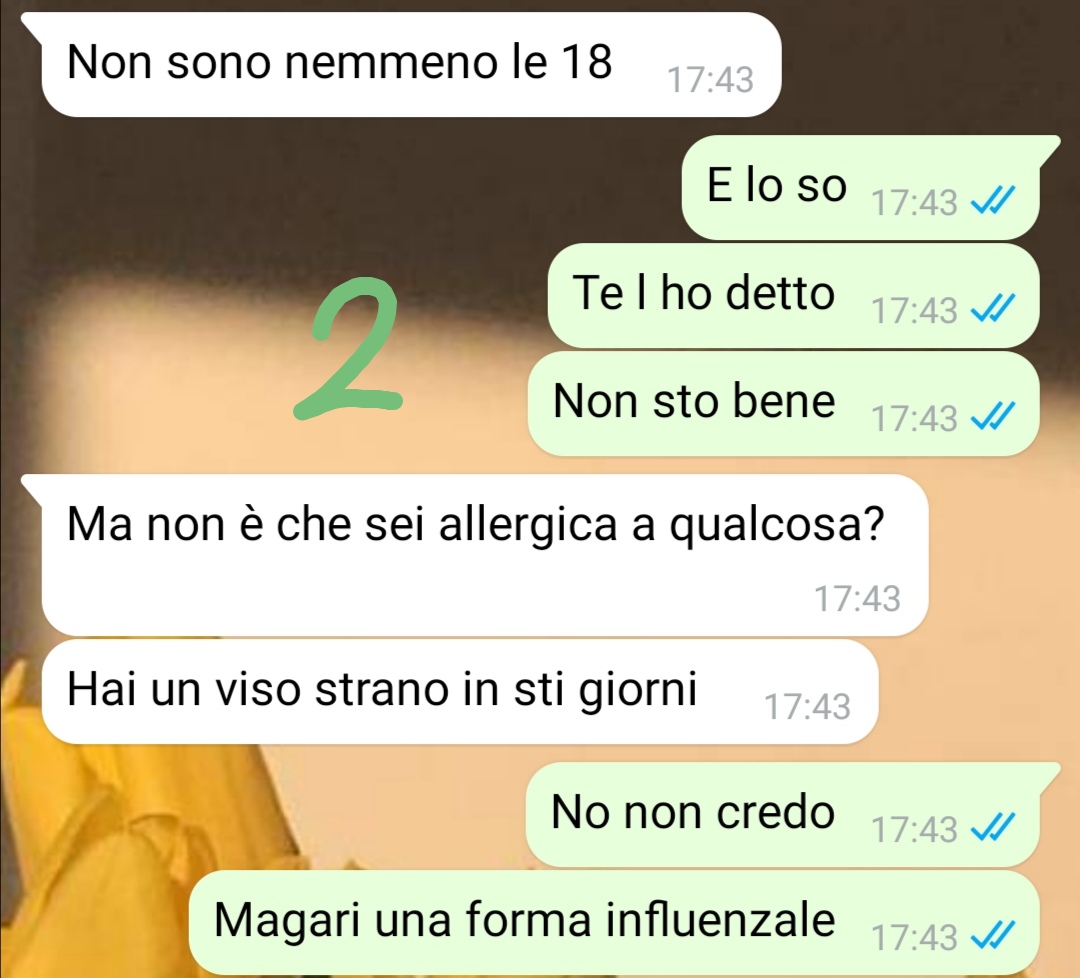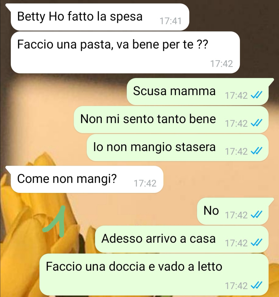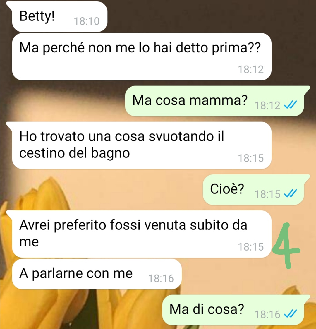 Mi chiamo Elisabetta e tutti mi chiamano Betty, ho 22 anni e una mamma molto giovane che mi ha avuto quando aveva circa la mia età. Siamo cresciute insieme, mio padre l’avrò visto due volte l’anno fino ai 10 anni circa, poi lui si è risposato si è rifatto una famiglia e non lo vedo e sento più. Mia mamma però, seppur giovane quando mi ha avuto, è stata capace di farmi da mamma e papà. Abbiamo vissuto i primi anni con mia nonna, poi lei ha reclamato la sua indipendenza e ci siamo trasferite in un appartamento, lo stesso che condividiamo anche adesso. Siamo davvero cresciute insieme io e lei ed eravamo tutto l’uno per l’altra, fino a quando, tre anni fa, non è entrato nella sua vita Giacomo. Nonostante sia una mamma davvero giovane, è abbastanza apprensiva. Ultimamente non mi sono sentita tanto bene, ero convinta di avere una forma influenzale ma mia mamma insisteva per farmi andare dal medico. Poi lei va a casa e scopre nel cestino del bagno una cosa che la lascia senza parole…ecco la chat che vi mando parte più o meno da qui, ma vi assicuro che non vi aspettereste mai il finale che leggerete…quindi vi consiglio di arrivare fino alla fine. Non ve ne pentirete!