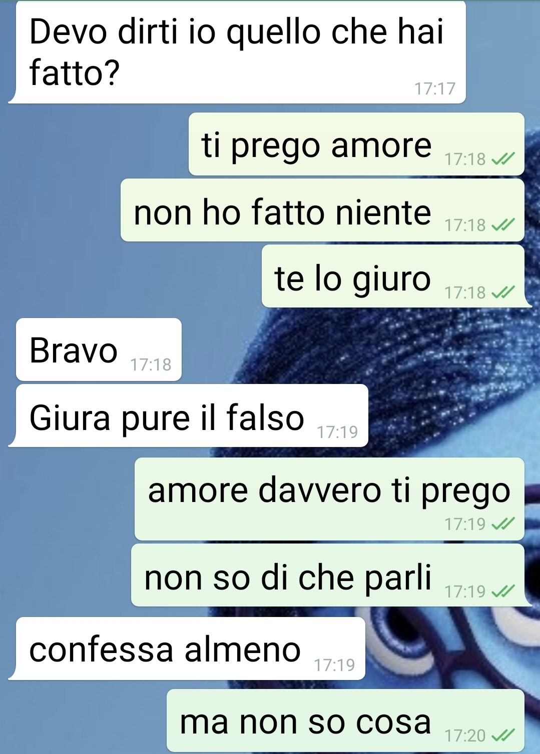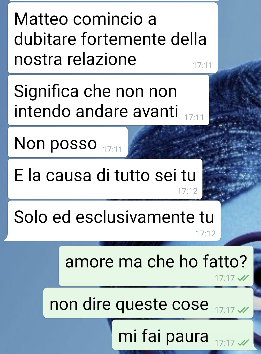 Quali sono le colpe gravi, imperdonabili, tra due che si amano? Cosa non può essere assolutamente tollerato da una fidanzata? A queste domande cari amici e amiche lettori e lettrici di Commenti Memorabili ci può dare una risposta (non certo definitiva) questa discussione che ci ha inviato il buon Matteo. Dalle sue righe di accompagnamento (poco chiare) ci è sembrato di capire che lui è quello che ha sbagliato. Non lo ha fatto apposta ovviamente, ma è riuscito comunque a far perdere le staffe alla “povera” Manuela, che ha dovuto sopportare uno sgarbo davvero brutto. Ci siamo quindi chiesti se il suo fosse un tentativo di chiedere perdono. Potrebbe anche essere così, ma leggendo la chat (questa si chiarissima) diciamo che siamo rimasti spiazzati. Magari anche voi, come noi, passerete dal confuso, allo sbigottimento e infine anche alla rabbia. Perché davvero qua siamo di fronte a un comportamento sbagliatissimo e imperdonabile. Ognuno tiri le sue conclusioni. Ma la vera questione rimane: dove ha preso i pantaloni?