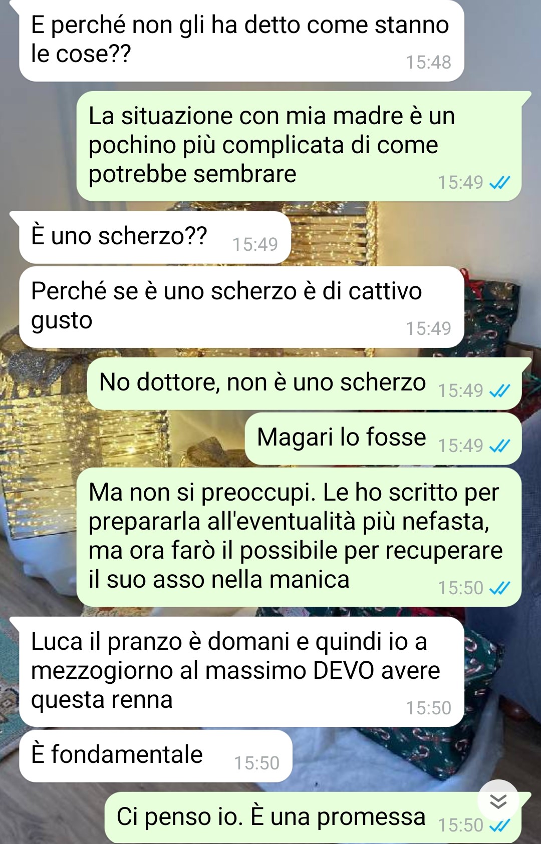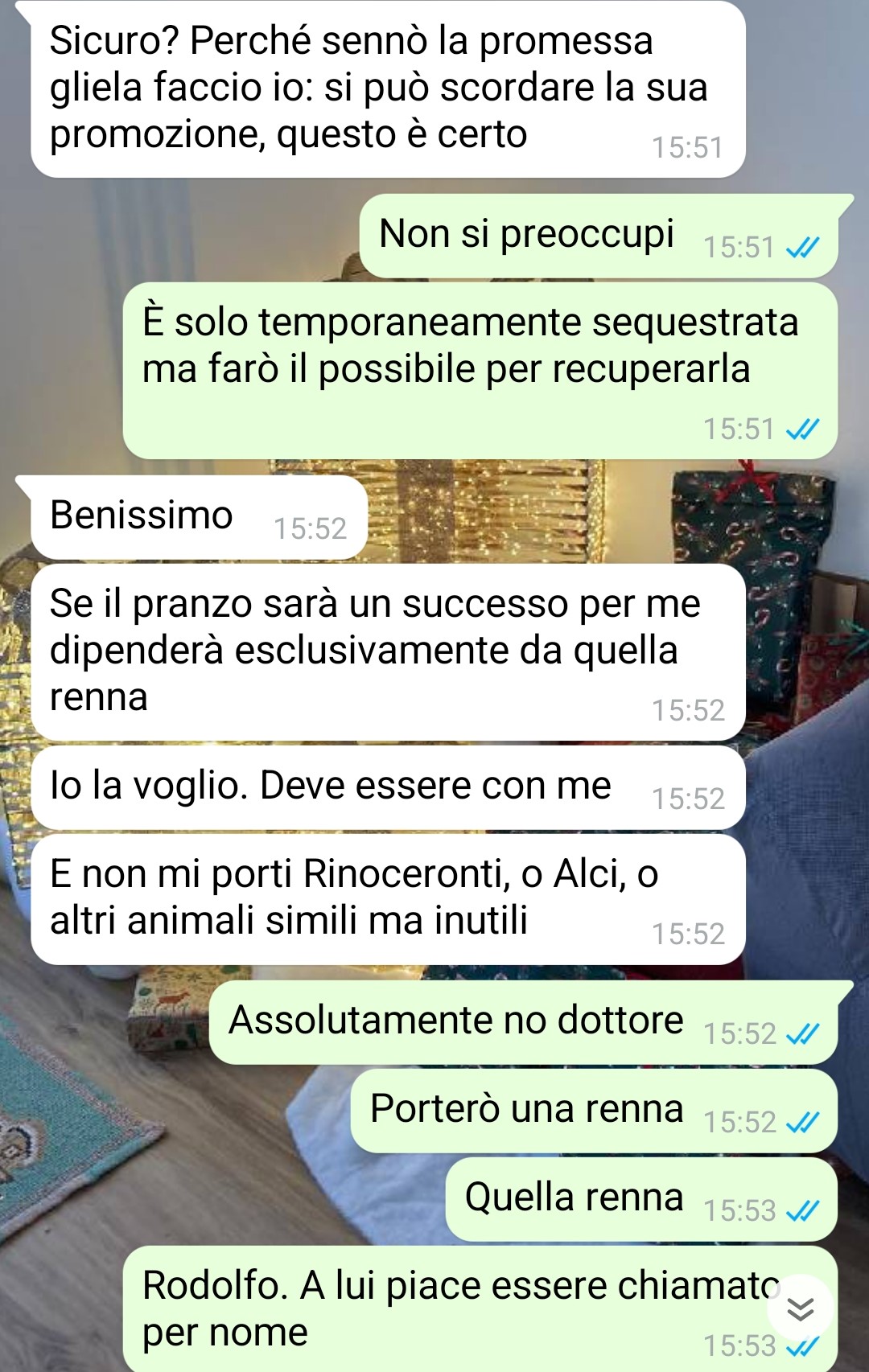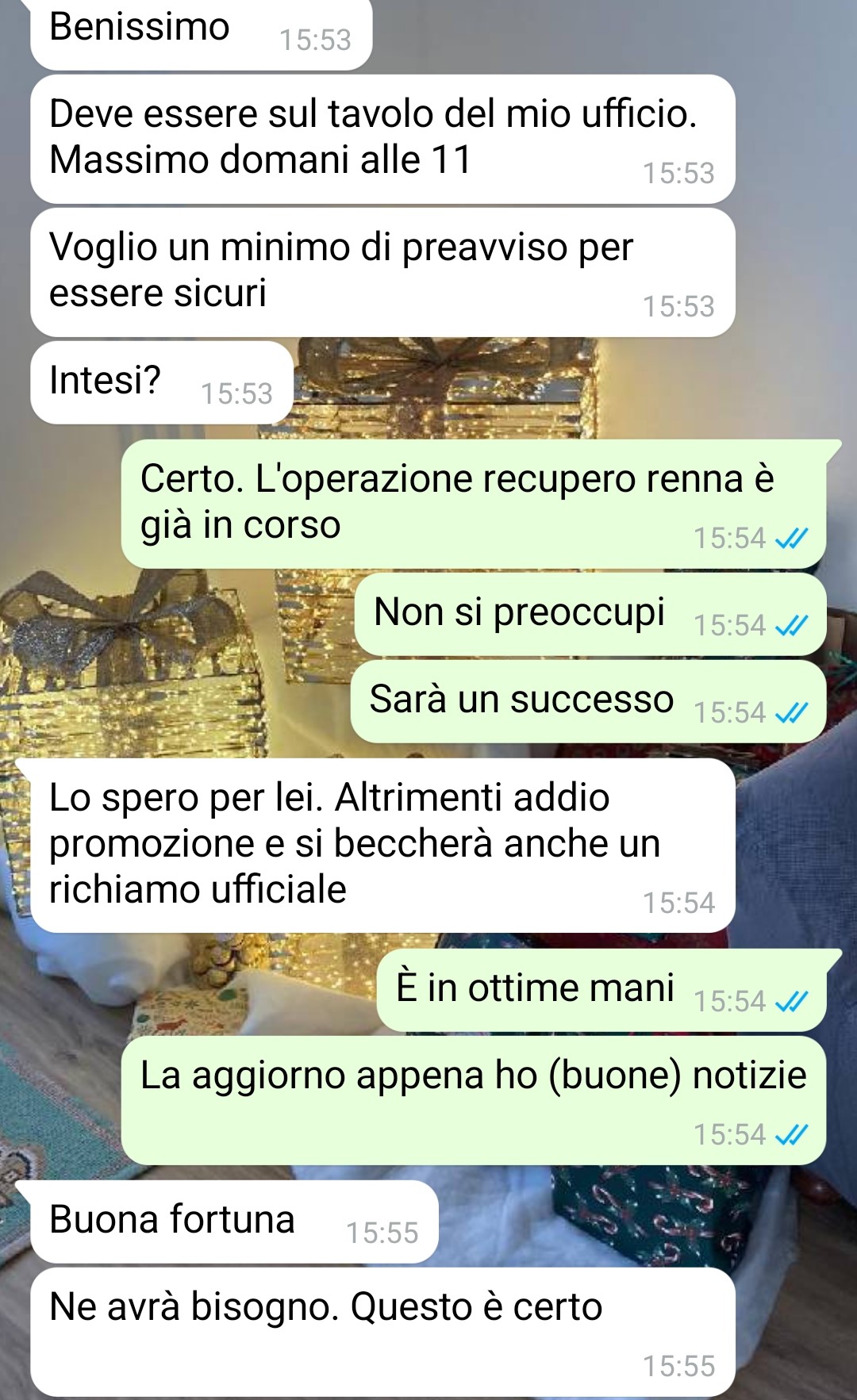 Devo confessarlo: il mio capo è sempre stato un osso duro. Uno di quelli che non ride nemmeno davanti a un cucciolo che inciampa. Rigido, formale, il classico “boss” che mette il terrore anche solo a sentirne il nome. Infatti io lo chiamo Dottore, tutti lo chiamiamo Dottore, anche solo per non ripetere il nome. Questo fino a che, poco tempo fa, è successa una cosa. Ben prima del periodo natalizio ho portato in ufficio, per gioco, una renna peluche, grande, veramente bella, di nome Rodolfo. E lui se n’è innamorato. Proprio è andato fuori di testa per Rodolfo. Qualche giorno fa mi dice che farà un pranzo aziendale con solo i dirigenti presenti e mi dice che ognuno deve portare un oggetto, più bizzarro e divertente sarà, più voti prenderà e quindi più bella figura farà. Ovviamente lui voleva assolutamente Rodolfo e come avrei potuto dirgli di no? Quindi eravamo d’accordo ma purtroppo, il giorno prima, ho avuto un mezzo imprevisto che avrebbe messo a rischio la partecipazione di Rodolfo a questo pranzo, ma anche, indirettamente, la mia carriera. Così gli ho scritto subito