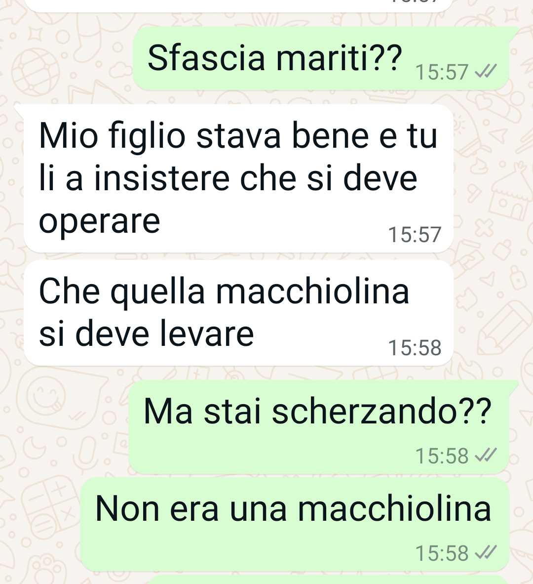 Mio marito si è operato. Mia suocera pensa che lo abbia convinto io per forza. Io posso tollerare tante cose. Davvero ho una grande pazienza. Tollero i maleducati per strada, tollero chi parla a raffica, tollero le persone che non ti chiamano mai. Sono veramente una persona paziente e tranquilla. Mia suocera però è una persona brutta. E lo so che si dice sempre delle suocere che sono persone cattive ma la mia lo è davvero. Ma non è solo cattiva, è pure di una ignoranza senza fine. Non sa nulla di medicina, della vita, dell’empatia e pretende di comportarsi come se fosse santa maria goretti, la persona che sa tutto e che protegge sempre tutti. Quando se fosse per lei mio marito avrebbe rischiato non la vita ma qualcosa di importante. Suo figlio è il mio secondo marito. Il mio primo marito purtroppo è morto… scusate se non vi dico di più, ma non mi va di parlarne. Non siamo noi a decidere le cure. Non dobbiamo affidarci a ciarlatani. Ma ai medici e magari chiedere anche due pareri prima di procedere a una operazione. Vi mando questi screen perché voglio fare vedere a tutti che no, le vostre suocere non batteranno mai la mia. Mi dispiace. La mia è la peggiore di tutte. La suocera ignorante e presuntuosa è la peggiore.