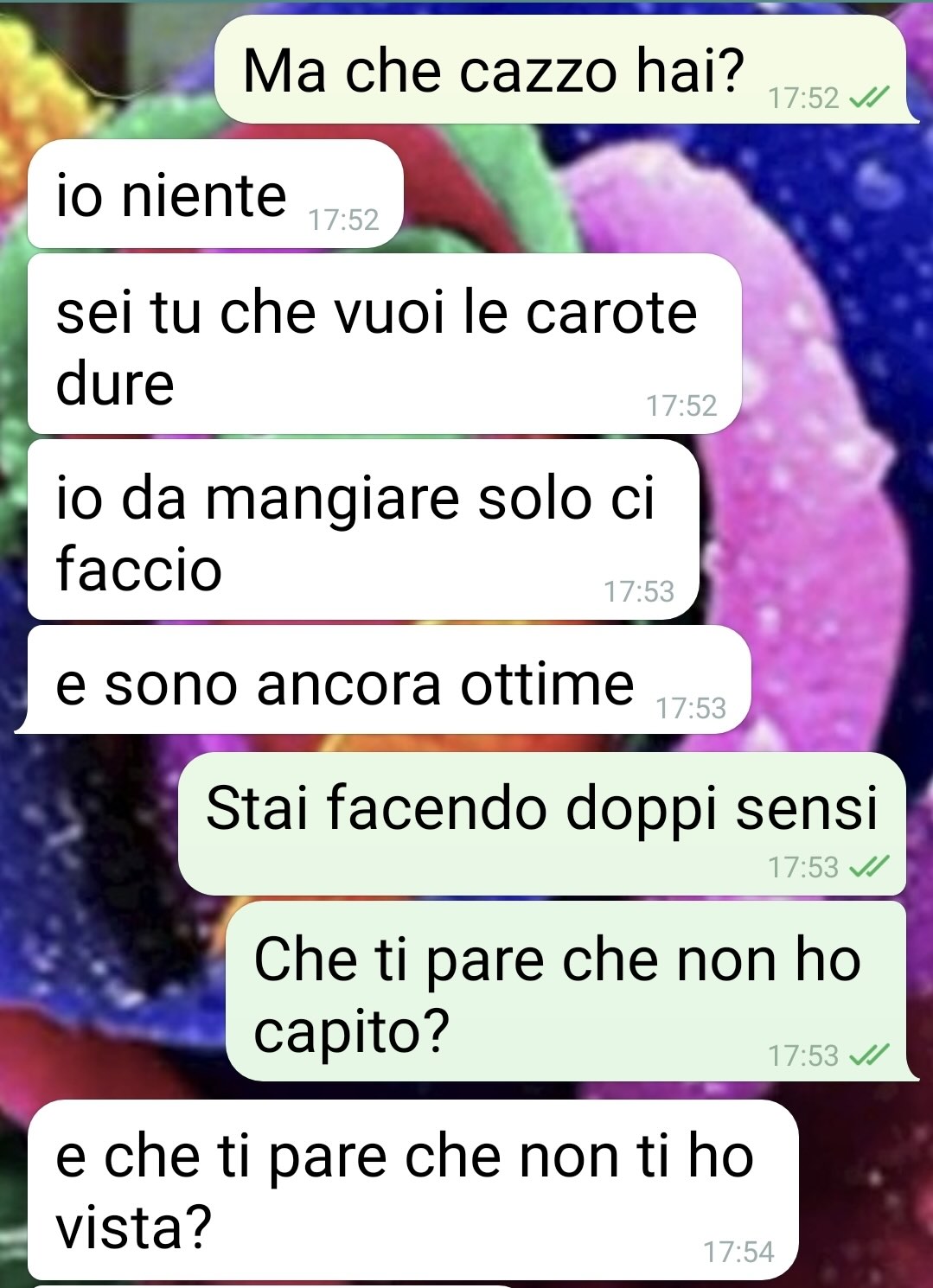 La mia compagna è molto rigida su alcune (diciamo tante) questioni intime… e non sembra voglia allargare i suoi orizzonti, neanche di un po’. Sono Vanessa e sto insieme a Jessica da ormai 2 anni, tanto che da 6 mesi conviviamo. Tra noi va tutto alla grande, ovviamente con le nostre differenze e peculiarità. Diciamo che tra queste lei è quella che mangia di più… io ho un appetito più grande sul lato intimo =) Non ci vedo niente di male che ci si sazi in base alla fame, ovviamente pasti solitari (ah ah). L’ho sempre fatto ma con discrezione, che lei è un po’ bacchettona, giusto per non indispettirla che lo immaginavo che non la prendeva bene. Ma mi ha beccata a quanto pare e da lì nasce questa discussione che vi metto. Ora io spero che i commenti che leggerà (perché anche lei segue la pagina) la faranno magari elasticizzare un po’, quel tanto che basta a renderla meno bacchettona. Perché diciamoci la verità… che male ho fatto io? Non lo facciamo (quasi) tutte? =)