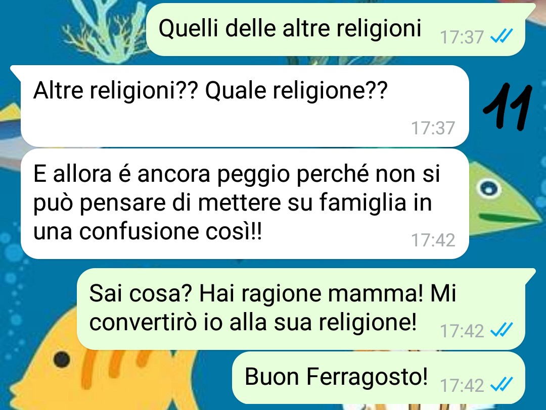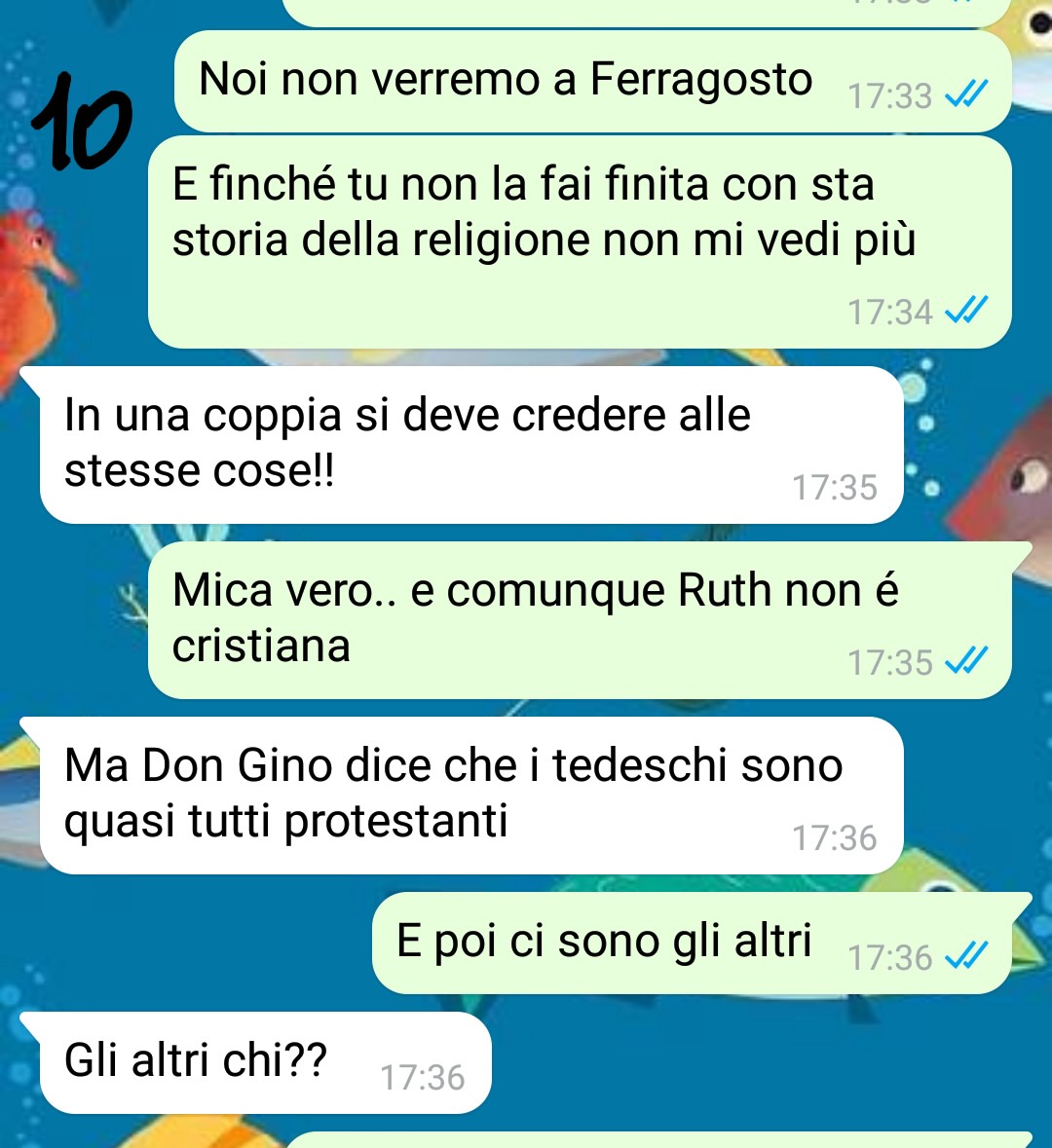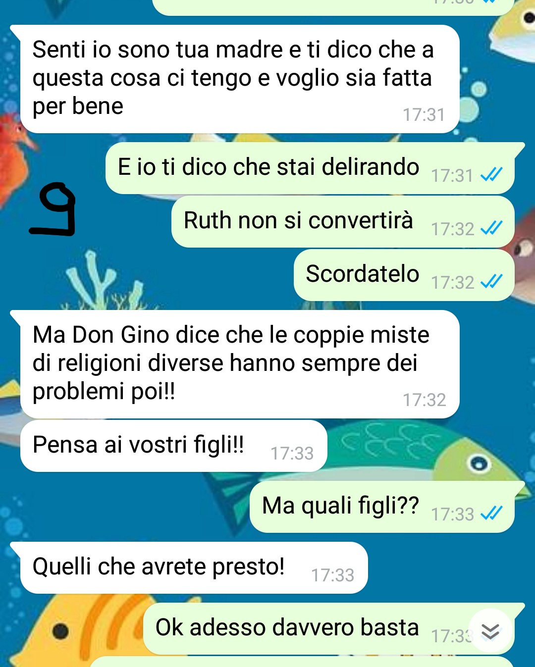 Il nostro fan ha deciso di condividere con noi la conversazione avvenuta in quell’occasione per mostrare con chiarezza il tipo di atteggiamento che la sua compagna si è trovata a subire. Una testimonianza che mette in luce quanto, ancora oggi, differenze culturali e pregiudizi possano pesare all’interno delle dinamiche familiari.