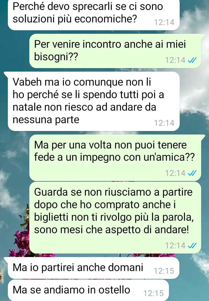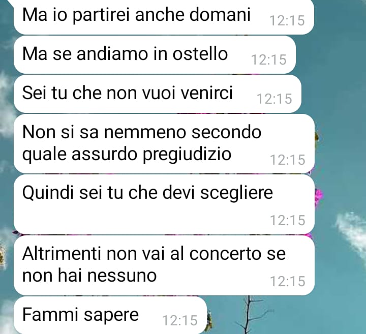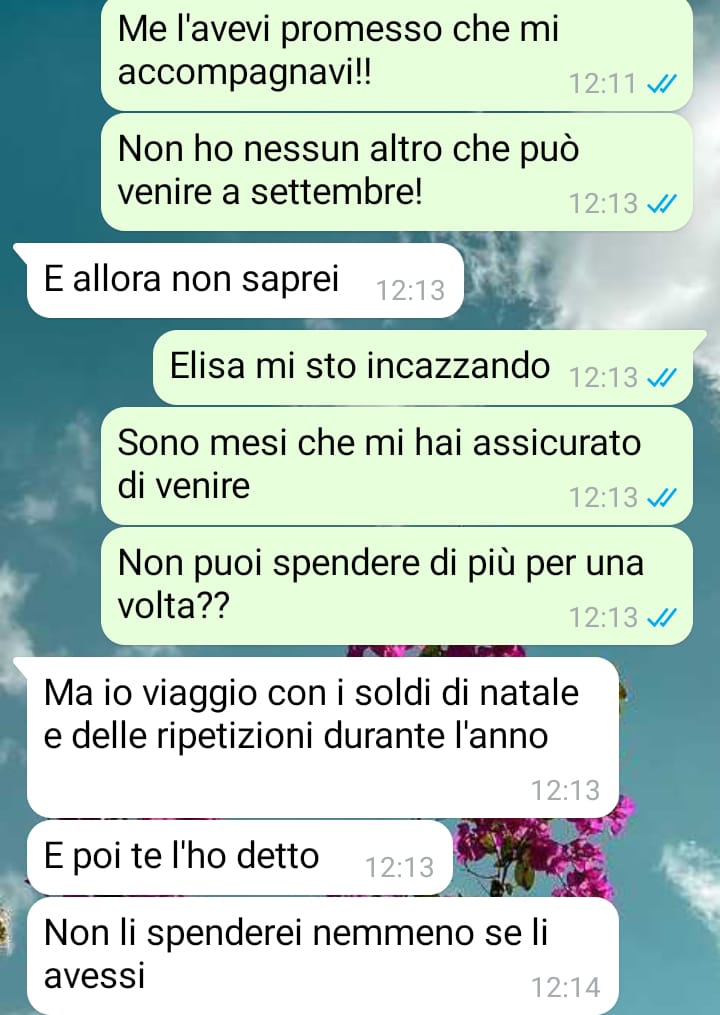 Elisa, che va spesso fuori con le sue amiche dell’università, ha accettato di accompagnarla quando qualche mese fa le ha chiesto se voleva andare con lei. Le disse che poteva occuparsi dell’organizzazione del viaggio, essendo più esperta. A causa delle lezioni e degli esami, non si sono viste molto spesso, ma qualche giorno fa Elisa le ha scritto.