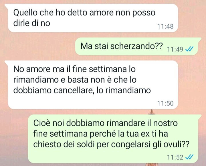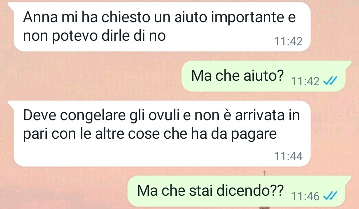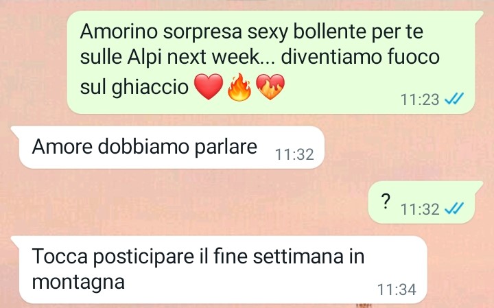 Il mio nome è Giada e 3 anni fa mi sono messa con un pazzo schizzato di nome Alessio. Nonostante la sua follia però, sono sempre stata innamorata di Ale tanto che dopo un anno e mezzo insieme abbiamo iniziato a convivere. Adesso è quasi un anno circa che stiamo provando ad avere un figlio ma purtroppo non arriva, nonostante le stiamo sperimentando tutte e godiamo entrambi di ottima salute. Poco fa ho scritto ad Alessio in merito ad una piccola sorpresa hot che avevo preparato per lui in vista del nostro weekend rilassante sulle Alpi (programmato proprio nei miei giorni fertili…) ma leggete un po’ cosa ha risposto il mio compagno e soprattutto perché… ennesima lezione appresa comunque: mai fare affidamento per niente sugli altri nei periodi in cui sono disoccupata e non lavoro… nemmeno sul mio “grandioso compagno” visto che poi le risposte che ricevo sono queste…