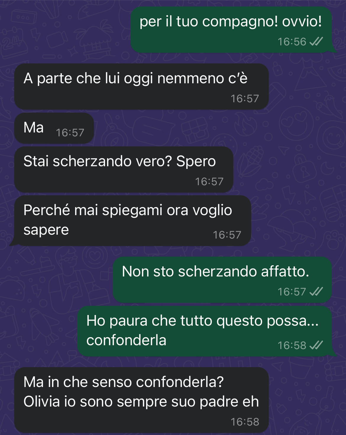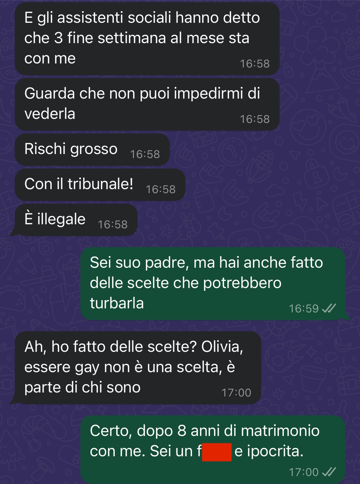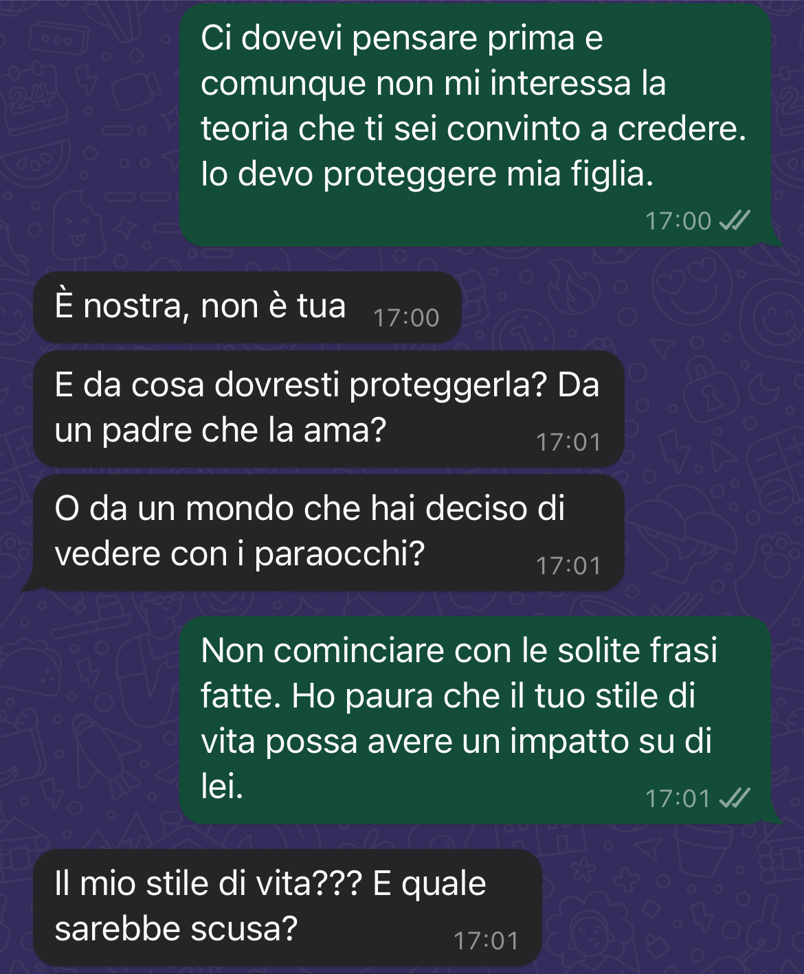 Ciao Commenti Memorabili, vi condivido questa conversazione con il mio ex marito perché sono profondamente preoccupata per nostra figlia. Lui ha preso una strada che io reputo sbagliata e NON VOGLIO che confonda la nostra piccola Martina, che ha solo 6 anni. Il giudice, per ora, ha deciso che in settimana sta con me e tre weekend al mese con il padre, ma io non sono d’accordo. Martina è una bambina dolce e sensibile, e credo che abbia bisogno di un ambiente stabile e sicuro. È ancora troppo piccola per capire certe cose, e temo che questa situazione possa confonderla o addirittura turbarla. Cerco di spiegargli la mia posizione, ma lui non capisce o, peggio, non vuole capire. Mi dice che non c’è nulla di sbagliato, si difende dicendo che ama Martina e che è un bravo padre. Ma io ho paura che non stia vedendo le cose con chiarezza e che le sue decisioni possano avere conseguenze gravi sulla mia bambina. Sono convinta che il suo attuale stile di vita non sia adatto per una bambina così piccola. Vi invio la nostra conversazione per farvi capire cosa sto vivendo. È come parlare con un muro. Io mi sento impotente e frustrata. Secondo voi sto esagerando o sto facendo la cosa giusta per proteggere mia figlia? Mi sembra che tutto il mondo sia contro di me.
