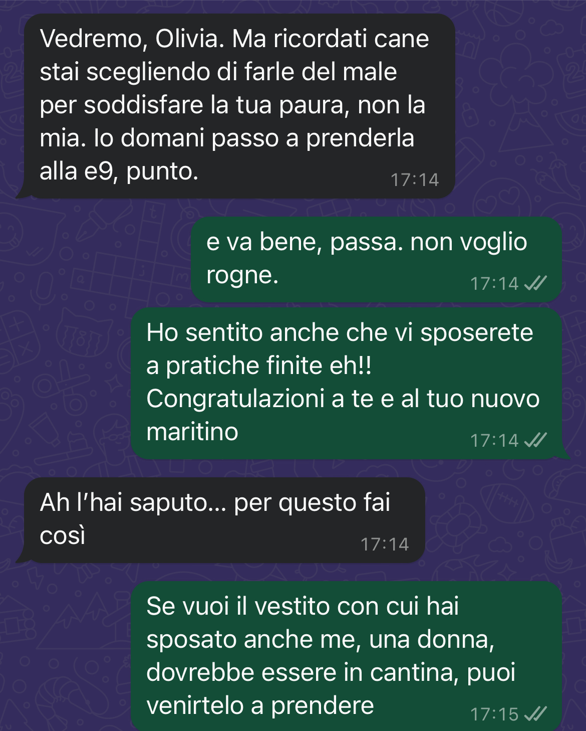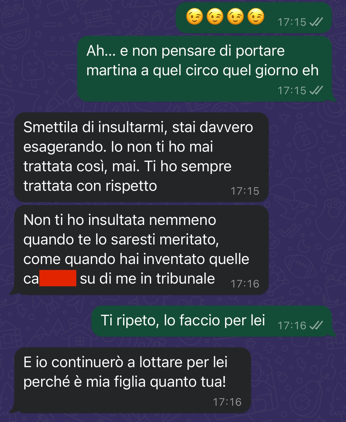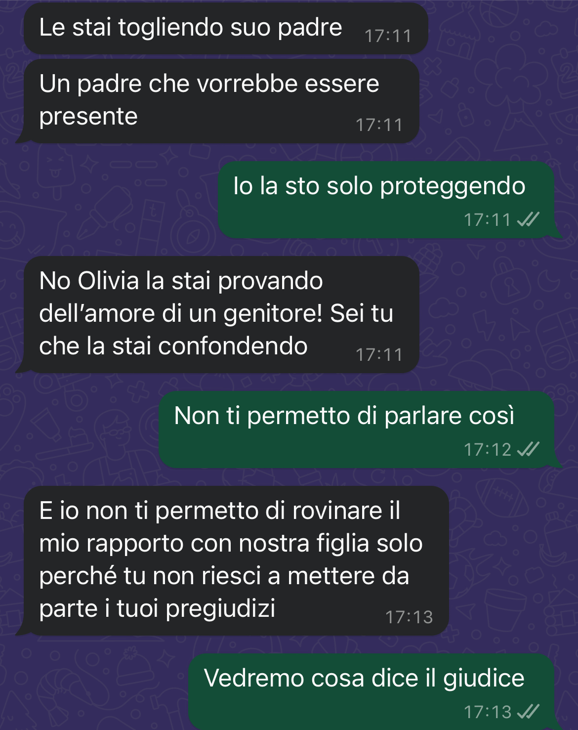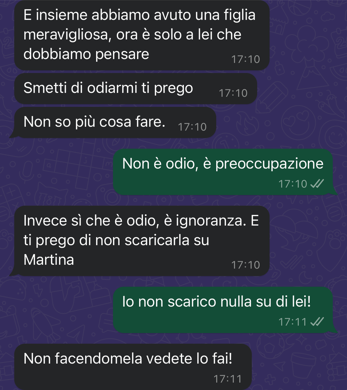 La nostra fan ritiene che l’ex marito abbia intrapreso una strada sbagliata e teme che questo possa confondere o turbare la piccola Martina. Nonostante i suoi tentativi di spiegare le proprie preoccupazioni, l’uomo sembra non comprendere o non voler accettare il punto di vista della ex moglie. Il padre si difende sostenendo di amare la figlia e di essere un bravo genitore, affermando che non c’è nulla di sbagliato nel suo comportamento. Tuttavia, la donna è convinta che l’attuale stile di vita dell’ex marito non sia appropriato per una bambina così piccola e teme che le sue decisioni possano avere conseguenze negative sulla figlia.