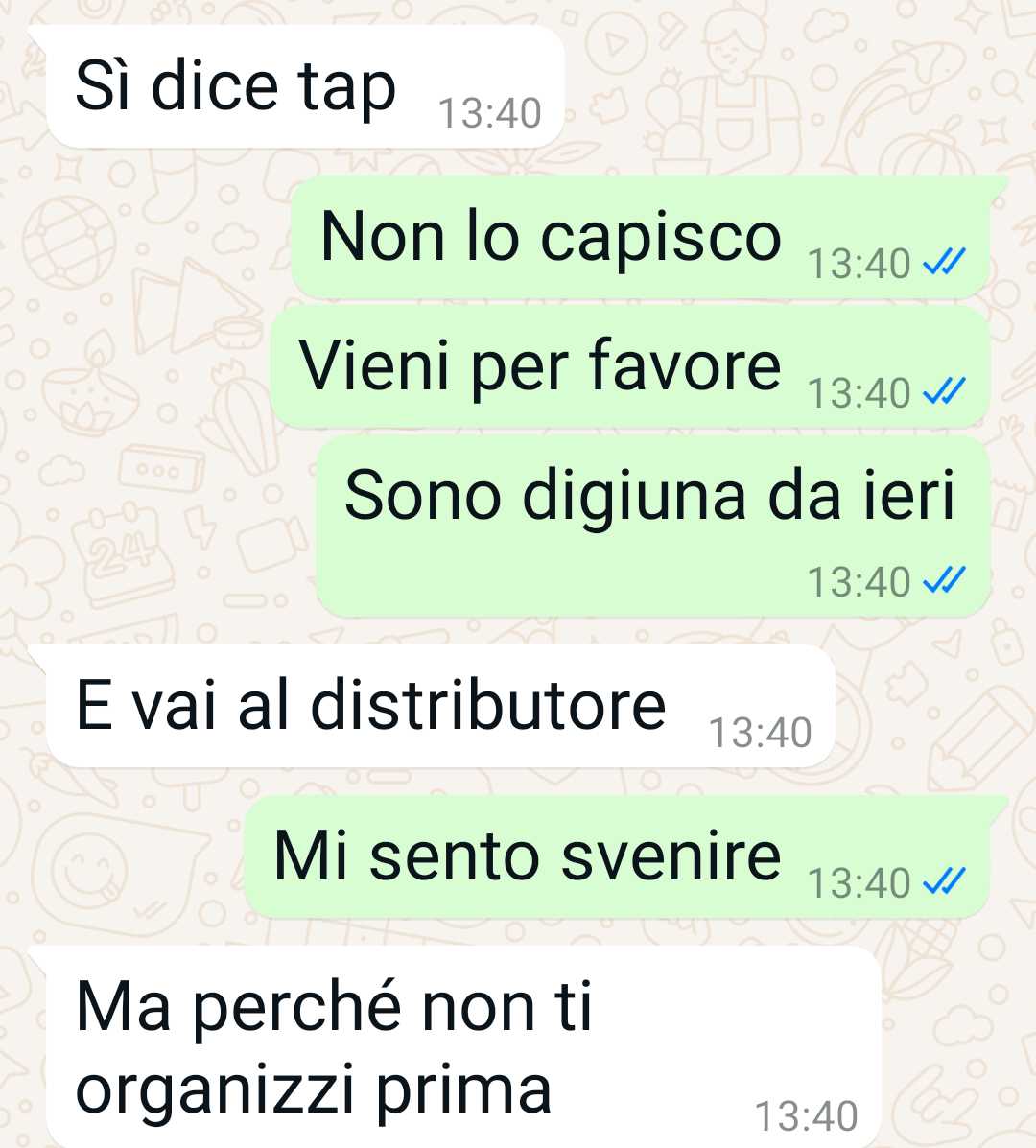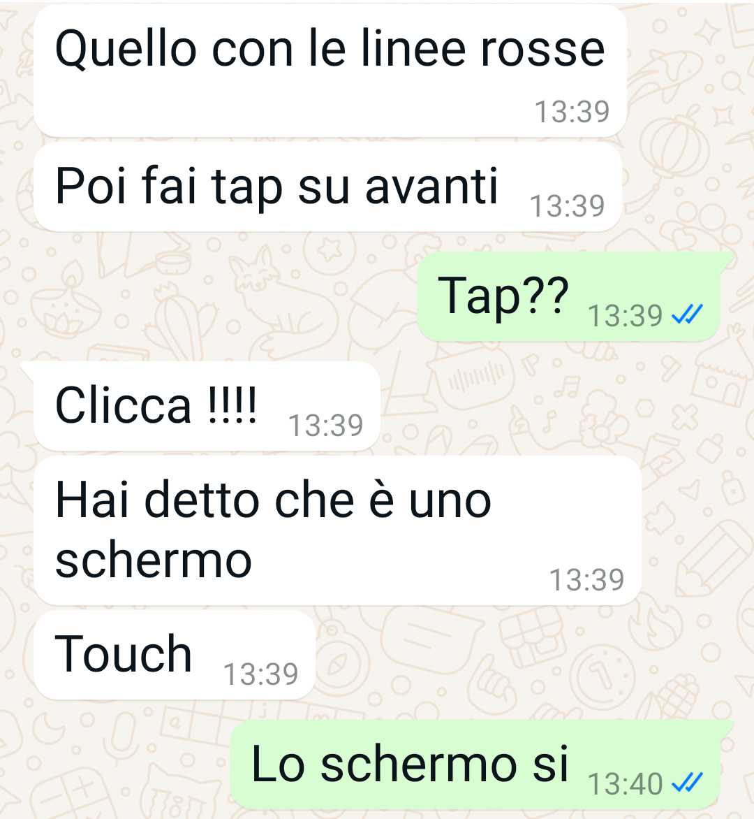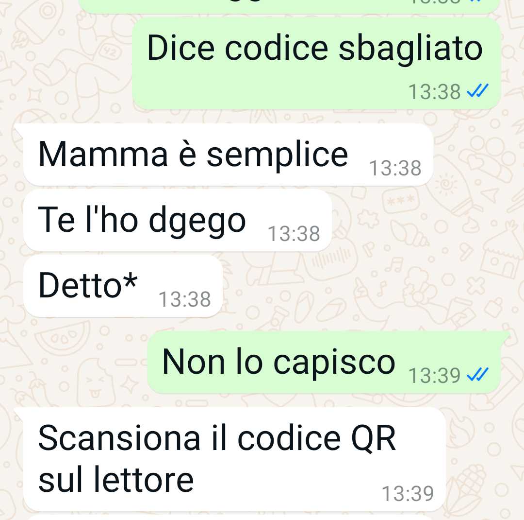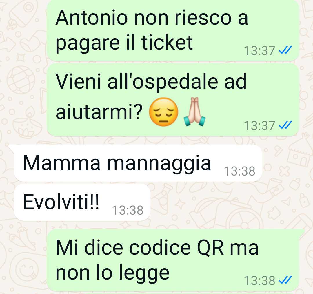 Sono la signora Lia. Ho fatto ecografia addome completo, ma non ero capace di pagare il ticket alla macchinetta. Mio figlio si è arrabbiato giustamente. Mio figlio mi ha detto che devo imparare a usare la tecnologia. Non è facile per chi è grande. Uso whatsapp, uso facebook e me la cavo in queste cose. Però i codici QR non li so scansionare come si dice. A me mi odiano quelle macchinette e non me li legge. Nemmeno il cellulare me li legge. Ho chiesto a mio figlio di venire ad aiutarmi… lui è giovane e sa fare tutto, è bravissimo a differenza di me… ma ho fatto proprio brutta figura. Mi sono beccata proprio una bella punizione. Sono qui che vi scrivo che spero di imparare a usare meglio la tecnologia di oggi. Voglio essere più indipendente… mi è successa una brutta cosa che spero non si capisca tanto dai messaggi. Mio figlio mi ha alla fine aiutato ed è come se mi sembra mio padre che mi dà una punizione. Me ne ha date tante mio padre. Ho imparato la lezione e ora spero di imparare pure a usare i QR. Buona sera. Signora Lia