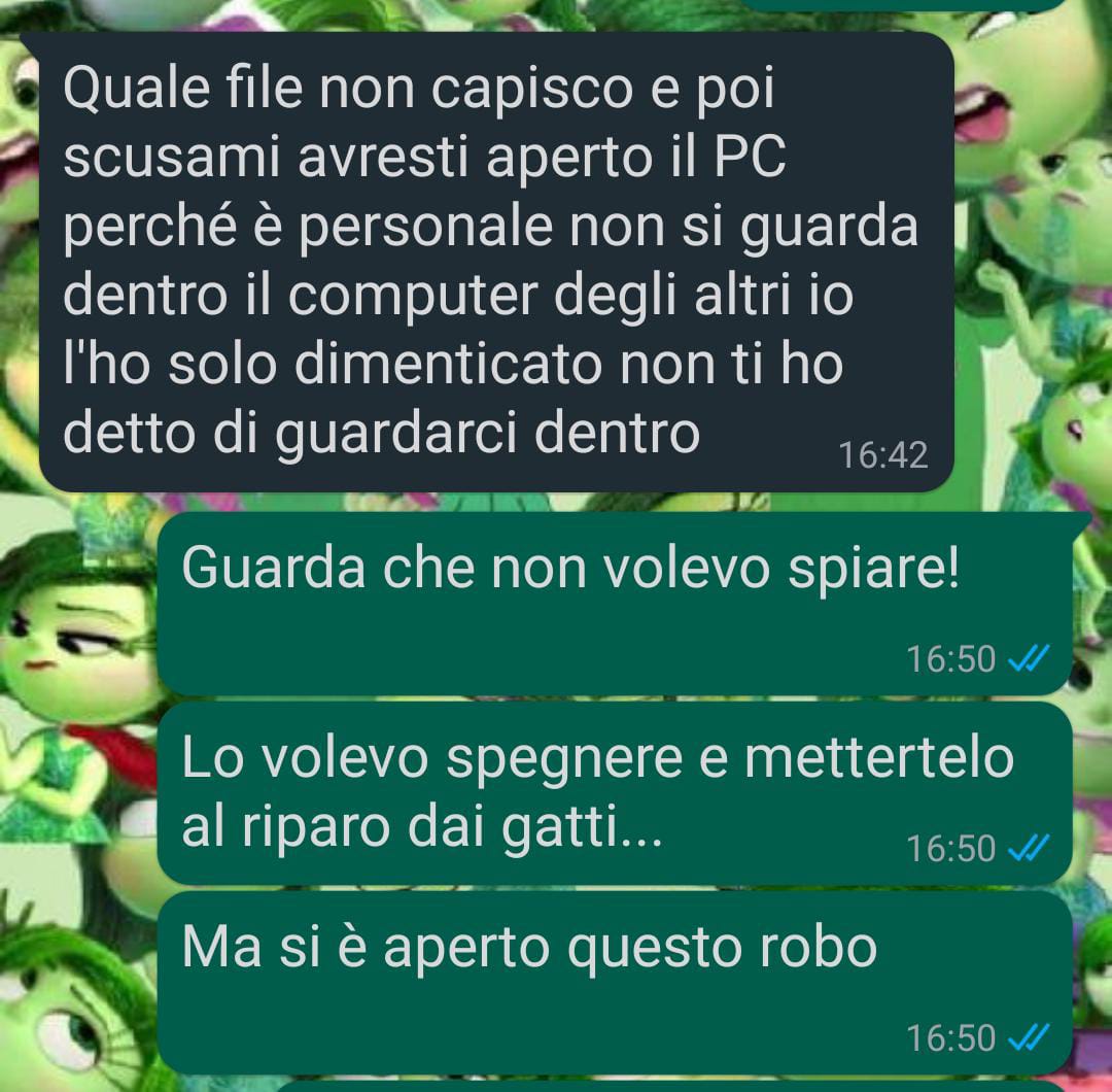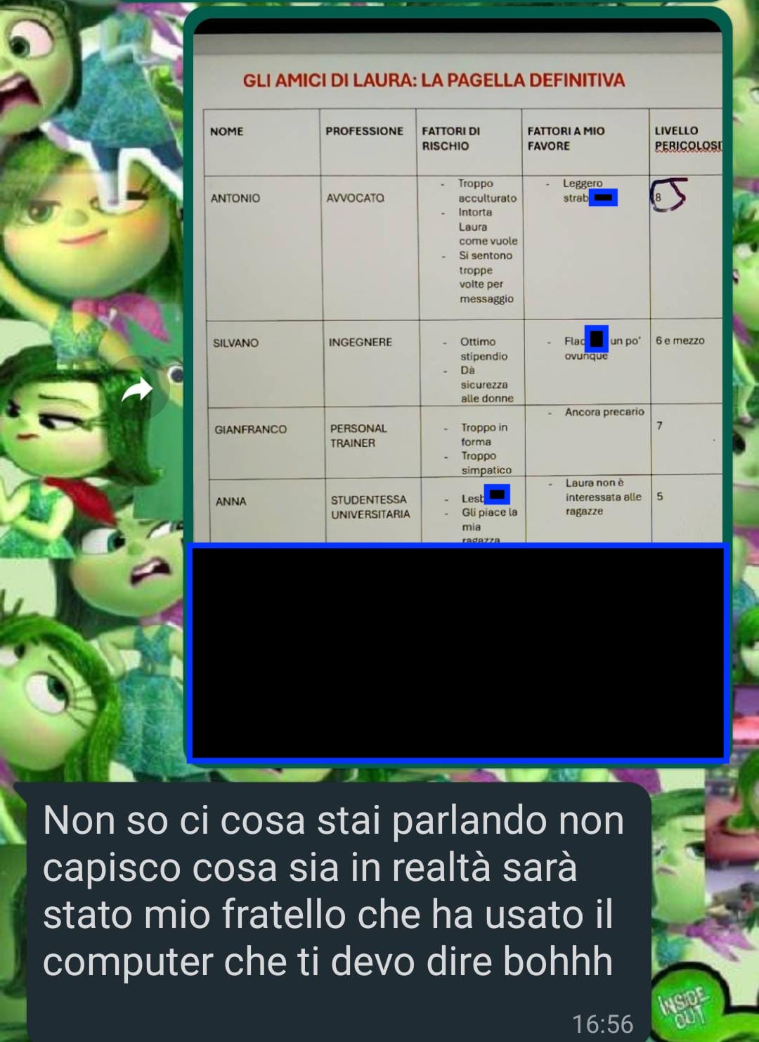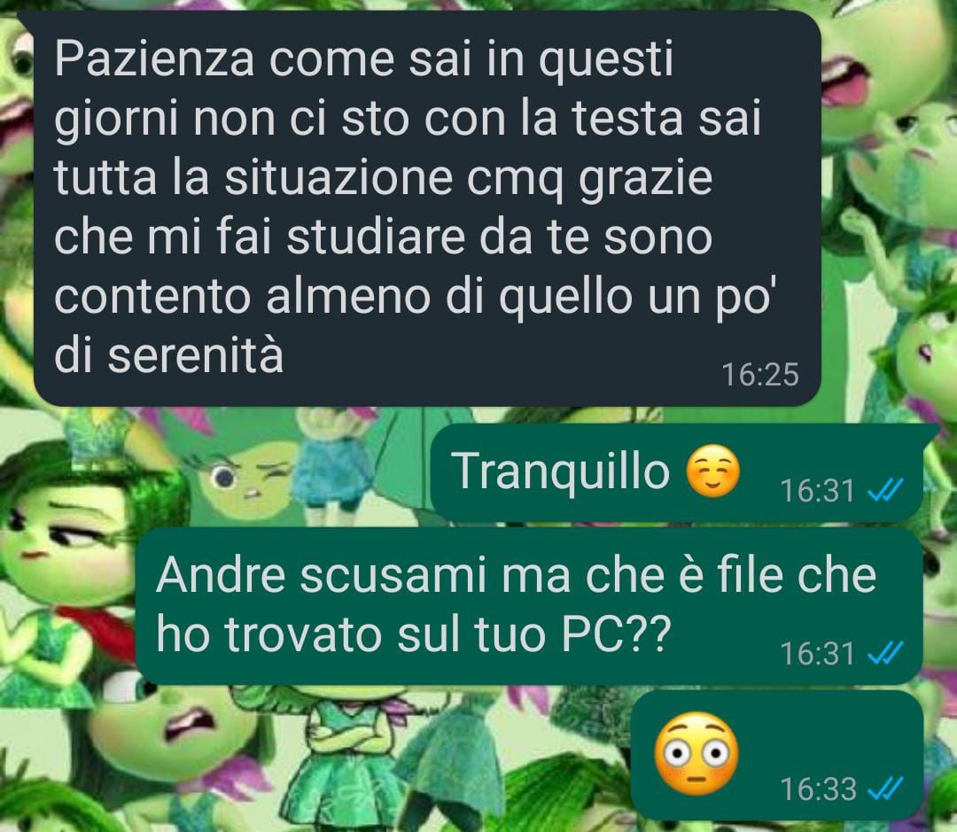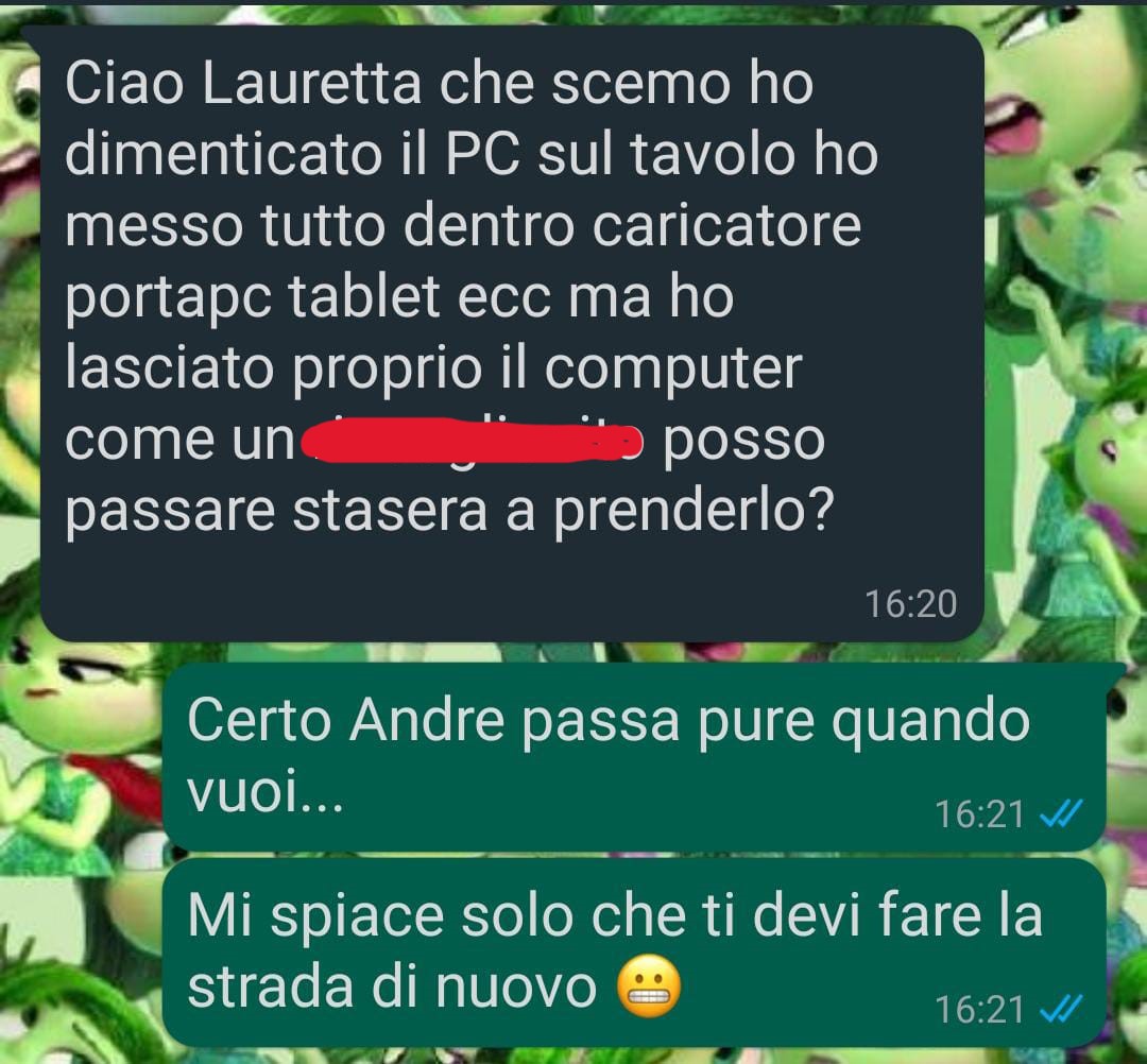 A fare del bene a volte si fa una cazzata… ma aspettate che vi racconto.Mi chiamo Laura e studio al secondo anno di scienze politiche. Sono in ritardo con gli studi perché quando è mancata mia mamma non sono riuscita a fare niente per almeno un paio di anni. Ma ne sono venuta fuori grazie a mio padre e ai miei amici di sempre.Ora abito con mio papà, in una casa un po’ fuori città. Abbiamo cambiato aria dopo che mia mamma se n’è andata.Ho trovato un bel ritmo, nel fine settimana lavoro come cameriera in paese, in settimana studio e seguo le lezioni. Ho conosciuto anche dei nuovi amici all’uni, con cui studiare.Il mio gruppo storico di amicizie infatti già lavora e si è laureato prima di me, molti sono più grandi, e per quanto meravigliosi siano ho anche bisogno di qualcuno che mi motivi a studiare. Per fortuna la casa aiuta: ha un grande giardino. Con vista montagne. Nella bella stagione studio sotto il pergolato che mio papà ha fatto, in mezzo alle rose e alle camelie.. Tutto molto bello e rilassante. Non invidio per nulla i miei compagni fuori sede che condividono stanze piccole in un centro asfissiante e pieno di smog.Comunque, in tutto questo ho conosciuto Andrea, uno del nuovo gruppo di compagni di uni, e ho visto che stava passando un brutto periodo. La sua ragazza lo ha lasciato per un altro dopo anni che stavano insieme.Peccato che però abitassero nello stesso appartamento, e lei ha dato la disdetta per andarsene ma ha ancora tre mesi di tempo per stare.Andrea mi sembrava un tipo piuttosto sensibile. Mi ha fatto tenerezza e gli ho proposto di venire a studiare da me qualche volta. E l’ho fatto uscire pure insieme ai miei amici di sempre, per fargli cambiare aria e non vedersi sempre con le persone che ha in comune con la ex.Però c’à da dire che Ospito spesso amici per sessioni di studio, mi fa piacere che respirino un po’ d’aria pulita… quindi pensavo che la situazione fosse chiara. Invece c’è stato un risvolto piuttosto inquietante… Se avete voglia di leggere, ho mandato a Spunte tutti gli screen della nostra conversazione!