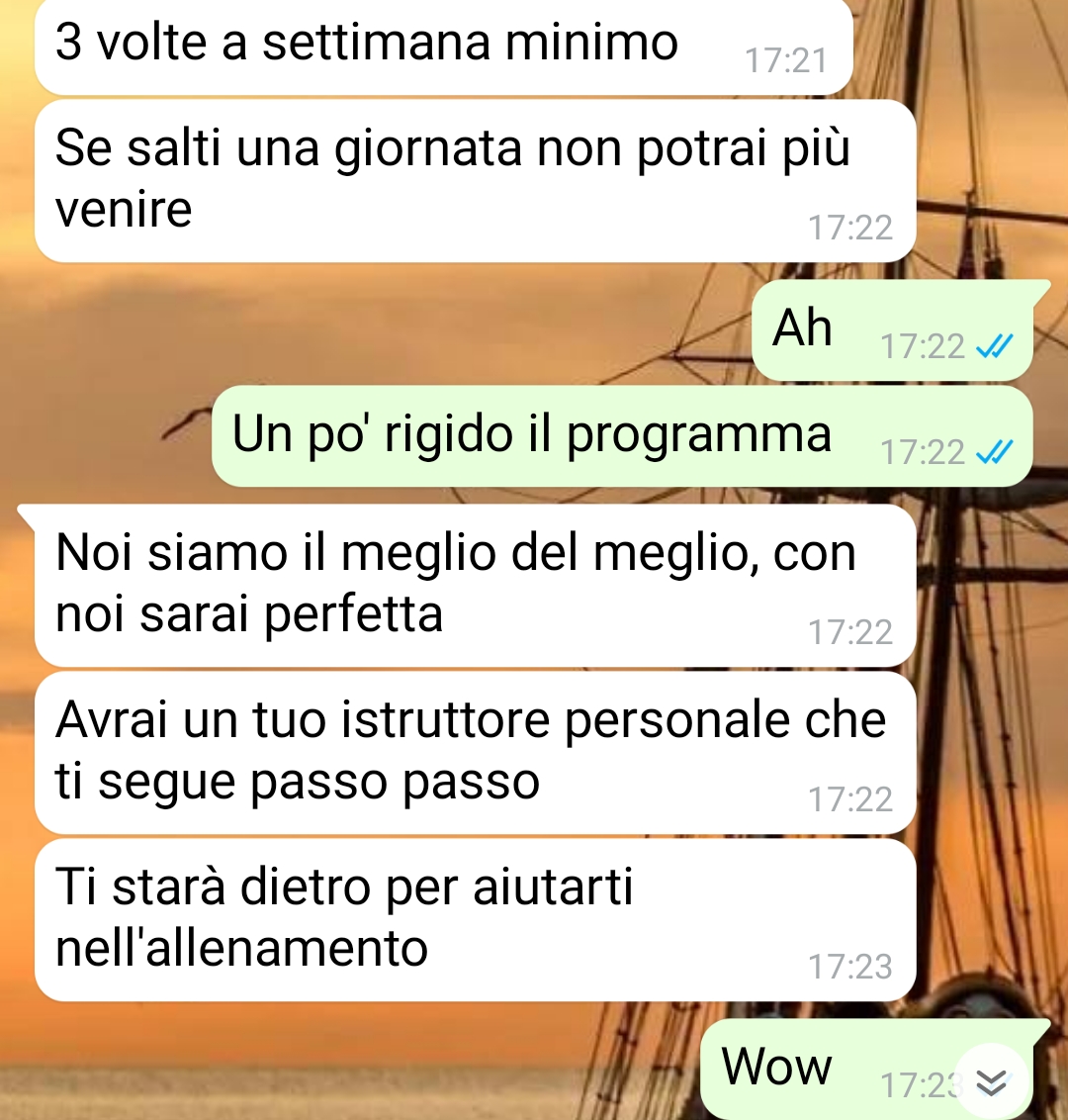 Ciao a tutti quanti i lettori di Commenti Memorabili, sono Anna e voglio che leggiate della conversazione più brutta, demoralizzante e cattiva che mi sono ritrovata ad affrontare. Con una persona che si chiama Massimo, un uomo di una bruttura interiore come ne esistono davvero poche al mondo. Il bello è che mi era pure stato consigliato di scrivergli da una mia carissima amica che va nella sua palestra. Perché il discorso è proprio questo. Che io ho avuto un brutto problema di ernia e ho necessità di andare un po’ in palestra per fare attività fisica e rimettermi in forma. Non qualcosa di pesante ovviamente, ma che mi permetta di stare meglio. Di mio non sono una con un brutto fisico, ma è certo che non muovendomi da un bel po’ non sono in formissima. Ho chiesto ad alcuni amici se conoscessero palestre buone dove potevo essere seguita bene e questa ragazza che conosco mi ha consigliato un posto gestito da questo Massimo, avvisandomi che è uno un po’ stravagante, ma questo è il minimo rispetto a ciò che mi ha detto. Non vuole si vada in palestra a fare richiesta o avere informazioni, anzi la porta è sempre chiusa e si entra con una tessera. Per poterla avere bisogna fare una sorta di colloquio con lui su WhatsApp ed è così che l’ho contattato.