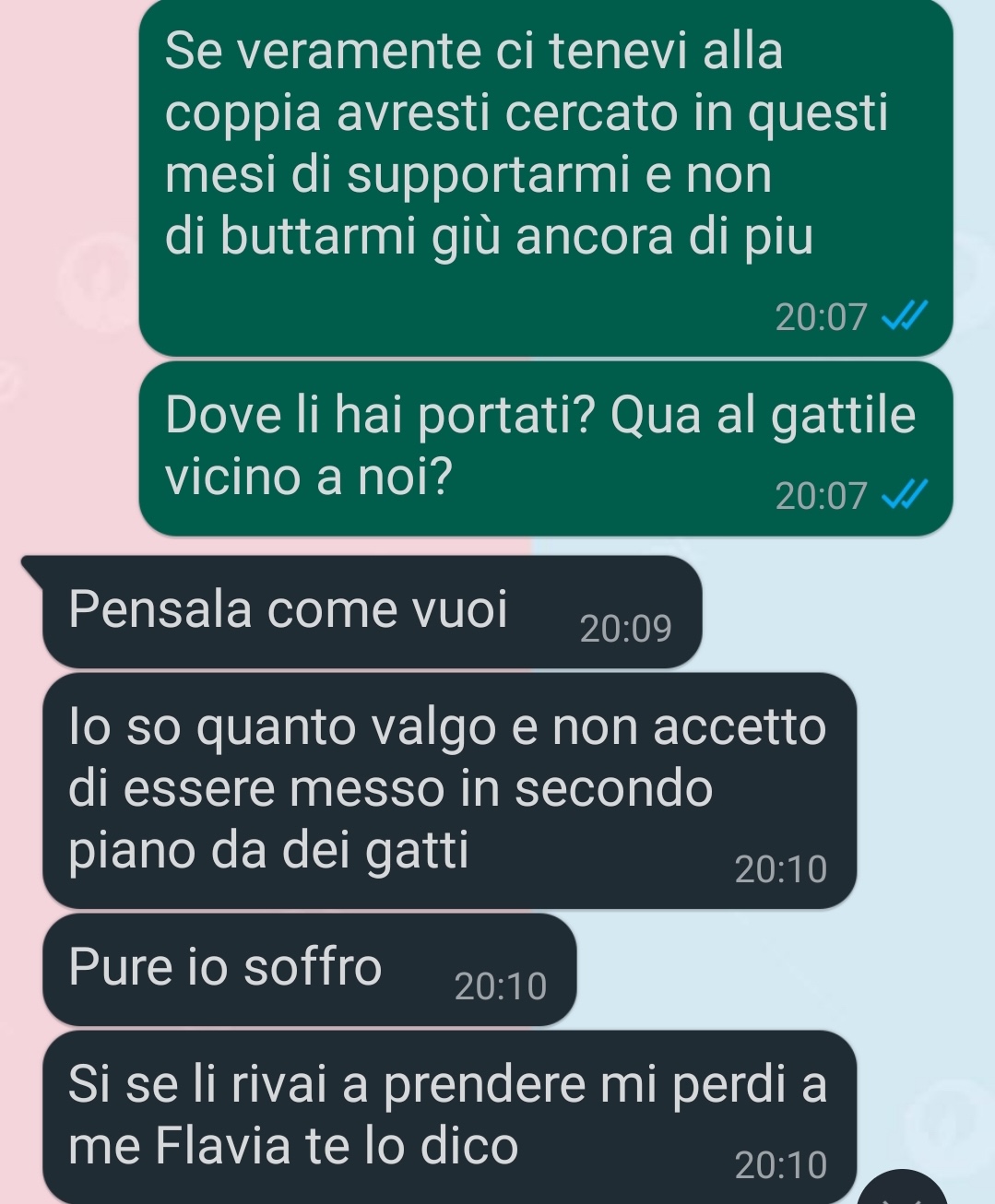 A partire da quell’evento, i rapporti tra i due hanno cominciato a deteriorarsi. Le discussioni sono diventate più frequenti e il clima in casa è cambiato, anche se la nostra amica non avrebbe mai immaginato che la situazione fosse arrivata a un punto così critico. Malgrado tutto, riusciva a trovare un momento di serenità nella compagnia dei suoi due gatti, che descrive con affetto come “piccoli”.