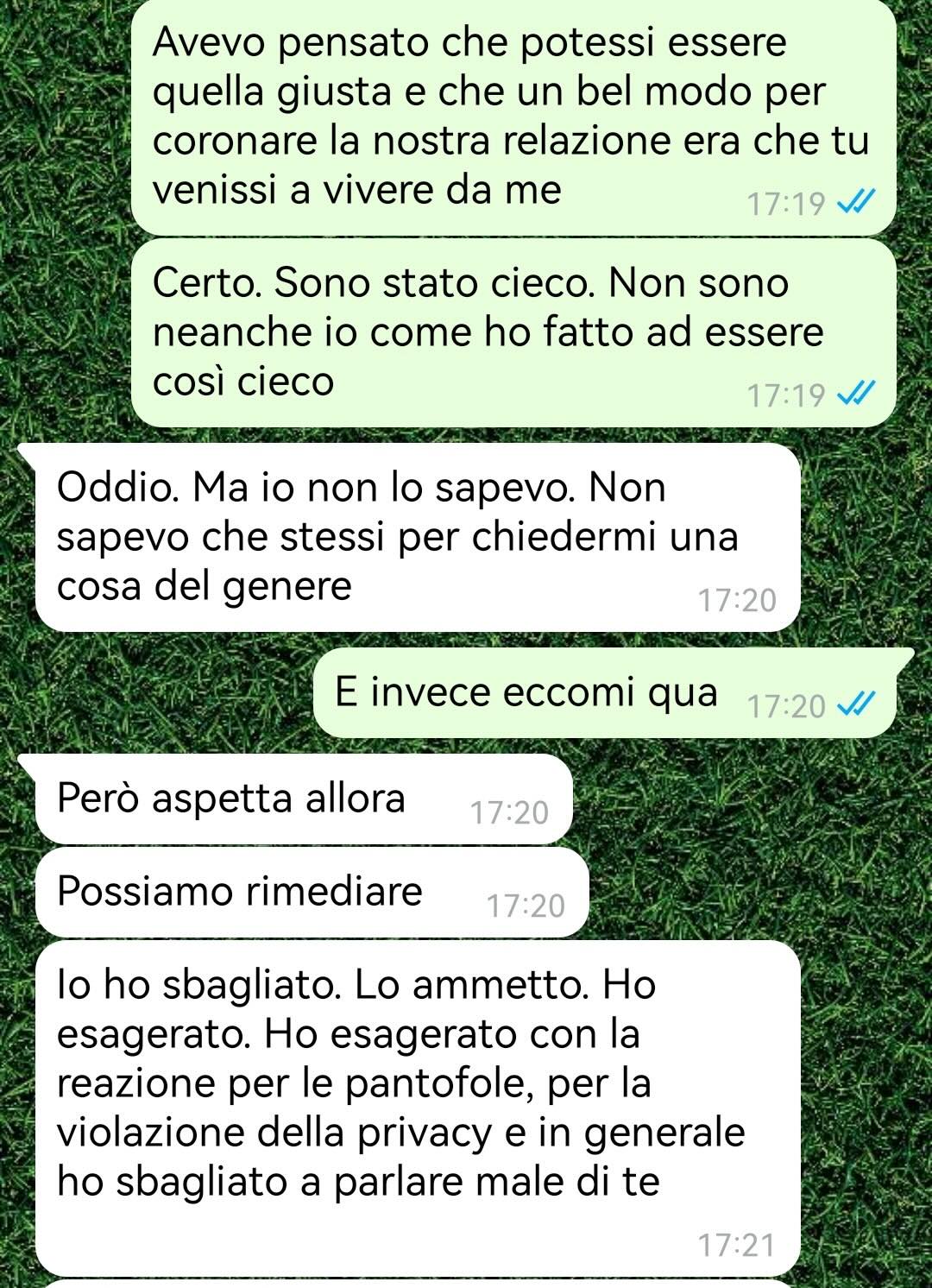 Il nostro follower ha raccontato di aver posizionato le pantofole in camera di Marianna in modo che le ritrovasse al suo ritorno, immaginando che questo piccolo gesto potesse rappresentare un inizio di un piano più ampio con cui dichiarare in modo chiaro i suoi sentimenti. Il nostro fan spiega che, nella sua intenzione, quello sarebbe dovuto essere solo il primo passo di un momento speciale, che avrebbe dovuto rafforzare il loro legame e farle capire quanto fosse importante per lui.