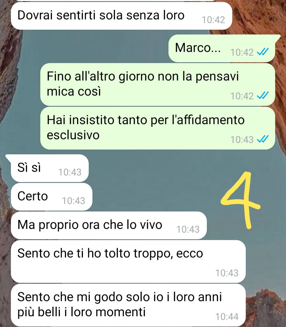 Mi chiamo Elena e sono fresca di separazione da Marco, un ex marito che non mi manca per niente. È proprio vero che le persone non si finiscono mai di conoscere. Se quando mi sono sposata e ho messo su famiglia con lui qualcuno mi avesse detto di cosa era capace…gli avrei dato del pazzo! Purtroppo, come avrete intuito, la nostra separazione è stata burrascosa e in fase di definizione dell’’affido dei nostri due figli lui ha fatto letteralmente di tutto per farmi passare come una pessima madre. Al punto che ha raccolto prove falsificandole o mostrando ciò che non era veramente…pur di mettermi in cattiva luce e chiedere l’affido esclusivo. È difficile che venga concesso in Italia, si tenta sempre di affidare i figli alla mamma a meno che non ci siano situazioni strane… cosa che vi assicuro non era il mio caso. Eppure lui ci è riuscito, comprandosi i nostri bambini a suon di giochi ed esperienze pazzesche e così da due settimane io mi ritrovo sola a casa senza i miei bambini…fino a quando l’altro giorno non ricevo il suo messaggio…ed ecco cosa vengo a scoprire…