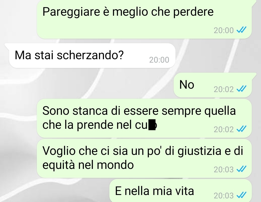 Per la nostra follower, giustizia ed equità sono principi imprescindibili. Racconta infatti di aver vissuto un’esperienza spiacevole, che riconosce di essersi in parte meritata, senza cercare giustificazioni o attenuanti. Tuttavia, ciò che le risulta difficile accettare è il fatto che solo lei stia affrontando le conseguenze, mentre l’altra persona, pur avendo condiviso con lei responsabilità e rischi, sembra uscire indenne dalla situazione.