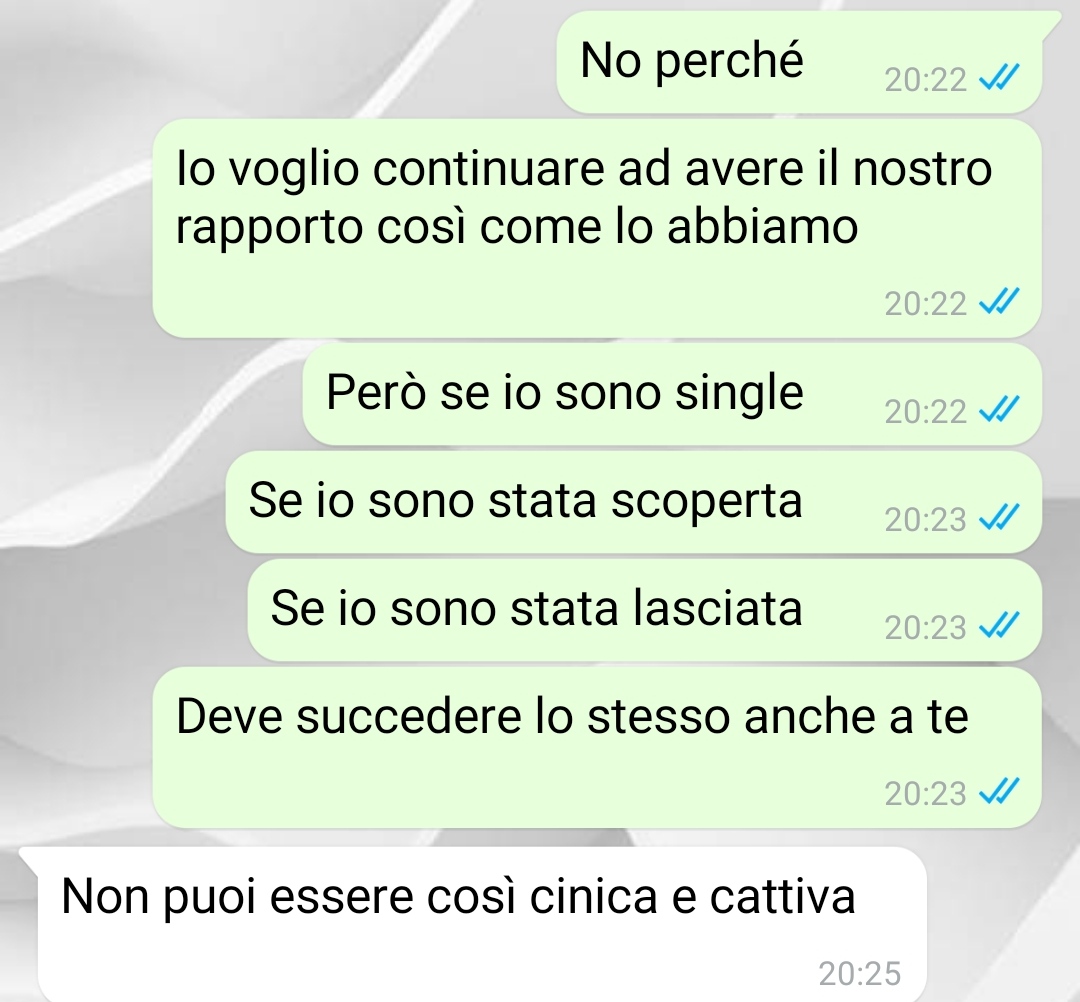 Secondo la nostra amica, è ingiusto che uno solo paghi per errori commessi in due. Sottolinea con forza come nella vita, quando si affrontano certe scelte insieme, anche le conseguenze dovrebbero essere condivise. Si domanda quindi perché debba essere lei l’unica a sopportare il peso di quanto accaduto, mentre l’altro, a suo dire, riesce a cavarsela salvando capra e cavoli.