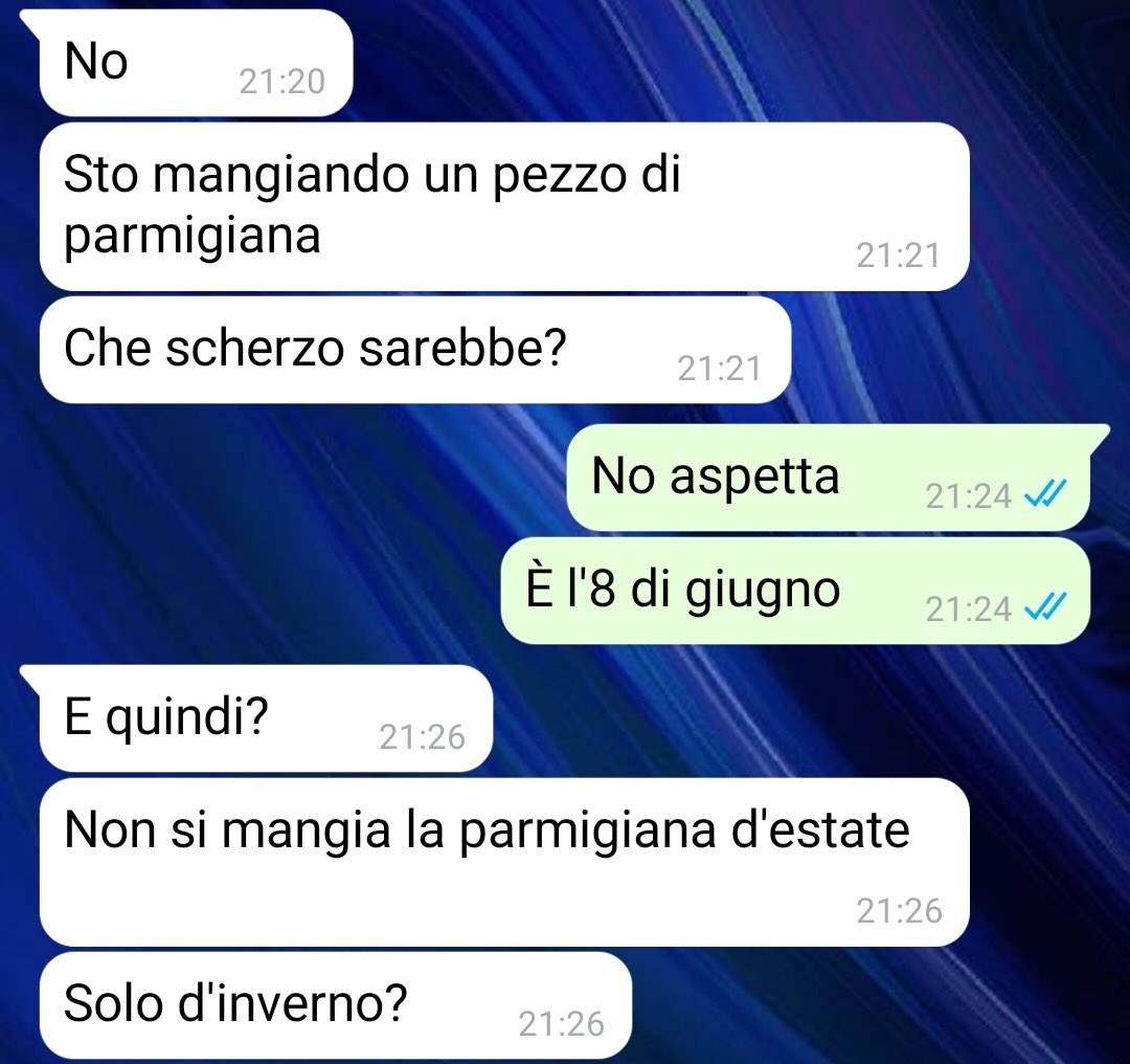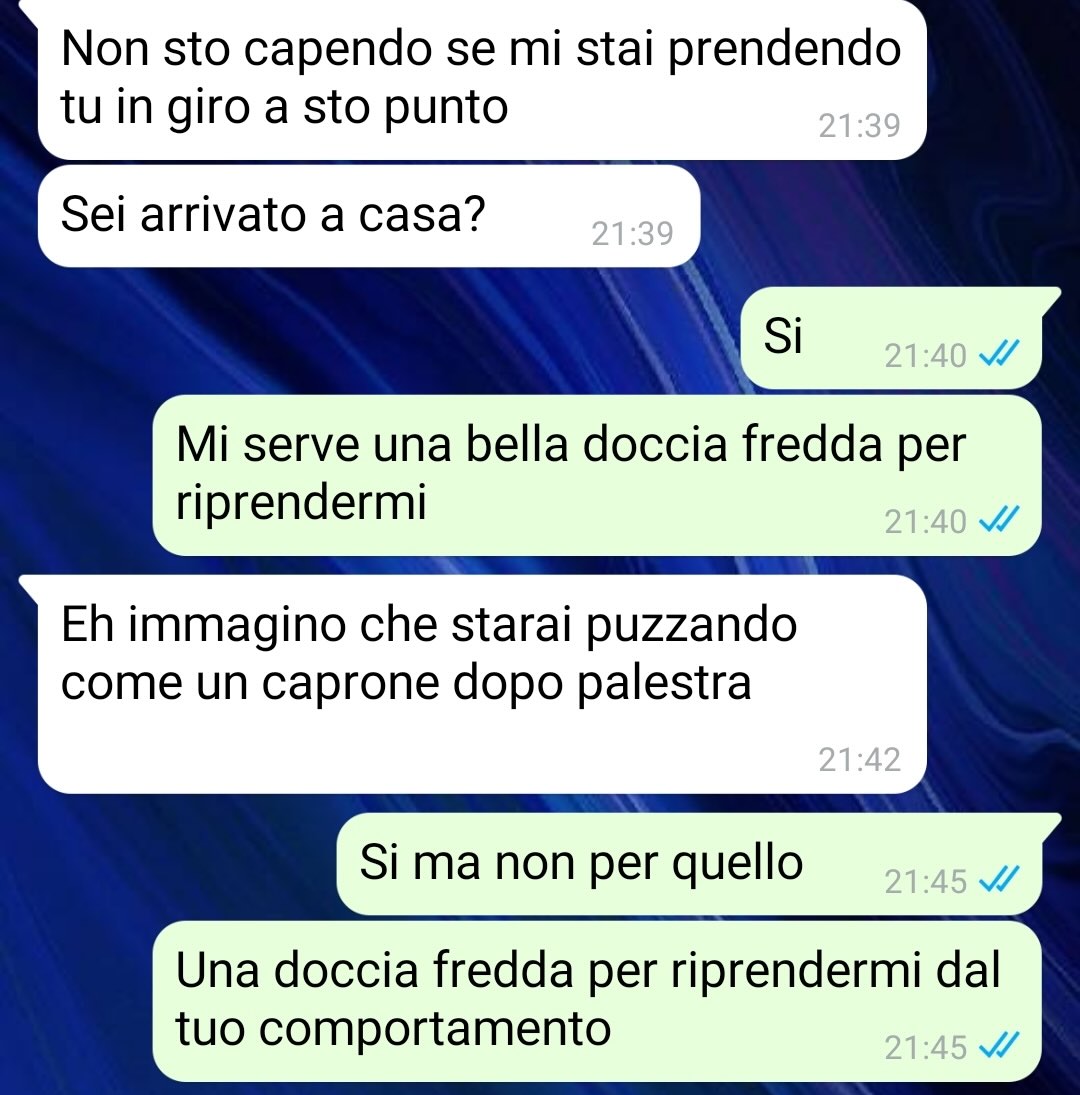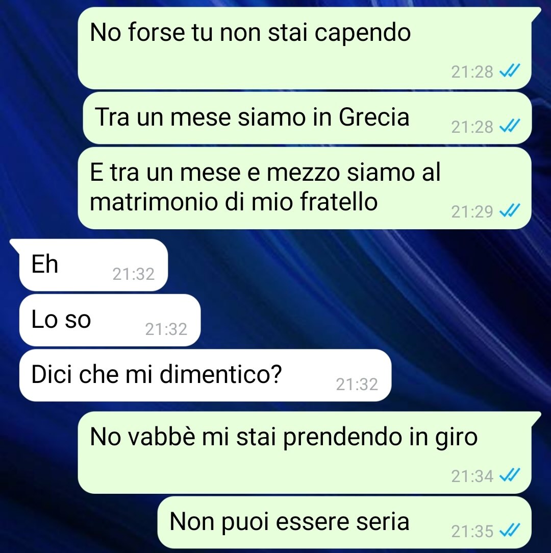 “Vi scrivo perché questaconversazione, questo litigio, che è culminato come è culminato, conla mia ragazza, credo che possa essere veramente uno dei punti piùbassi che una persona ha toccato nei miei confronti, spero di nonavere mai più a che fare con persone di questo tipo, ma andiamo conordine. Io quando mi fidanzo do tutto me stesso, m’impegno per farstare il meglio possibile la persona con cui sto e non deludere le sueaspettative, e mi aspetto che sia lo stesso anche dall’altra parte,dovrebbe essere la normalità, giusto? Ecco, così però non è stato. Leisapeva bene quanto fosse importante per me quella vacanza, e sapevaanche quanto sia importante per me il matrimonio di mio fratello equanto sia importante per me fare bella figura in quell’occasione coni miei famigliari. Ma lei nulla, a lei non interessa, per lei è soloimportante mangiare la parmigiana a cena, dando la colpa al lavoro eallo stile di vita. Quando poi ha iniziato ad inveire contro miamamma, ho capito che dovevo chiudere in quel momento.”