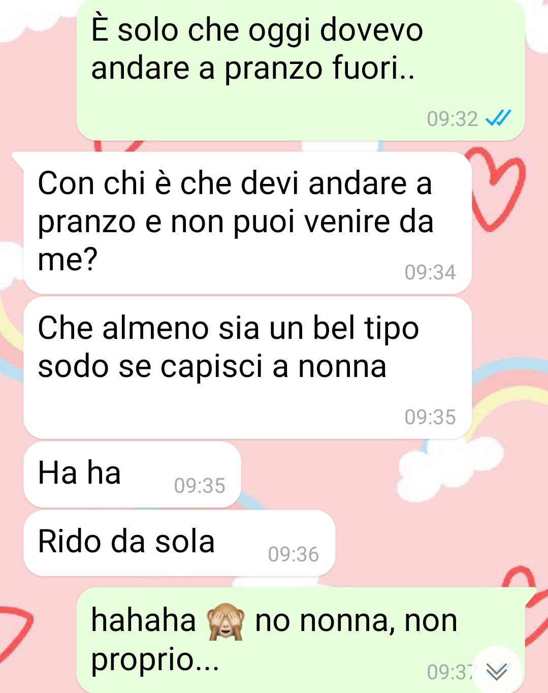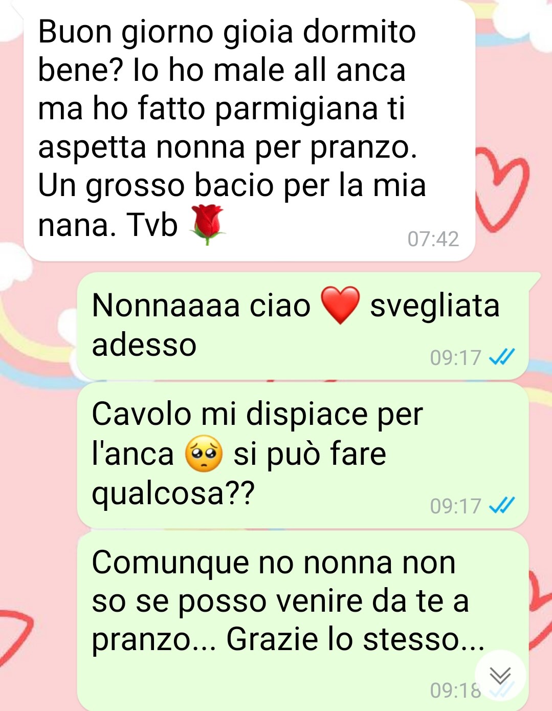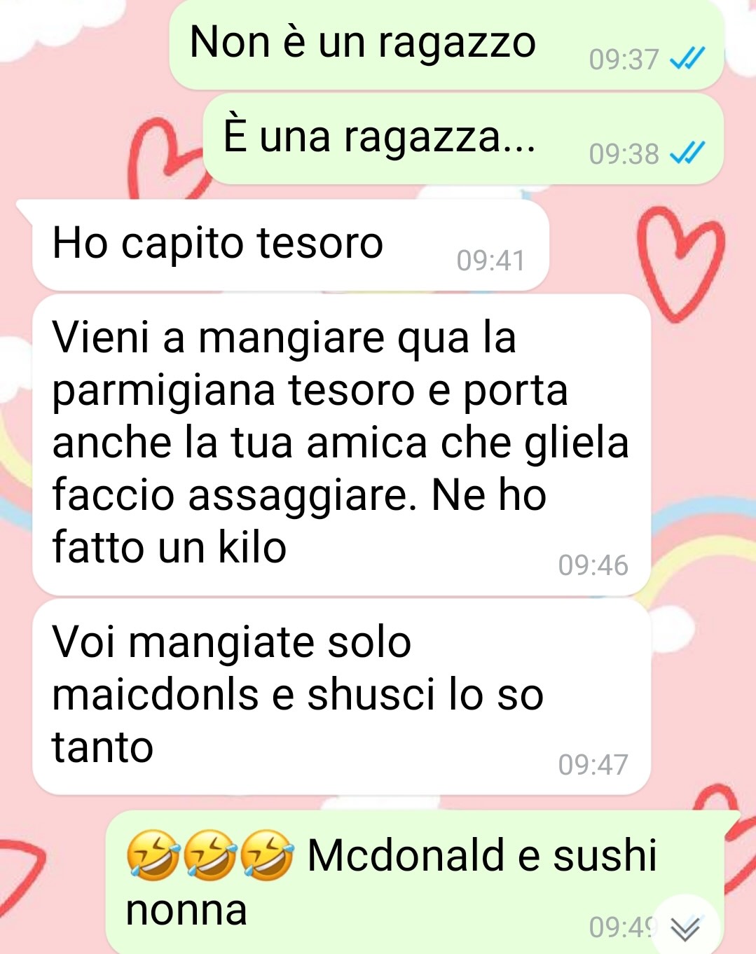 Il mio nome è Benedetta, per gli amici Benny, per mia nonna “gioia”, “tesoro”, “nana” ecc. Amo mia nonna, è la persona più importante per me nella mia famiglia, perché con i miei genitori non vado molto d’accordo . Va beh. Non è questo il punto. Fin da piccola ho avuto atteggiamenti “strani” per una bambina, mi piaceva giocare con gli amici di mio fratello, mi piaceva guardare Dragon ball e altri cartoni da maschio , odiavo le treccine e altre cose che non sto qui a elencarvi sennò vi scrivo un papiro. Crescendo non ho mai preso consapevolezza di me stessa e della mia personalità, infatti ho sempre fatto difficoltà a relazionarmi con gli altri sia sentimentalmente parlando sia in amicizia. Quindi per me è iniziato un lung o periodo di crisi interiore e solo qualche mese fa sono giunta ad una conclusione e ad avere una risposta alle mie domande. Ne ho parlato poi con i miei e la mia famiglia, mancava solo più mia nonna. Si sa che con i nonni è sempre più difficile affrontare certi discorsi perché hanno una mentalità diversa e infatti faccia a faccia non le ho mai parlato di questa cosa . L’altro giorno l’ho fatto, quindi eccovi qui la conversazione, vi mostro come è andata…