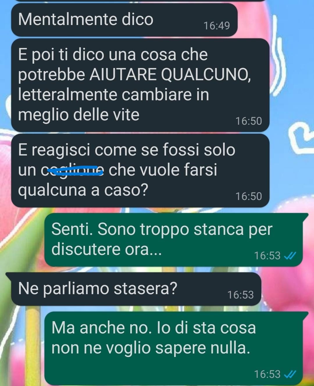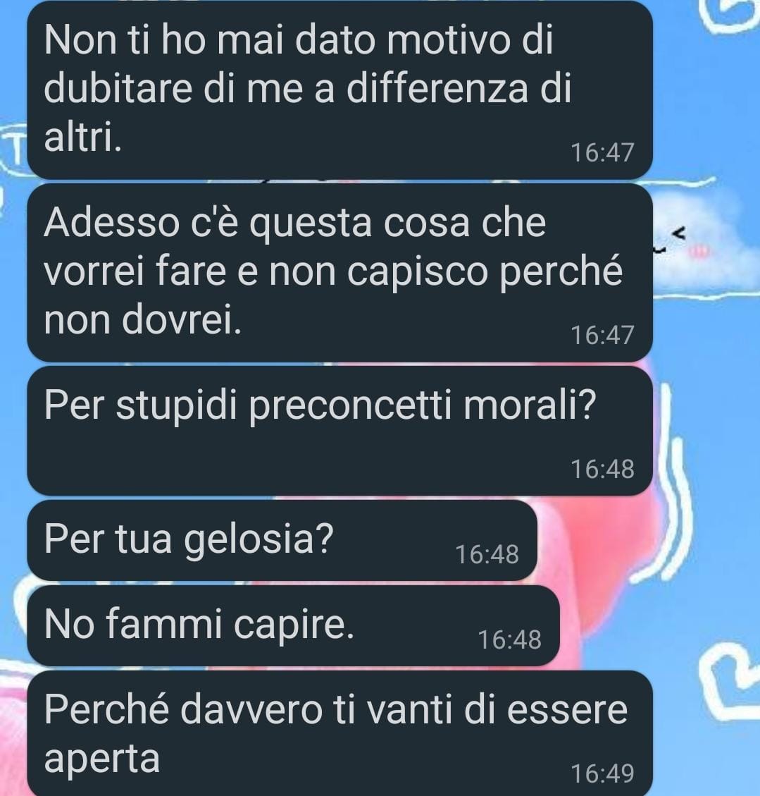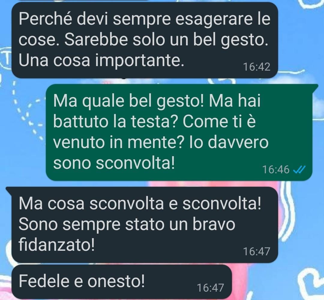 Conclude spiegando che la relazione ora è appesa a un filo e che deve trovare la forza di affrontare la questione, perché non può fingere che non sia successo nulla. Anche se non sa ancora quale decisione prendere, una cosa è certa: dopo la richiesta ricevuta da Cristian, nulla potrà più essere come prima.