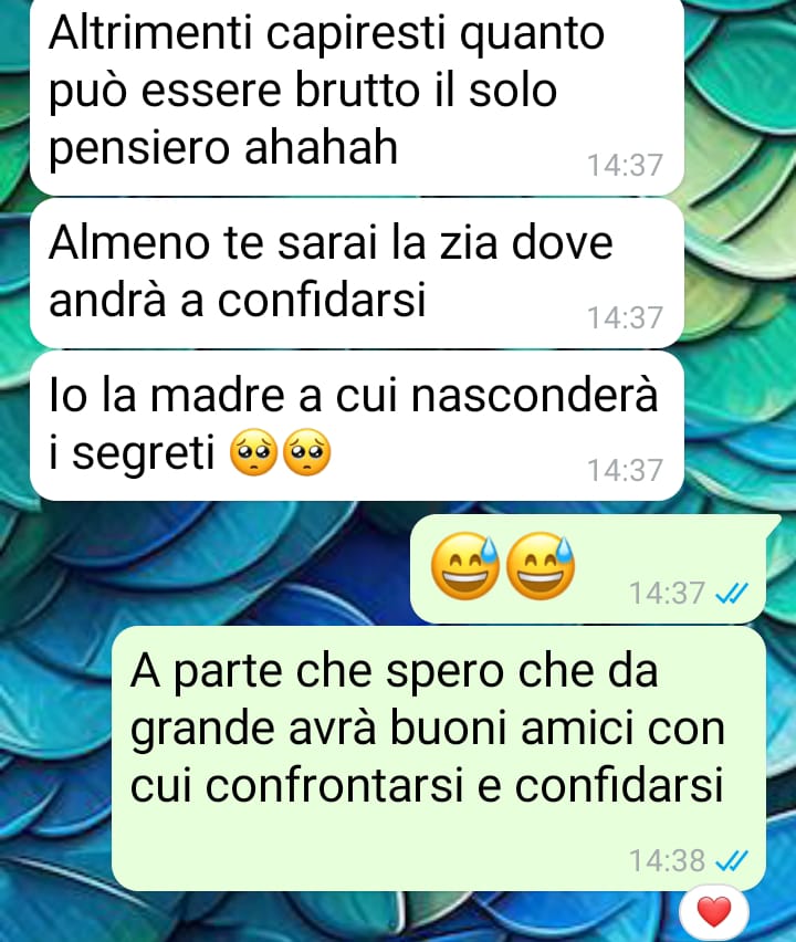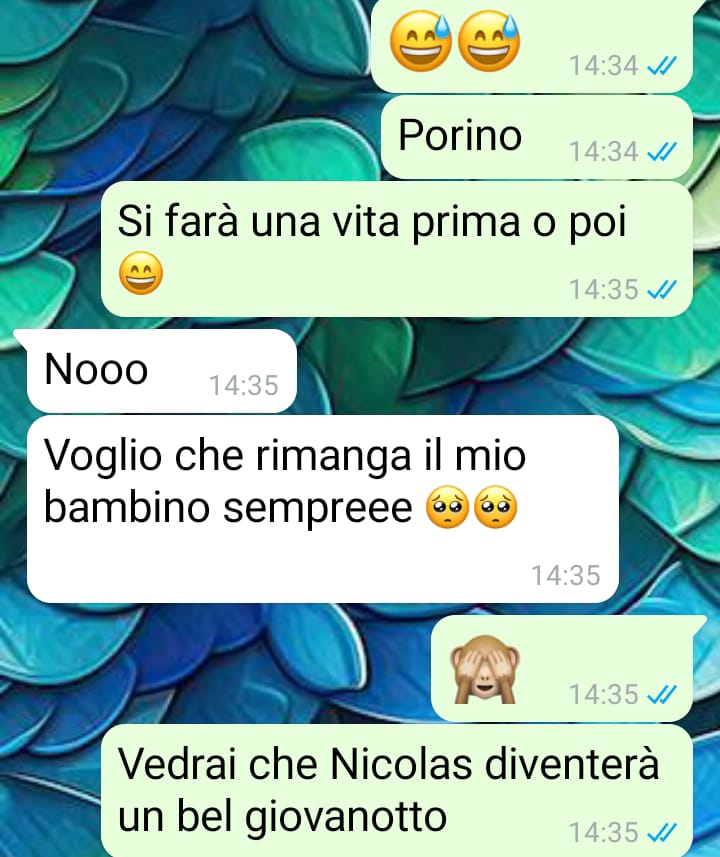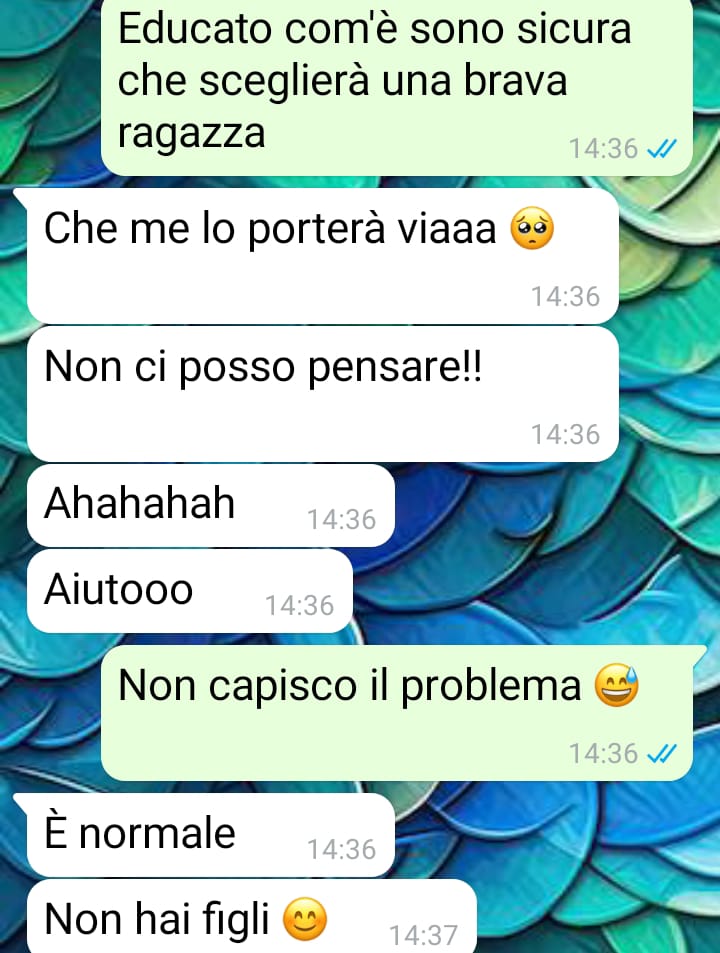 Buongiorno, ho una chat che vorrei farvi leggere perché io sono almeno due giorni che la rileggo a ruota e continuo a non capire, a essere sia stupita che indignata, oltre che delusa e sconcertata. Insomma, non so che diavolo pensare. È l’ultima conversazione che ho avuto con una mia amica/ex collega che ho conosciuto 4 anni fa. Lei non ha mai avuto particolari amicizie, forse perché quando suo figlio Nicolas è nato si è chiusa molto in casa. Ecco perché nell’anno in cui abbiamo lavorato insieme si è molto “legata” a me, come se fossi la sua amica di sempre. Si confida con me in tutto e mi considera addirittura una zia per il figlio che ora ha 6 anni. Io ovviamente voglio molto bene a tutti loro, ma certe volte trovo che lei sia un po’ esagerata nel vivere le cose della vita con ansia. Ecco perché quando mi ha inviato un’immagine presa da internet ho subito cercato di farle capire il mio pensiero. Beh, questo è quanto è venuto fuori e la cosa che mi spaventa di più non è tanto la mancanza di superficialità con cui si è rivolta a me, ma il pensiero che in fin dei conti là fuori sia pieno di mamme che ragionano così.