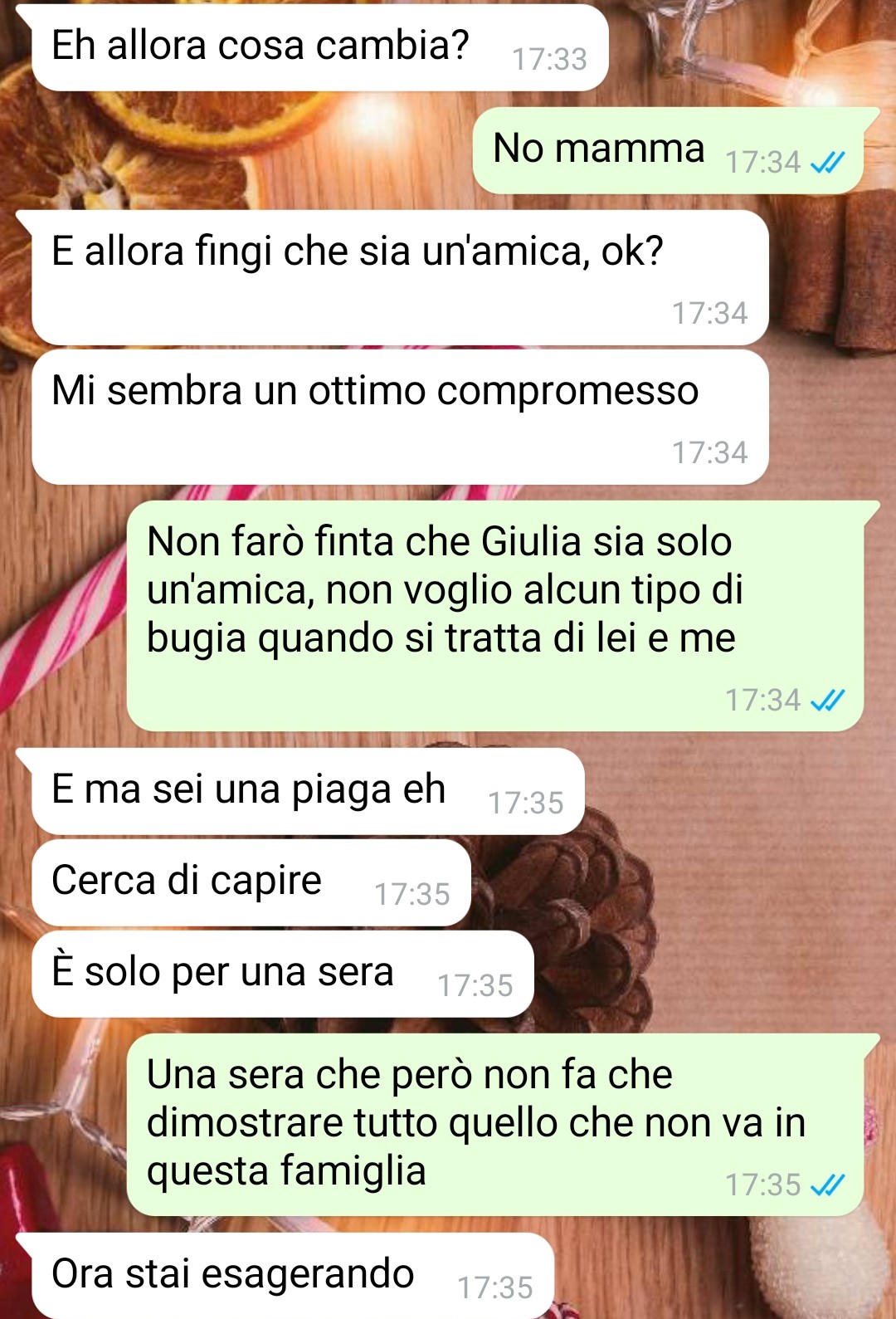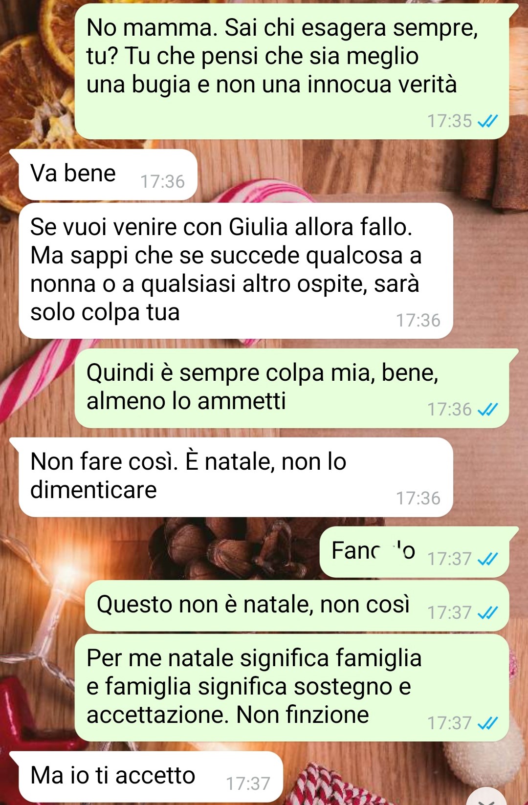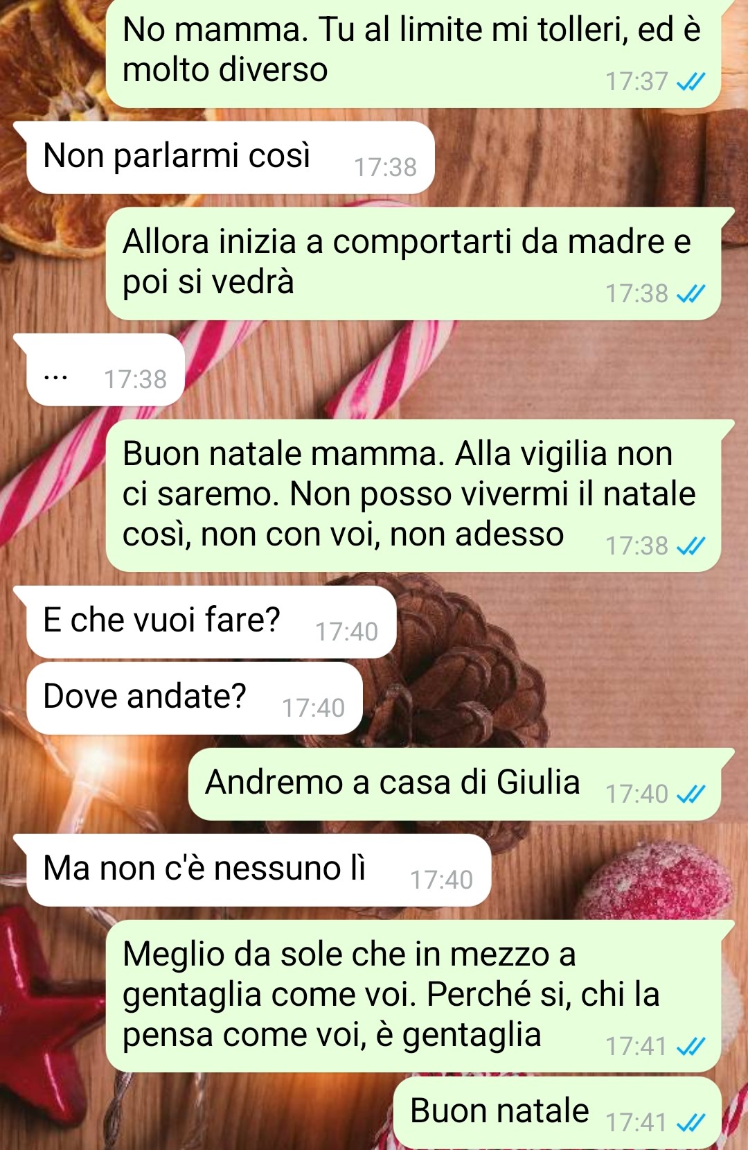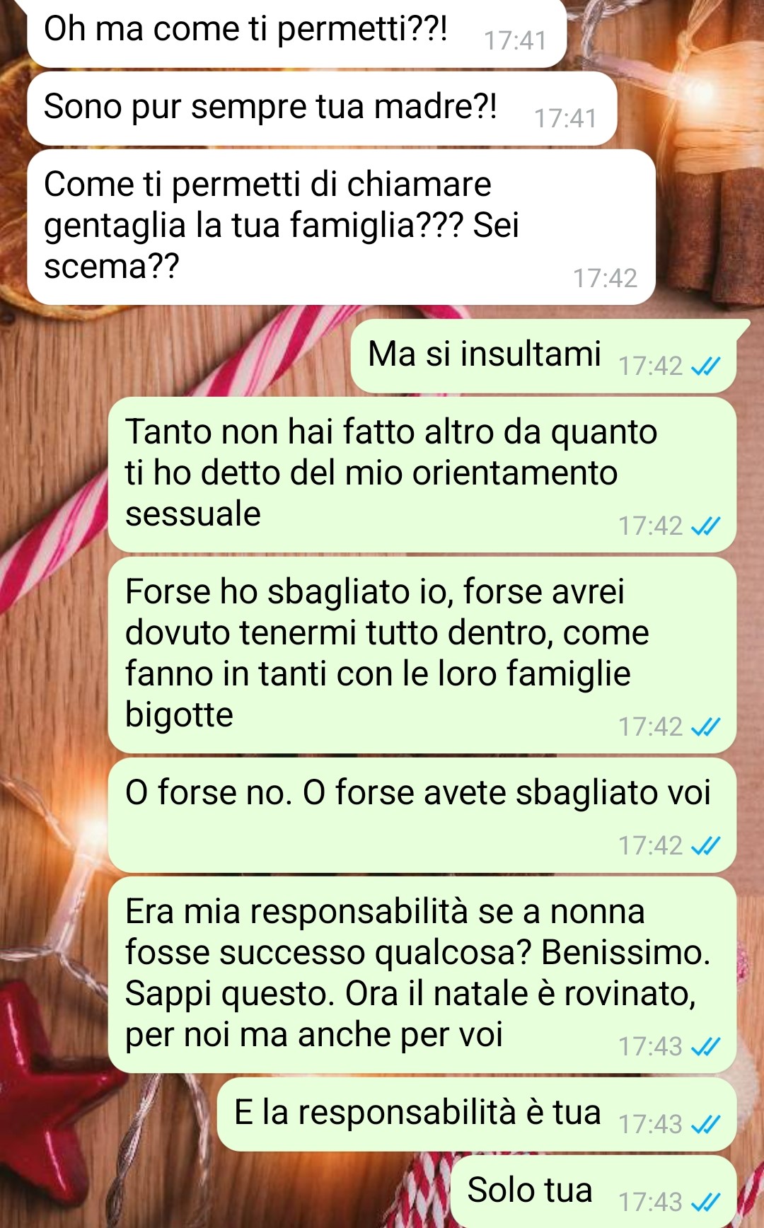 Nella famiglia della nostra amica, solo poche persone sono a conoscenza della sua relazione: un paio di cugini che hanno reagito con tranquillità e sua madre, che rappresenta il suo unico genitore. Inizialmente la madre aveva preso molto male la notizia dell’orientamento sessuale della figlia, ma col tempo sembrava aver imparato ad accettarla, almeno apparentemente. Tuttavia, la follower riflette sul fatto che certe mentalità non cambiano mai veramente. Poco prima della vigilia di Natale, la situazione è precipitata quando la madre le ha inviato un messaggio dicendo che dovevano parlare urgentemente di quella sera, specificando che la questione riguardava Giulia. Per la nostra fan, quel momento ha rappresentato l’inizio della fine.