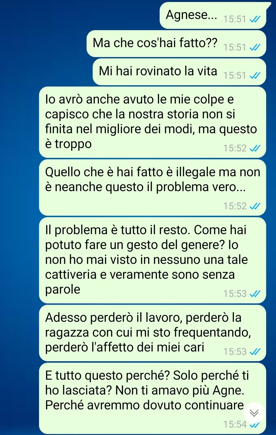 Mentre vi sto scrivendo, il mio prossimo futuro è appeso ad un filo, anche se forse sto trovando alcune soluzioni per uscire da questa situazione, una situazione a dir poco tragica e nella quale vi auguro fortemente di non trovarvi mai. So che è un argomento molto delicato, ma proprio per la sua profonda riservatezza mi era impossibile parlarne apertamente con qualcuno (se non con pochissimi stretti) e quindi in questo modo, seppur anonimo, spero di trovare un po’ di conforto. Mi chiamo Nicolas e sono stato per più di due anni con Agnese, una ragazza con un cui ho vissuto una storia d’amore piuttosto intensa. Alcuni mesi fa, però, il mio amore verso di lei si è spento e, già in un momento di crisi di coppia, ho finito col tradirla. Me ne pento ogni giorno e non cerco giustificazioni. Fatto sta che dopo l’ho immediatamente lasciata dato che non l’amavo più e non aveva alcun senso, anche per rispetto nei suoi confronti, portare avanti la relazione. Lei non l’ha presa per niente bene e si è ossessionata con me, fino a che non è arrivata ad attuare nei miei confronti quella che lei ha definito una piccola punizione…