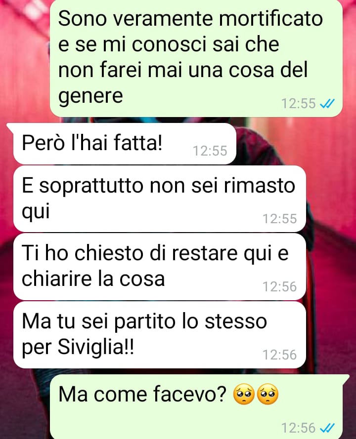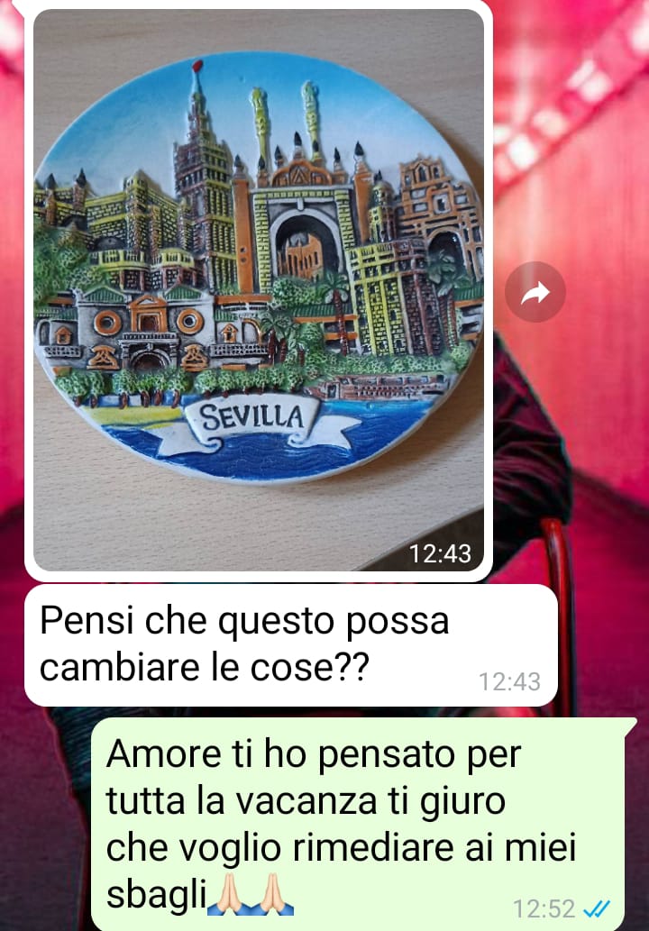 vi scrivo perché sono sull’orlo della fine della mia relazione, dopo ben quattro anni e mezzo e con la donna che io amo. Prima di partire per una vacanza con i miei amici di una vita, è successa una cosa, un errore, una enorme incomprensione, e ora lei non vuole più avere nulla a che fare con me. La prima cosa che ho fatto una volta tornato è stata farle avere un piccolo souvenir che avevo preso per lei, con la speranza che potesse calmarsi e darmi la possibilità di spiegare come sono davvero andate le cose, come avevo cercato di fare anche in vacanza mandandole continuamente dei messaggi, ai quali lei non ha mai risposto. Nonostante il pensierino non abbia sortito l’effetto desiderato, lei è comunque tornata a scrivermi e finalmente ho potuto avere un vero confronto sulla faccenda. Il problema? Come potrete leggere lei ora mi chiede determinate cose che se non seguirò alla lettera determineranno la fine della nostra relazione. Trovo molto ingiusto quello che mi sta chiedendo e mi affido a voi per capire se forse quella che sta ingigantendo la situazione sia lei.