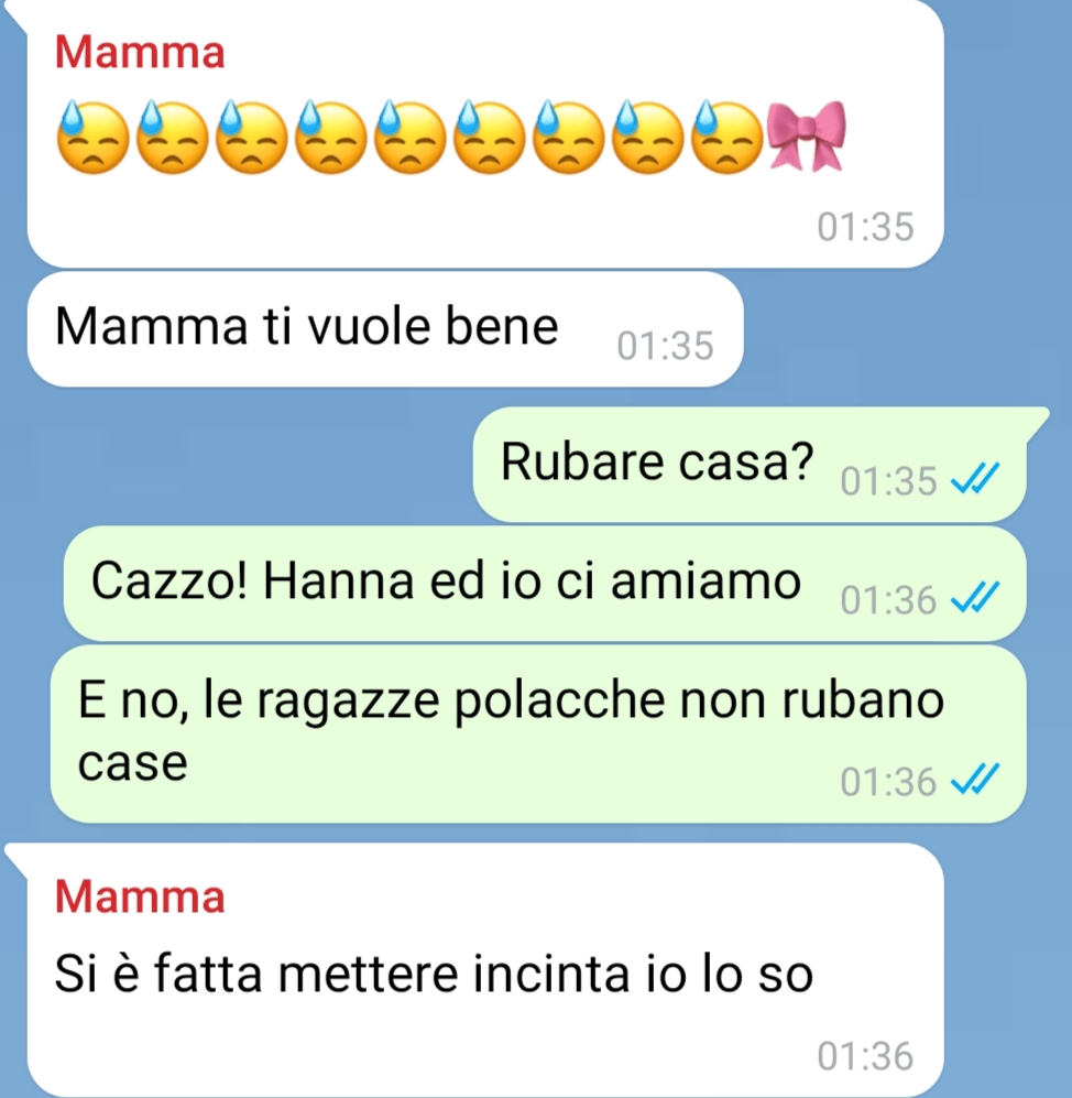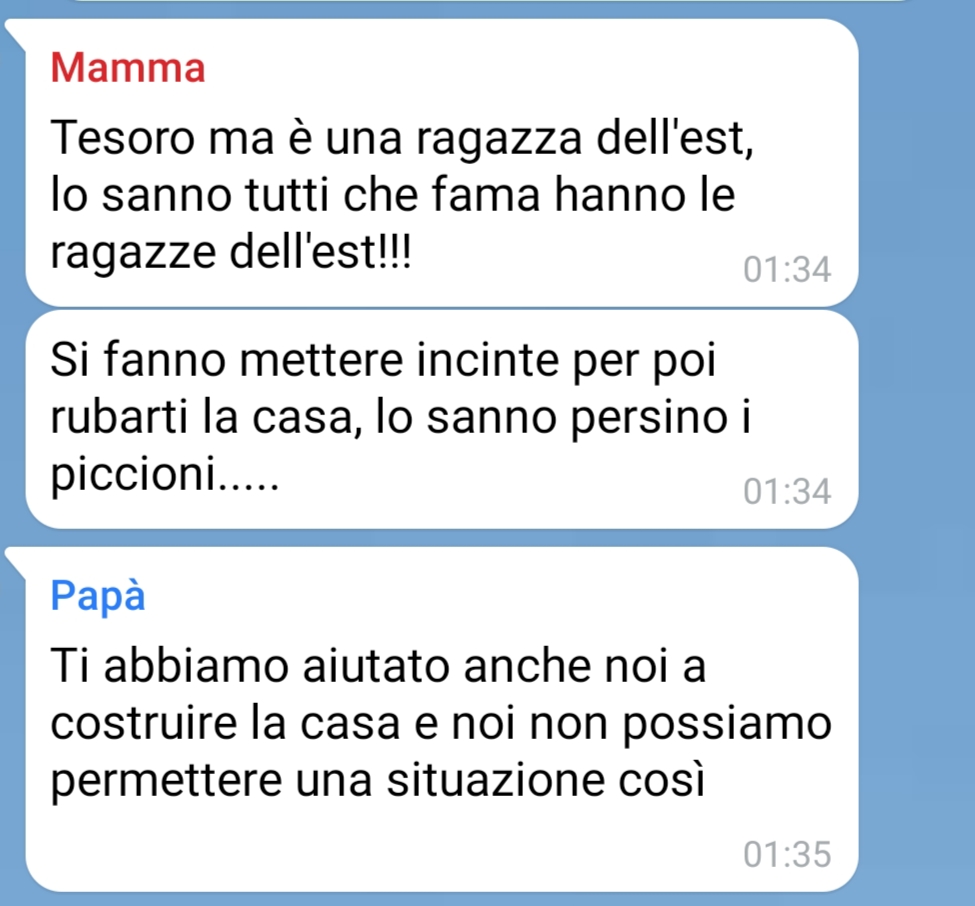 Ciao a tutti, vi scrivo per raccontarvi la mia storia che purtroppo di bello ha ben poco. Mi sono follemente innamorato di una ragazza polacca, e presto ci sposeremo, dopo aver dato alla luce il nostro piccolo, desiderato e atteso tanto. Lei è una ragazza straordinaria, intelligente e molto semplice, però ai miei non va proprio giù il fatto che lei sia polacca: una ragazza dell’est. Viviamo in un’epoca piena di preconcetti, e questo mi rende triste, ai miei non importa che sia istruita, brava, abbia un bel lavoro ecc, a loro non va bene che non sia italiana. Tutto ciò mi rattrista e mi fa sentire ferito, perché io vorrei ricevere comprensione e apertura dai miei genitori e non ostilità. Però io devo proteggere la mia famiglia, quella attuale, quella nuova che ho creato…
