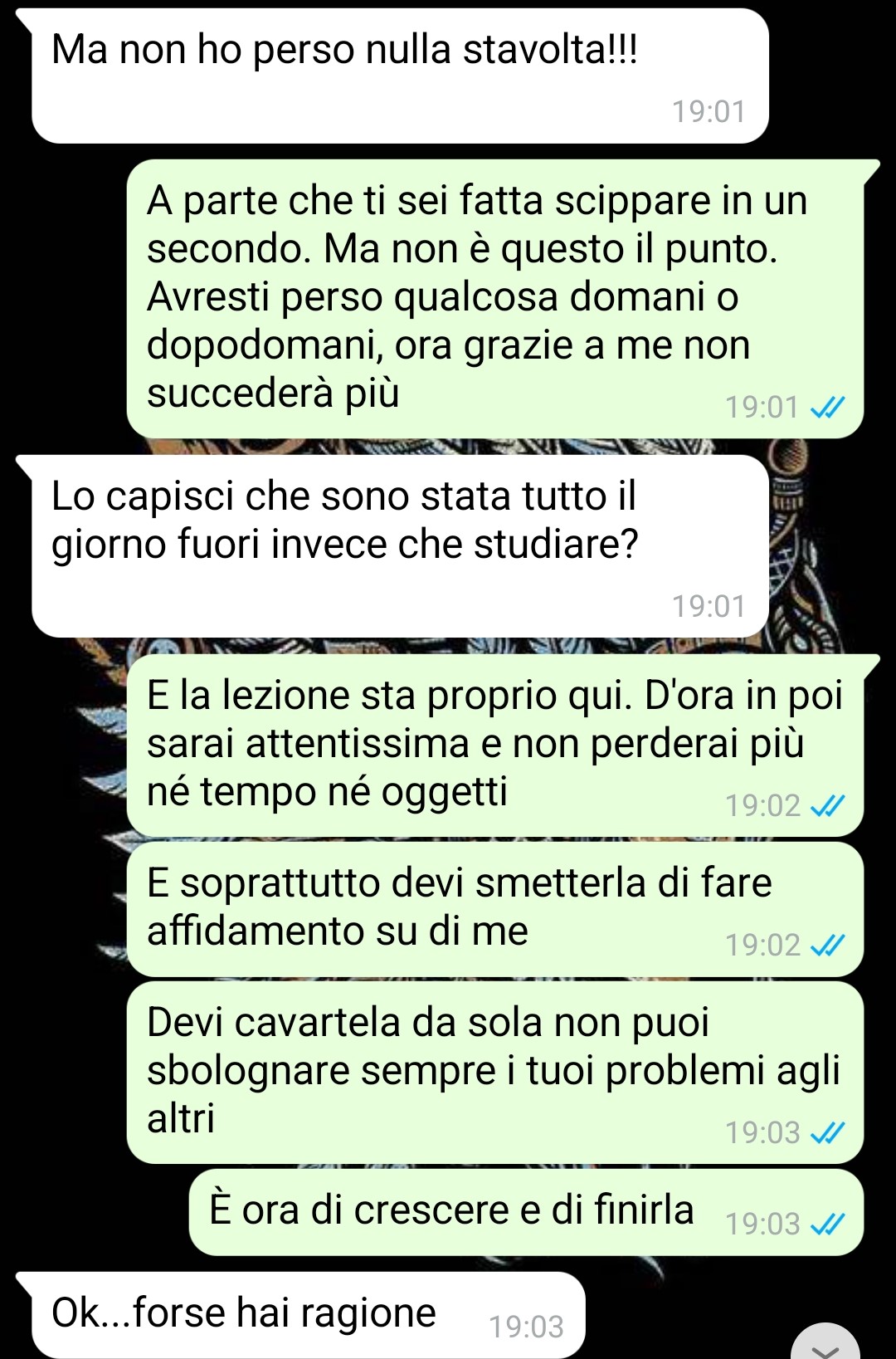 Secondo il nostro follower, è normale che in una coppia ci si sostenga a vicenda, ma ritiene che a una certa età ognuno debba assumersi la responsabilità delle proprie cose. Ciò che lo infastidisce maggiormente è la reazione della ragazza: ogni volta si agita e tende a prendere decisioni avventate, come denunciare immediatamente o coinvolgere terze parti senza prima verificare con calma.