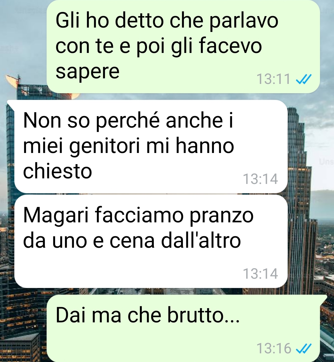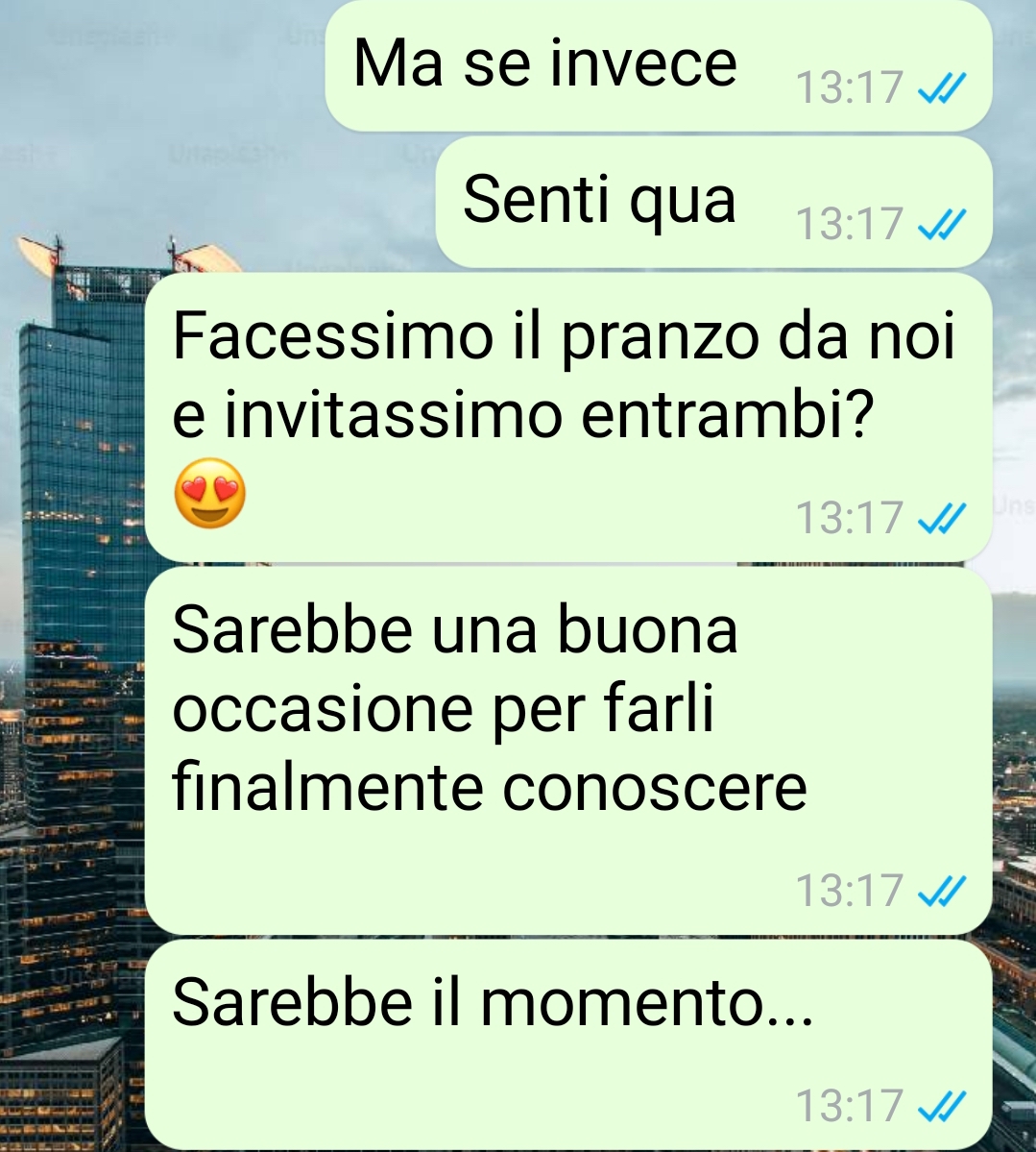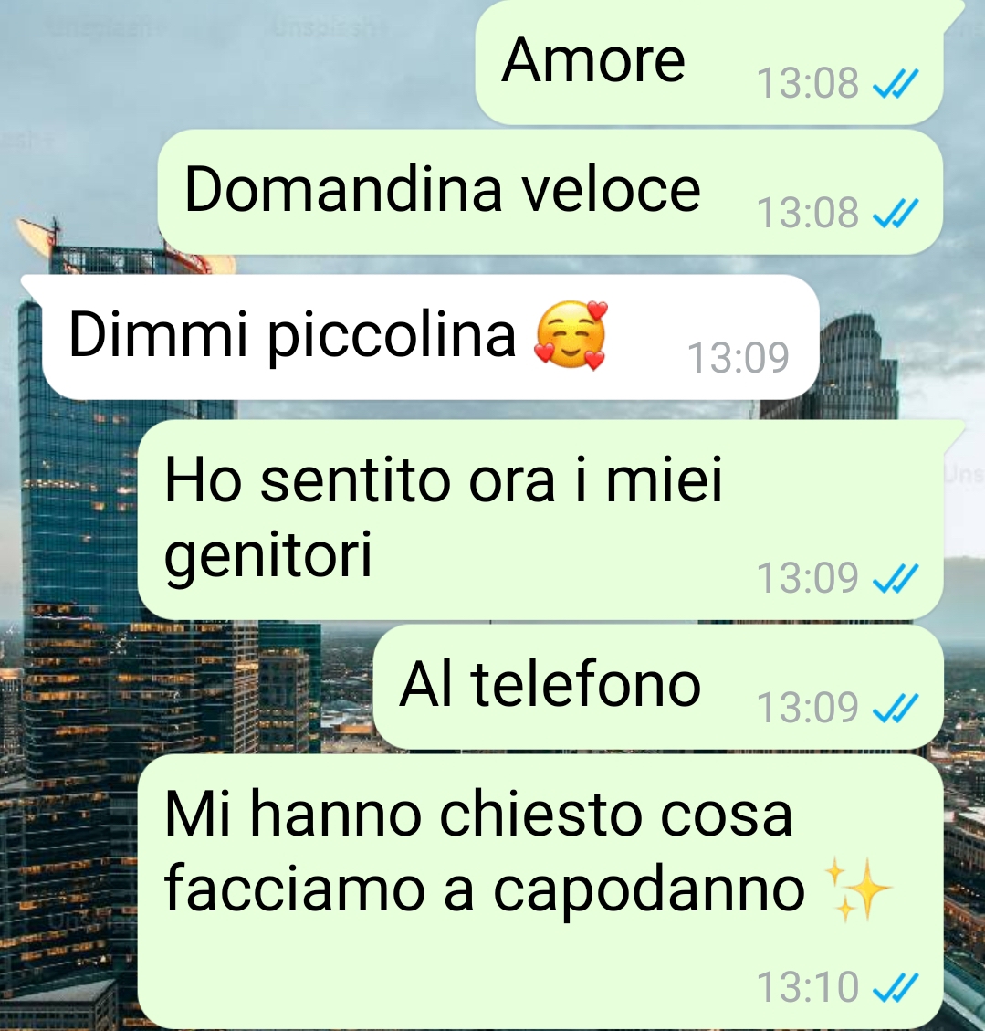 Mi chiamo Gabriella e sono fidanzata con Giulio da tre anni. Da un anno conviviamo e l’anno scorso abbiamo passato le feste il 24 sera dai miei, il 25 a pranzo dai suoi e il 26 di nuovo dai miei. Capodanno invece era la stessa storia: la sera di Capodanno con gli amici, a pranzo del primo da una parte e la cena dall’altra. Non abbiamo mai organizzato nulla tutti insieme, a prescindere dalle feste. Proprio in generale, non abbiamo mai organizzato nulla sia con i miei che con i suoi genitori insieme, quindi ho pensato che quest’anno, visto che è il secondo anno di convivenza, potessimo organizzare il pranzo del primo gennaio da noi e invitare tutte e due le famiglie.