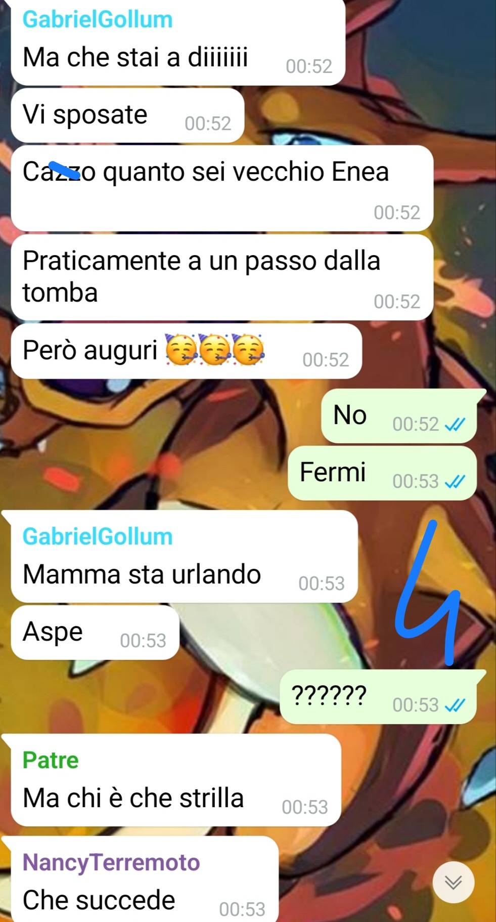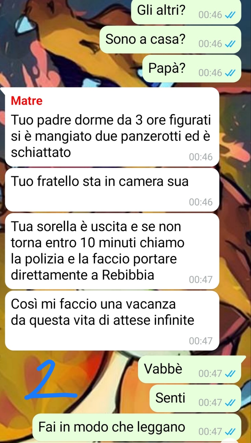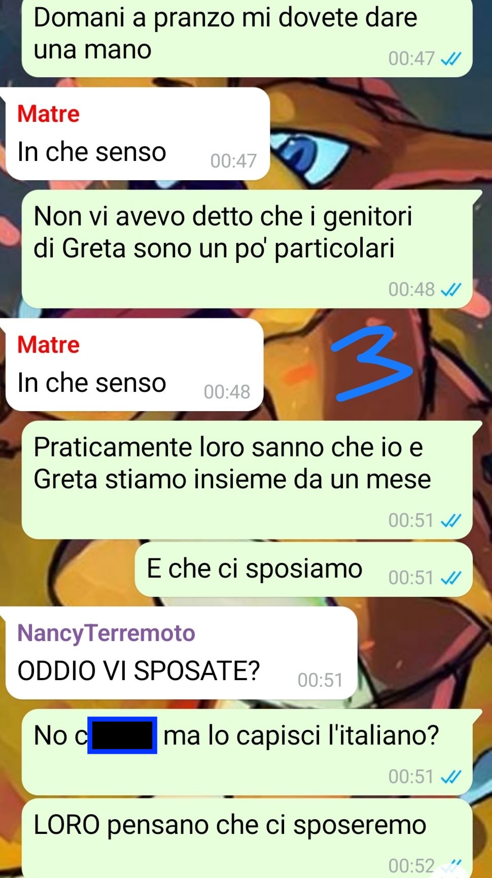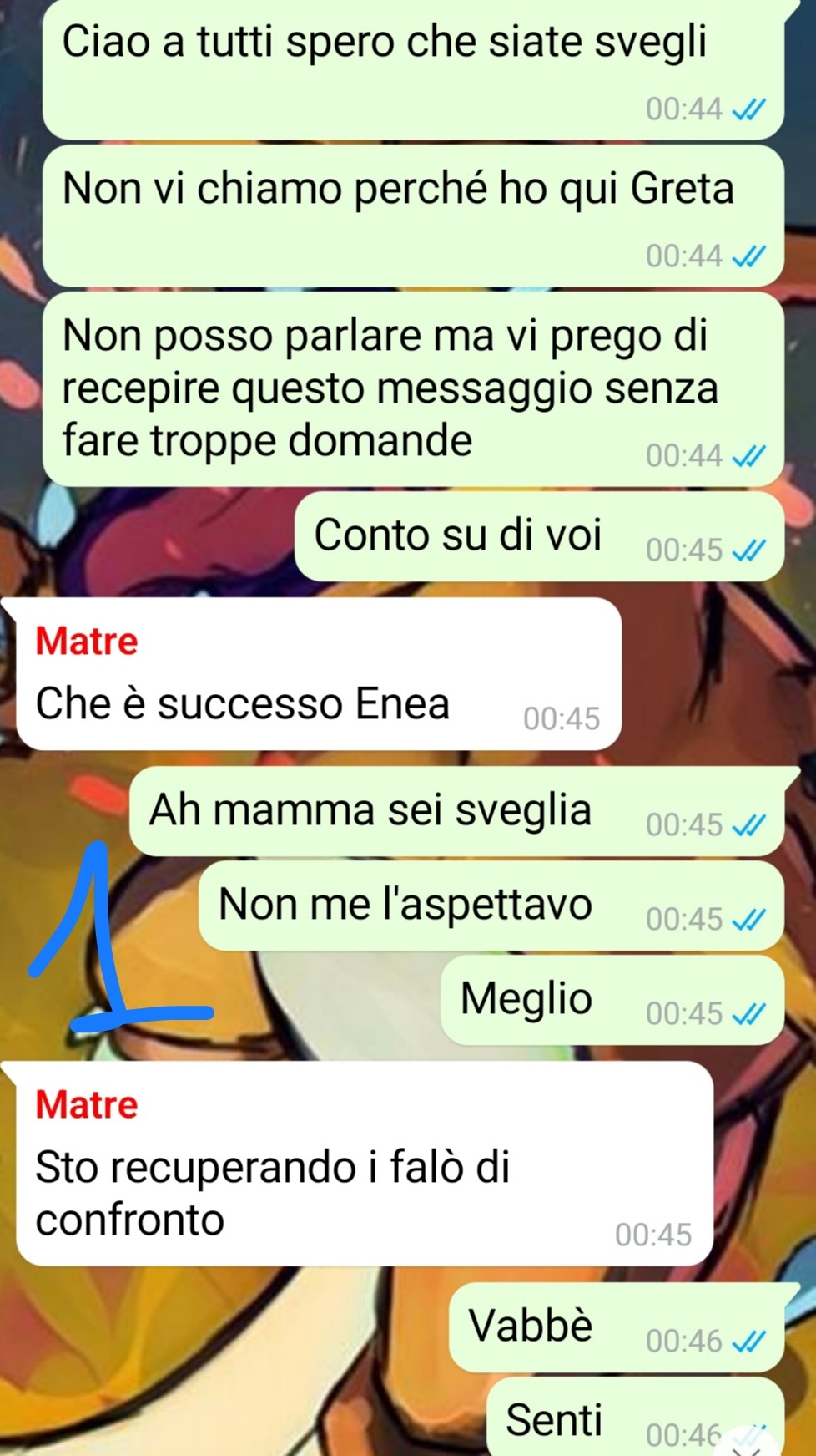 Mi chiamo Enea e vi mando questa conversazione perché nella mia famiglia è successo un casino enorme che adesso non so come risolvere. La situazione è lunga da spiegare ma proverò ad essere breve: la mia è una famiglia normale come tante altre, i miei fanno lavori normalissimi, ho un fratello e una sorella, entrambi più piccoli di me. I miei non sono credenti e noi non siamo battezzati. Ci hanno lasciato liberi di scegliere. Questa era la premessa…ora andiamo al dunque. Poco più di un anno fa ho conosciuto Greta, una ragazza bellissima, brillante e divertente. Mi sono innamorato all’istante. I suoi sono italiani ma abitano all’estero. Lei viveva con loro ma è in Italia per l’università. I suoi vengono a Roma ogni 6 mesi e la prima volta che sono venuti mentre eravamo già insieme, Greta ha preferito aspettare e non farmeli incontrare. 6 mesi dopo (cioè in questo periodo, nei giorni a cui risale la chat) era arrivato il momento di incontrarli. Ma non solo per me, per tutta la famiglia. Perché così avevano chiesto loro ( i genitori di Greta)…quindi abbiamo organizzato un pranzo. Purtroppo però c’erano alcune cose che Greta non mi aveva detto subito… e quando lo ha fatto io ho aspettato davvero l’ultimo momento per avvisare la mia famiglia prima del famoso pranzo…avevo bisogno di un grande sforzo da parte loro…