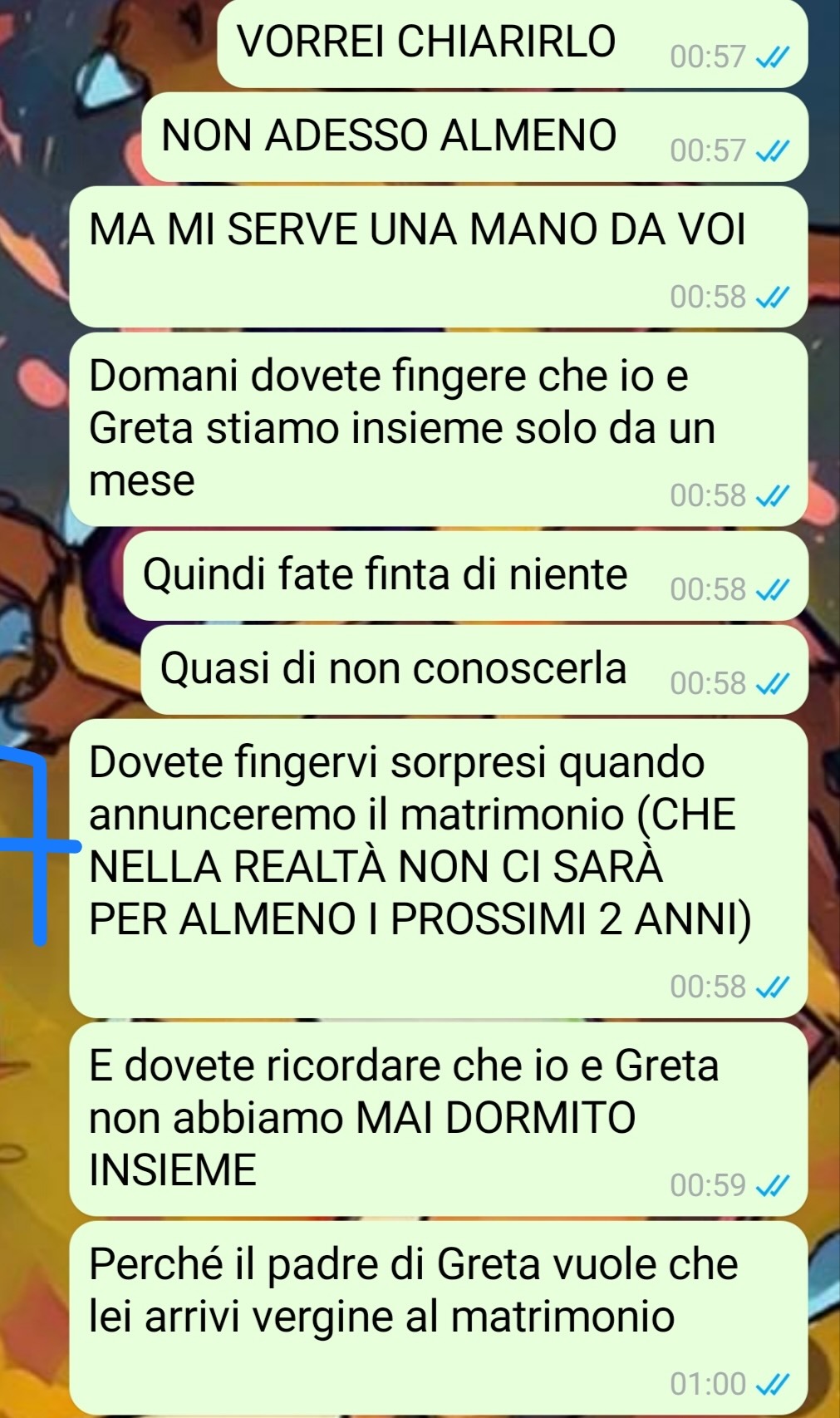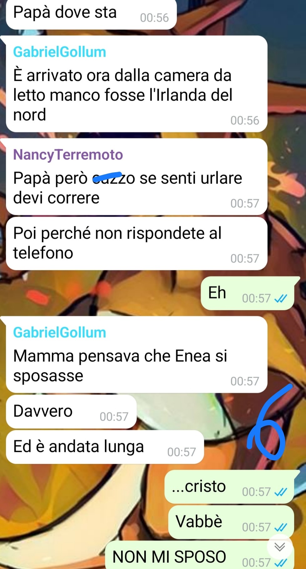 Il nostro fan, Enea, ha deciso di condividere una conversazione legata a un episodio familiare particolarmente complicato, che sta cercando di gestire ma che gli sta sfuggendo di mano. Racconta di provenire da una famiglia semplice, con genitori che svolgono lavori comuni e due fratelli più piccoli. In casa sua non si segue alcuna religione e nessuno è stato battezzato, una scelta consapevole dei genitori che hanno sempre voluto lasciare ai figli la libertà di decidere autonomamente su questi temi.