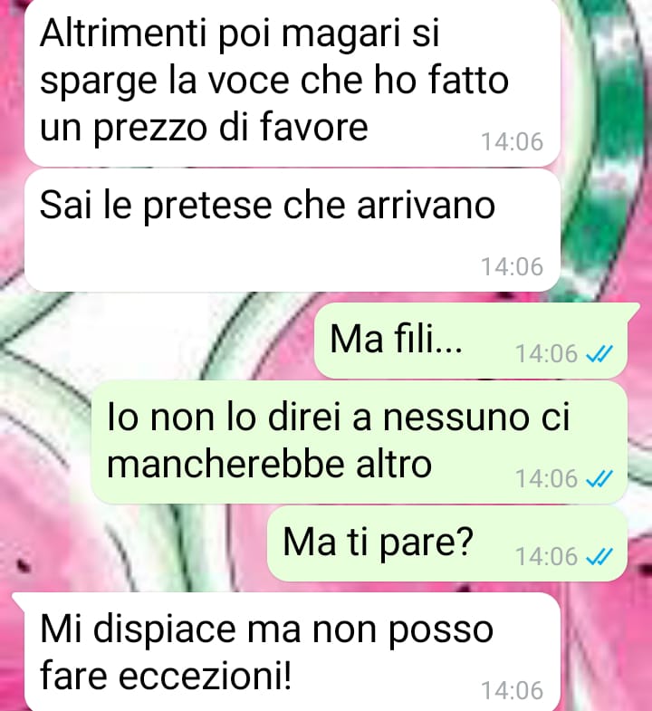 Attualmente vive con i genitori e la sorella minore, in una frazione fuori dal centro città. Proprio quest’ultima sta per compiere 18 anni, e la nostra follower desiderava organizzare per lei una festa memorabile. Con questo obiettivo, ha pensato di rivolgersi proprio a quel ragazzo, sperando – in virtù dell’amicizia che credeva di avere con lui – di ottenere un aiuto, magari sotto forma di un prezzo più accessibile o almeno ragionevole per il servizio richiesto.