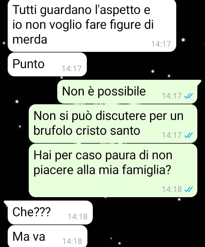 Il nostro fan spiega che ciò che gli fa più rabbia è il sospetto che dietro quel rifiuto non ci sia la sola volontà di prendersi una pausa, ma qualcosa di più profondo e inspiegabile, una sensazione rafforzata dopo aver letto le frasi che la sua ragazza ha usato nella conversazione. Crede che il comportamento abbia evidenziato una forma di maleducazione e un’autonomia emotiva così pronunciata da mettere in discussione i rapporti con lui e con la sua famiglia.