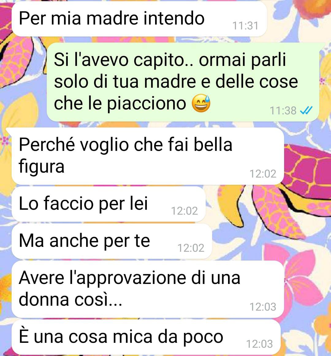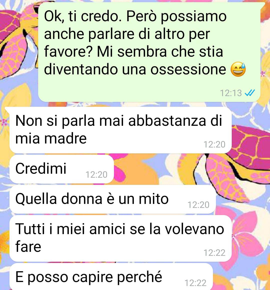 Mi chiamo Nina, e questo credo sia l’epilogo della mia relazione. Io ho 30 anni e lui 35. Conviviamo da poco, sei mesi. Abbiamo trovato, con molta fatica per questi tempi, una casa in affitto (cointestato), ma ricordo bene che prima di andare a convivere mi aveva fatto un discorso, su quanto lui fosse un uomo per cui il primo valore è la famiglia. Per me andava benissimo… anche io un giorno vorrei una famiglia mia. Però evidentemente non parlavamo la stessa lingua: non avevo capito alcune cose, che si sono chiarite poi “grazie” all’imminente arrivo della madre.L’amata mammina non vive nella nostra città, anche se lui le sta tentando tutte per convincerla a farlo. Lei è un avvocato (o avvocata se vi piace di più) e vive a Milano. Madre single, si è fatta un mazzo tanto per il figlio, per carità. Ma anche carattere parecchio aggressivo, buono per il lavoro (ha fatto una gran carriera), ma per le relazioni interpersonali un po’ meno secondo me. L’ho vista solo un paio di volte, ma l’ho sentita parlare al telefono (spesso) con il mio (quasi ex) ragazzo. Mi sembra che sia lievemente narcisista, ma chi sono io per dare diagnosi?Comunque, al di là delle eventuali storture della personalità, ci sono altre stranezze su cui ha tirato la corda, e a cui non ho voluto decisamente acconsentire.E lui si è incazzato per questo.