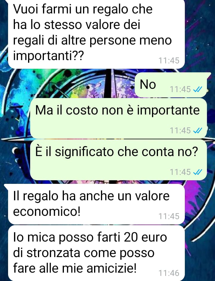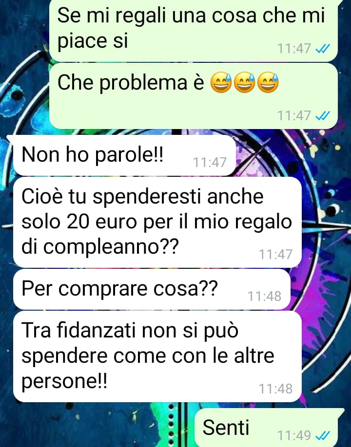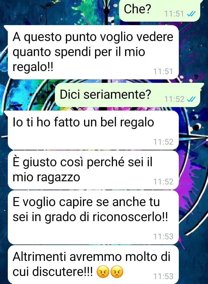 La reazione che ha avuto leggendo i messaggi lo ha spinto a mettere in discussione la persona con cui ha iniziato una relazione. Racconta di non aspettarsi un atteggiamento simile, soprattutto perché si tratta di una ricorrenza significativa, la prima che festeggiano insieme. Lo scambio di messaggi con la fidanzata è stato salvato e inviato a Commenti Memorabili, dove ha deciso di renderlo pubblico.