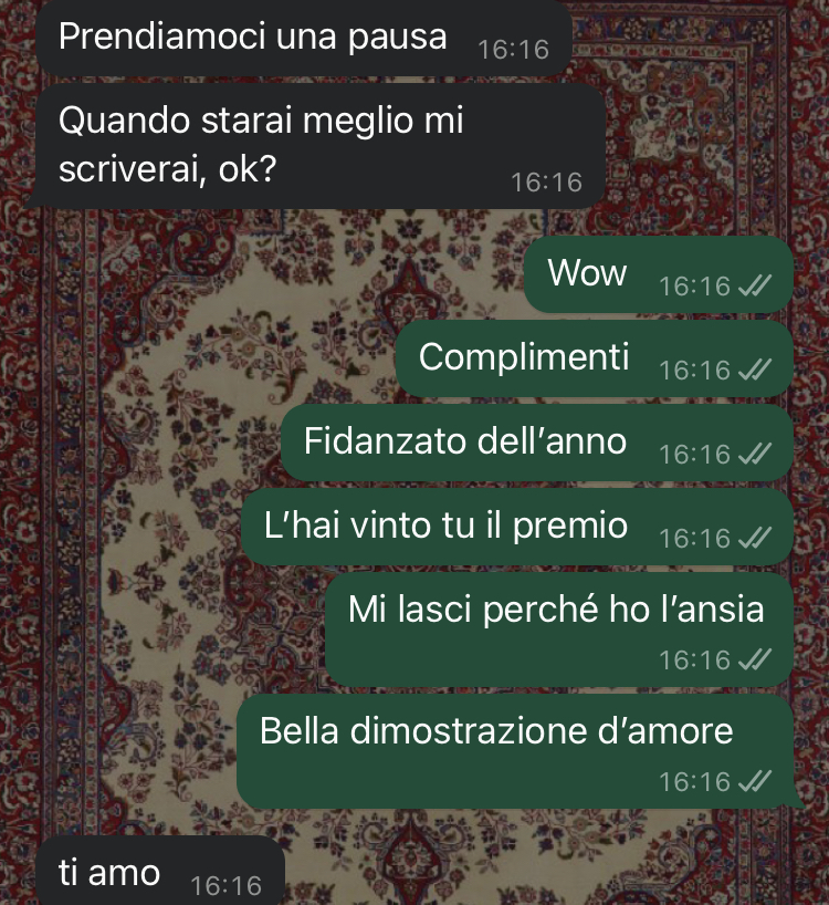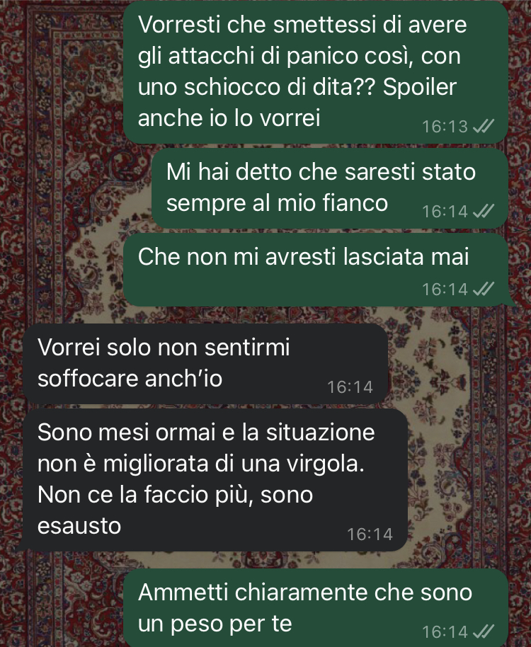 Purtroppo, nell’ultima occasione, le cose sono andate diversamente dal solito. Luca, che fino a quel momento aveva sempre risposto con pazienza e comprensione, questa volta ha reagito in modo completamente inaspettato, lasciando la nostra follower ancora più sconvolta. Giulia ha deciso di condividere questa esperienza non solo per cercare un po’ di sollievo emotivo, ma anche per capire se altri hanno vissuto situazioni simili. La giovane descrive la sensazione di stare perdendo tutto ciò che ha, come se le mancasse letteralmente la terra sotto i piedi, prima di procedere a mostrare le conversazioni che hanno scatenato questa crisi.