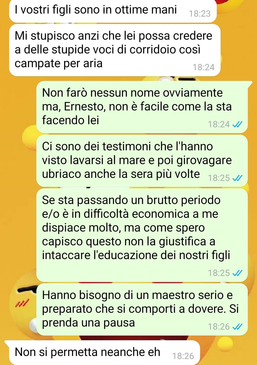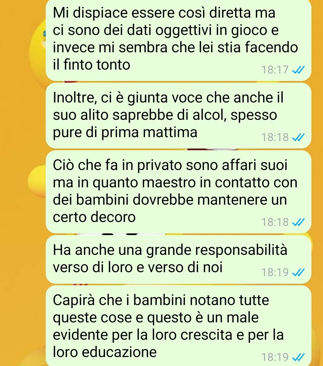 Secondo quanto riferisce l’amica, nel corso di quest’anno scolastico sono però iniziati alcuni problemi legati al maestro di Italiano. Il comportamento dell’insegnante, sia all’interno che all’esterno della scuola, avrebbe iniziato a destare perplessità e malumori. La nostra fan precisa di non voler giudicare le difficoltà economiche o personali di nessuno e di essere consapevole che anche i docenti sono esseri umani, soggetti a errori e fragilità.