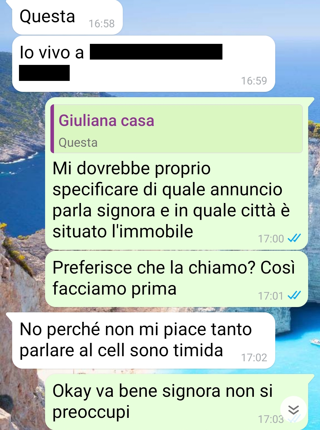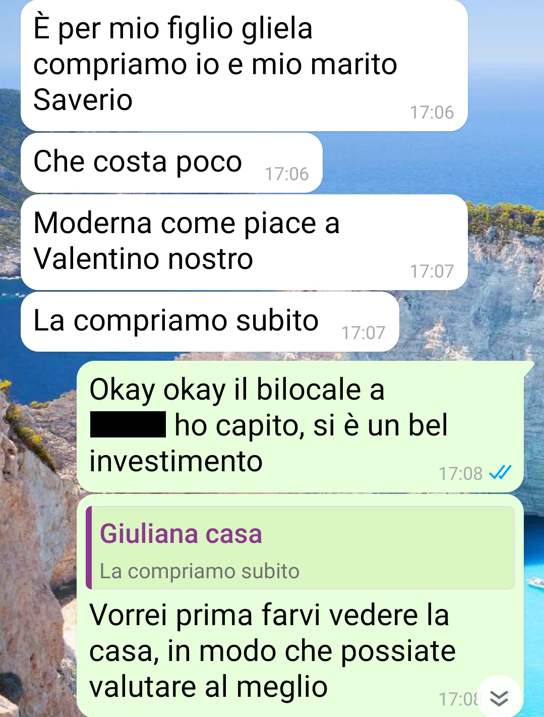 Dopo tutta una trafila per aprire, abbiamo dovuto cercare le case da vendere/affittare e abbiamo trovato quattro immobili nella nostra città e in una cittadina vicina. Mai fatto vendite, finché non mi ha scritto su WhatsApp questa signora di nome Giuliana, interessata a una delle nostre proposte.