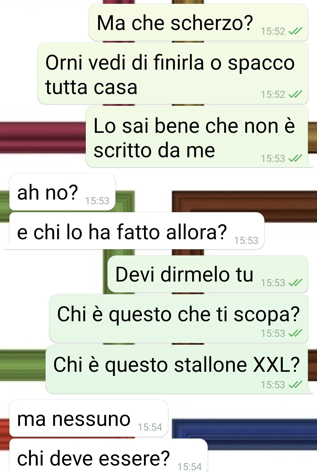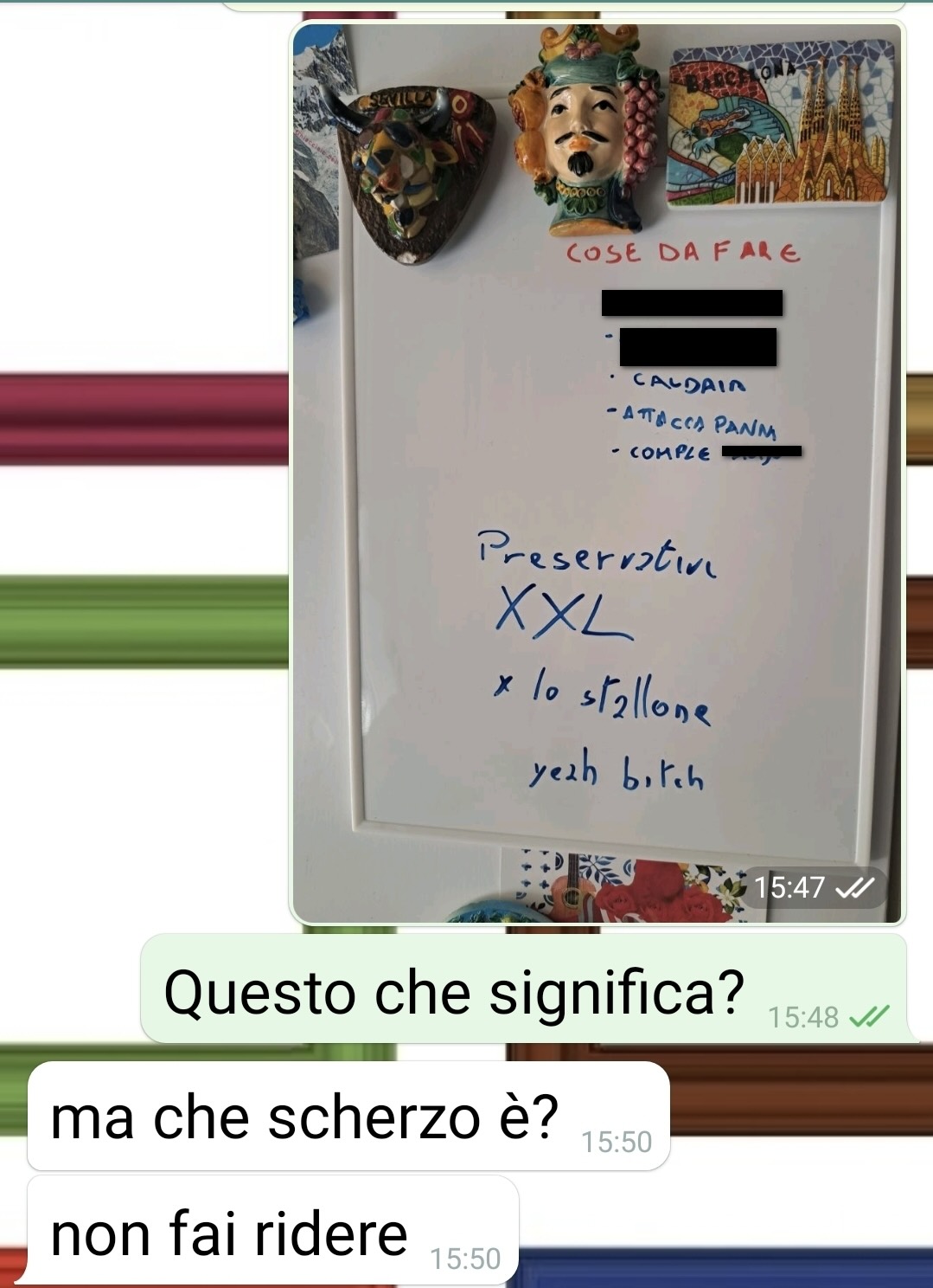 Ho trovato un promemoria a dir poco allucinante sul frigo di casa, e mia moglie dice di non sapere nulla… Per voi cosa è peggio? Essere cornuti o essere presi per il sedere riguardo a tale questione? Perché io credo di trovarmi in entrambe le condizioni, e sinceramente ancora non riesco a capire cosa mi faccia girare di più le scatole. Per non far mancare nulla a mia moglie Ornella ho accettato da qualche mese di fare trasferte di lavoro più lunghe e anche nei fine settimana. Ieri sera torno da una di queste e passiamo una bella serata e nottata. Ma oggi, trovo sulla lavagnetta del frigo un appunto a dir poco scioccante. E non è stato scritto da Ornella. Ma la riguarda da vicinissimo. Mi sento già cornuto e le scrivo incazzato come non mai. Ma a quanto pare c’è una spiegazione logica, che la discolpa in toto. Anzi la rende vittima incolpevole. Meno male, non esiste questo stallone XXL. Posso pure verificare. È tutta colpa della cara e birbante Giovanna. Forse…