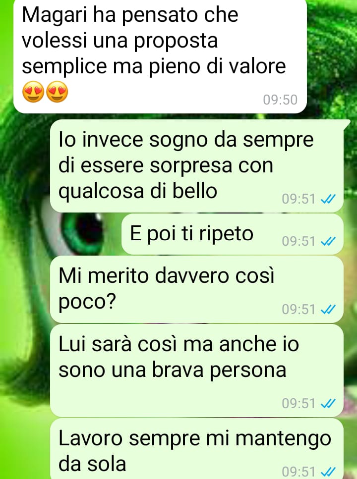 Nel suo racconto, la nostra fan spiega di aver ricevuto una proposta di matrimonio da Valerio, il suo compagno. Dopo giorni di riflessione, si è sentita combattuta e aveva bisogno di parlarne con qualcuno che potesse capirla davvero. Così ha deciso di confidarsi con Caterina, nella speranza di ricevere supporto e comprensione. Tuttavia, la conversazione con l’amica si è rivelata tutt’altro che confortante.