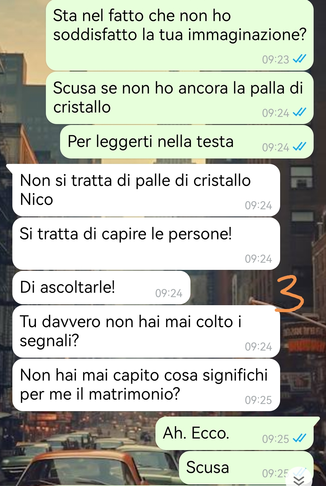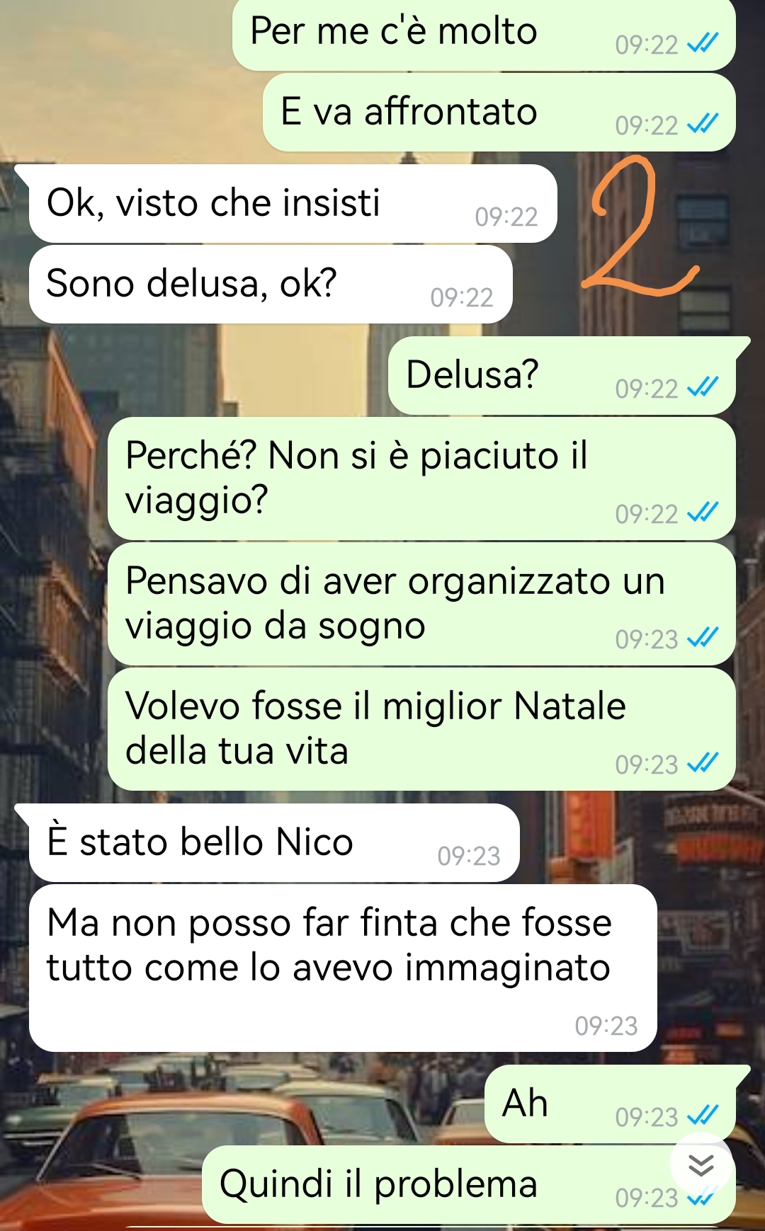 Ciao, sono Nico e ho davvero bisogno di un confronto. Vi spiego: quest’anno per Natale ho deciso di fare qualcosa di speciale per Aurora, la mia ragazza. Volevo sorprenderla e farle un regalo che non dimenticasse mai. Così ho organizzato un viaggio a New York: il nostro primo Natale insieme tra le luci della Grande Mela, pattinaggio sul ghiaccio, una cena in un ristorante con vista spettacolare e un hotel di lusso. Insomma, pensavo di aver fatto davvero centro. E invece no. Al ritorno in Italia, Aurora era fredda e distaccata, quasi arrabbiata. Ho provato a parlarle, ma ogni volta mi rispondeva con un “niente” che mi faceva impazzire. Alla fine, l’ho messa alle strette, e sapete cosa? Era delusa. Vi chiederete: perché? Leggete la chat, scopritelo, e datemi un consiglio! Adesso siamo in crisi, e io mi chiedo: ho sbagliato io a non capirla o ha esagerato lei con le sue aspettative?