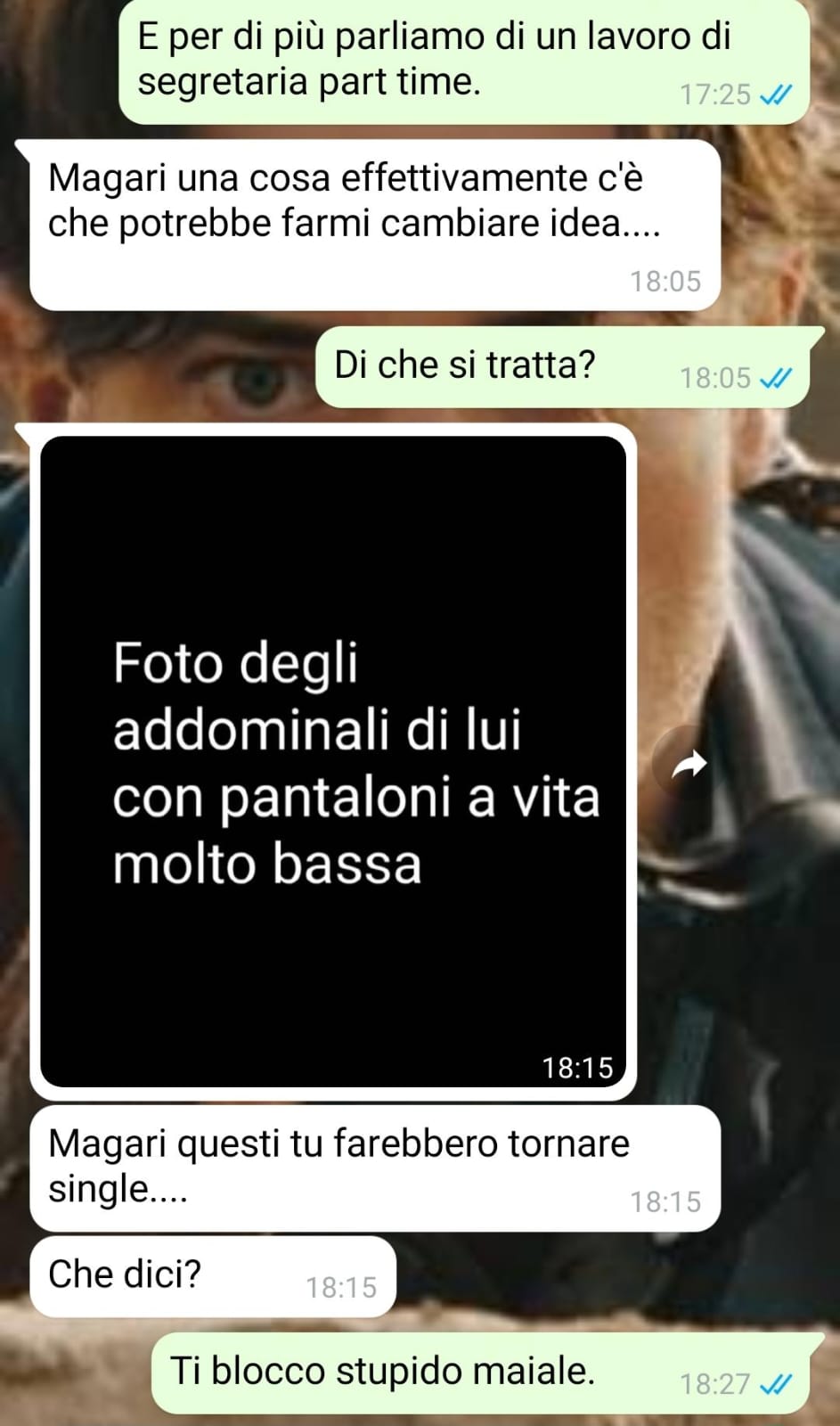 Grazie a un amico, scopre che un conoscente sta cercando una segretaria e decide di proporsi. Il colloquio avviene in modo informale e il lavoro, seppur part-time, le sembra una buona opportunità per iniziare a risparmiare seriamente e avvicinarsi al suo obiettivo di indipendenza. Finora ha dato ripetizioni, ma non è più sufficiente per lasciare la casa dei genitori. Tutto sembra andare per il meglio, fino a quando qualcosa cambia in modo inaspettato. Nella chat che condivide, racconta cosa è accaduto dopo il colloquio, lasciandola senza parole.