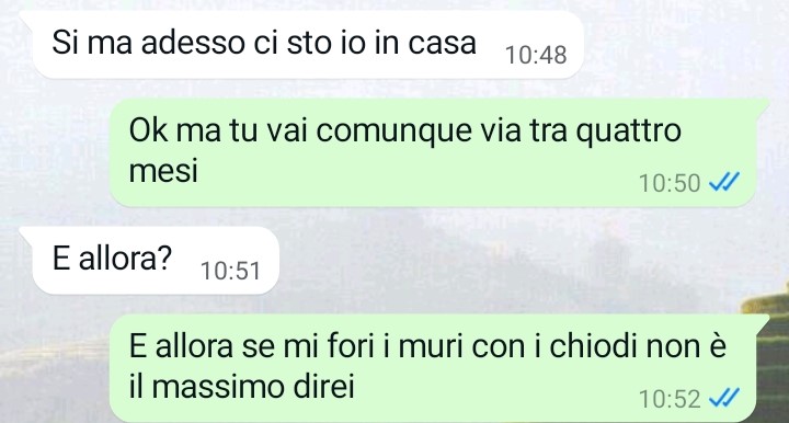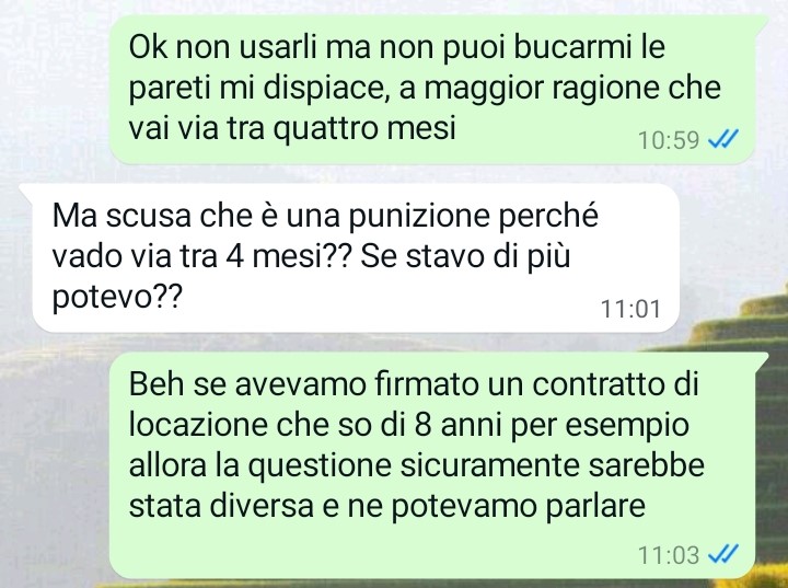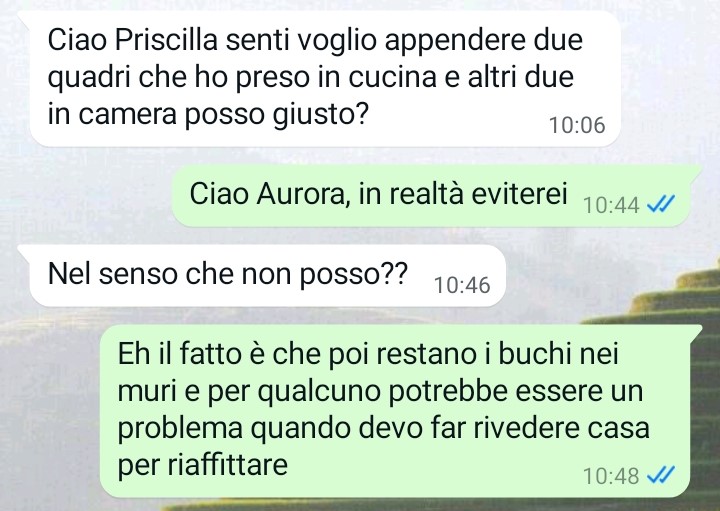 Mi chiamo Priscilla e ho deciso di scrivervi perché mi sento estremamente frustrata in questo momento e ho bisogno di sfogarmi in qualche modo. Vi spiego: sono tanti anni ormai che affitto l’appartamento che è stato dei miei genitori e in cui io sono cresciuta prima di sposarmi e andare via di casa. Potete quindi capire bene quanto io tenga al mio appartamento e che tipo di legame affettivo mi lega alla casa che è stata dei miei genitori e dove loro hanno sempre vissuto, fino all’ultimo istante della loro vita. Da due anni a questa parte ho affittato la casa ad una donna giovane che pensavo fosse educata e tranquilla e in effetti fino ad oggi non mi ha mai dato nessun problema; stamattina però mi scrive per farmi una richiesta e appena gliela nego la situazione degenera di brutto, finendo per toccare i limiti dell’assurdo. Leggete la chat e scoprirete che mi è successo.