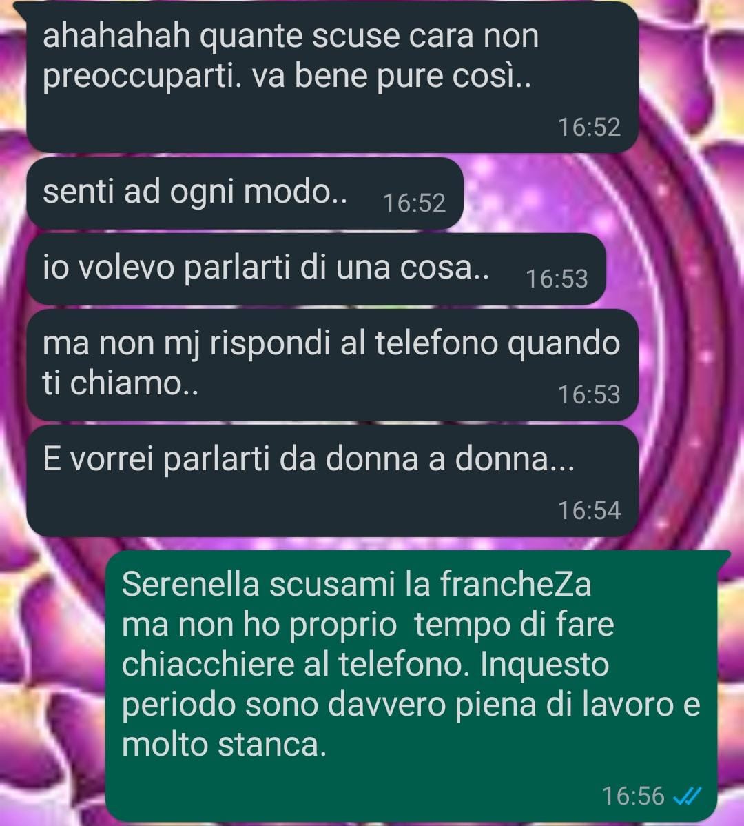 Il culmine di questa tensione è stato raggiunto quando Serenella ha agito in modo da esplicitare il suo disappunto verso Alice, arrivando persino a cancellare i messaggi da una conversazione in cui esprimeva chiaramente la sua disapprovazione. Serenella sperava probabilmente di nascondere le sue vere opinioni e azioni, ma Alice, sospettosa del comportamento di Serenella, ha preservato degli screenshot di quella conversazione.