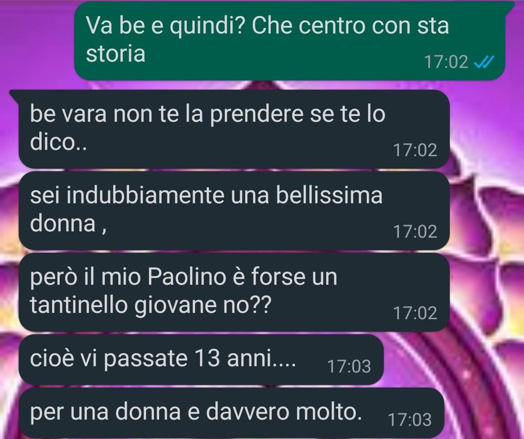 Alice condivide la sua frustrazione e delusione nei confronti della madre del suo compagno, Paolo. La relazione con Serenella, la “suocera” di Alice, è stata fonte di tensione fin dall’inizio. Serenella si presenta come una figura estremamente protettiva nei confronti del suo unico figlio maschio, oltre a essere pignola e competitiva. Queste caratteristiche hanno creato una situazione difficile per Alice, che, nonostante la propria autostima e indipendenza economica, si trova continuamente messa alla prova dagli atteggiamenti critici di Serenella.