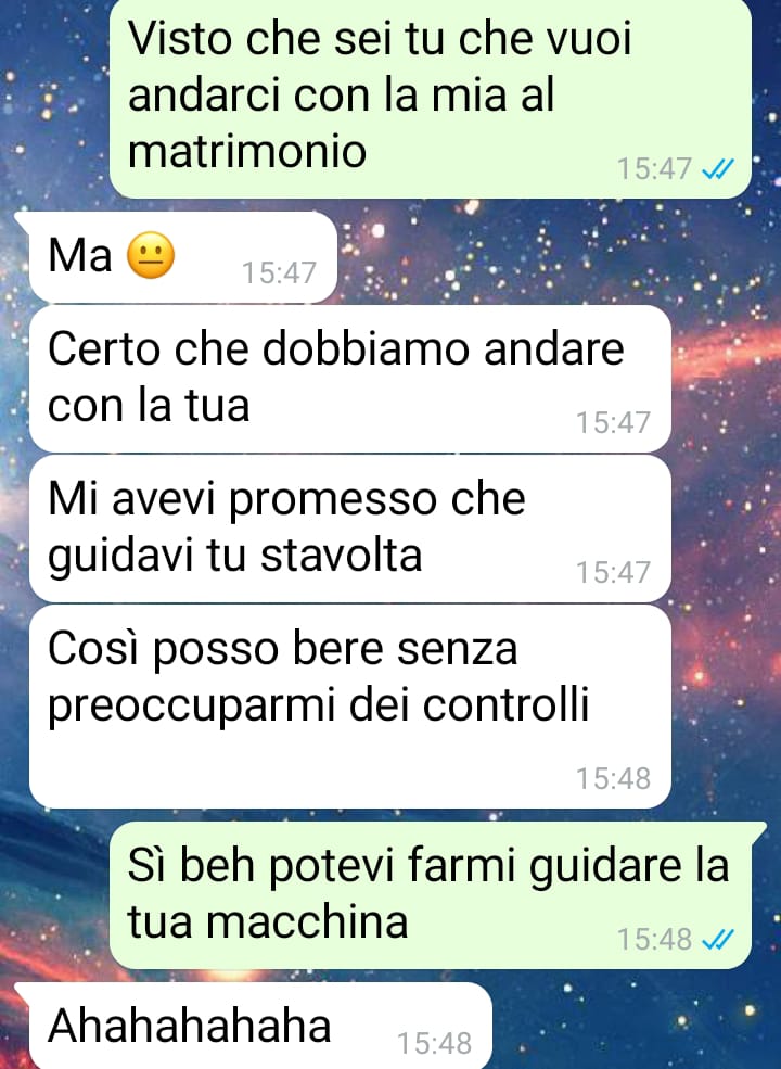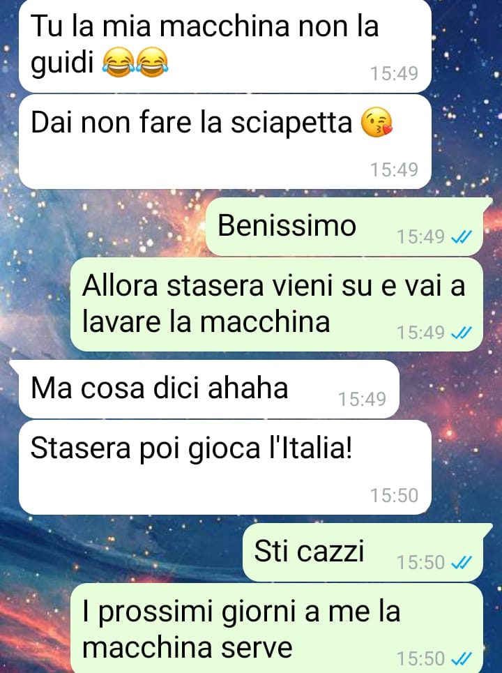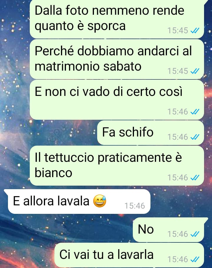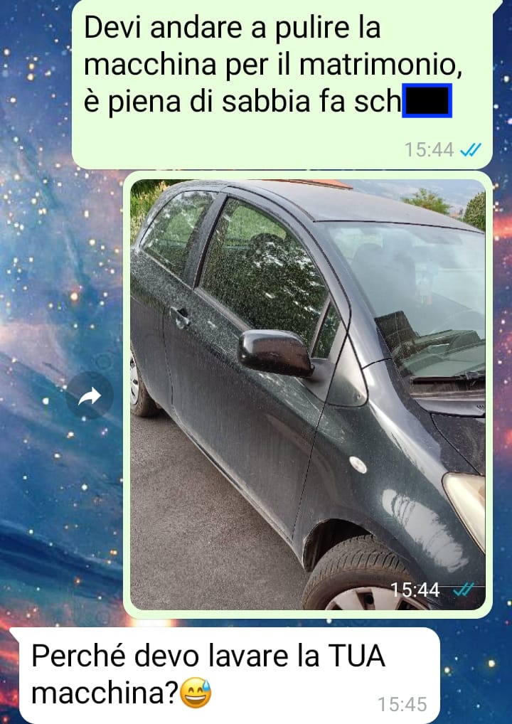 Buongiorno a tutti, sono una donna di 32 anni. Questi screen dimostrano quanto il maschilismo sia radicato nella nostra quotidianità senza che nemmeno ce ne rendiamo conto e io ne ho avuto la dimostrazione a seguito di un’affermazione che il mio ragazzo mi ha fatto alcuni giorni prima della chat. Sappiamo tutti che in italia ha piovuto sabbia per giorni interi e chi come me non ha un posto nel garage si è ritrovato la macchina letteralmente sporca di marrone. Dal momento che nel fine settimana avremo un matrimonio, ho subito scritto al mio ragazzo per fargli sapere che serve andare a lavarla. Mi aspettavo che facesse dei problemi, ma anche che capisse il mio punto di vista una volta spiegato il motivo per ci ero arrabbiata con lui! Così non è stato e io ho avuto la conferma bella e buona che noi donne continuiamo ancora a essere denigrate e additate perfino dai nostri ragazzi considerando tutto questo la normalità. A me non sta più bene e rileggendo più volte la reazione del mio ragazzo ora mi chiedo come sia possibile stare con una persona così immatura.