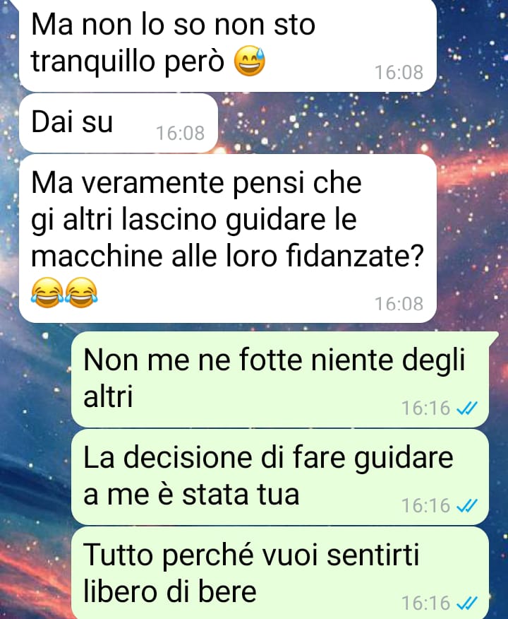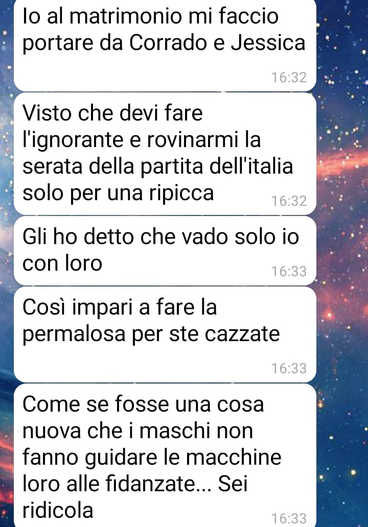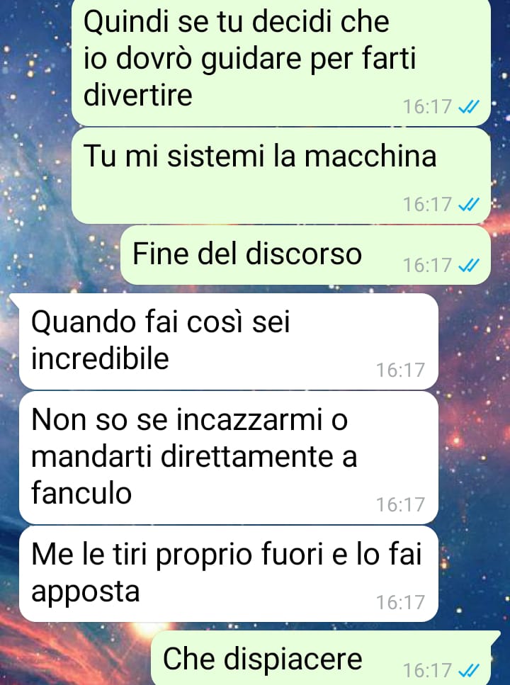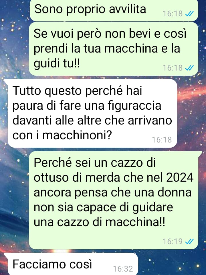 Scrive che rileggendo più volte la chat ha provato una crescente delusione. Si è resa conto di come anche in una relazione apparentemente equilibrata possano nascondersi schemi di comportamento che sottovalutano o ridicolizzano la sensibilità e il punto di vista femminile. Conclude dicendo che questa discussione, nata per un motivo banale, le ha fatto rivalutare profondamente il suo rapporto. Dopo aver letto e riletto le parole del compagno, si è chiesta come sia possibile continuare a stare con una persona che, di fronte a una questione così semplice, ha reagito con tanta immaturità e poca empatia.