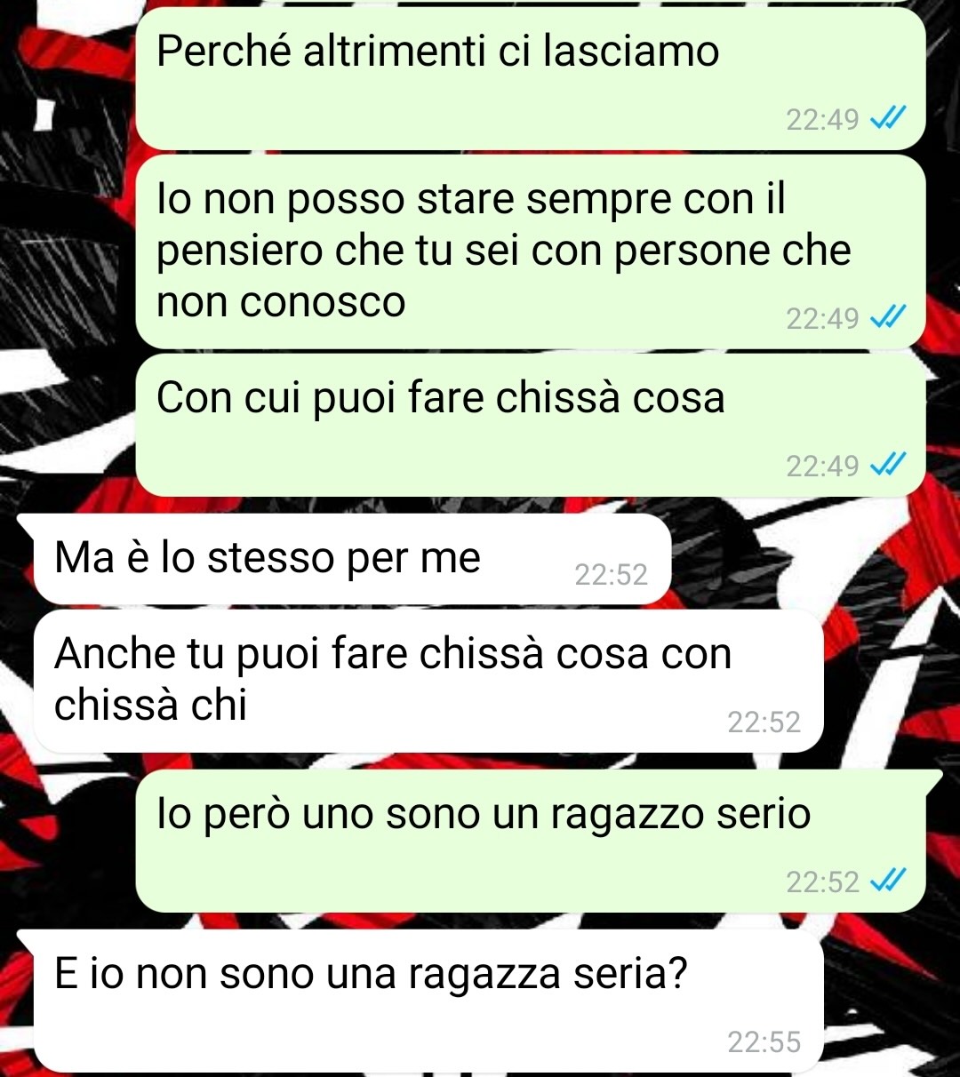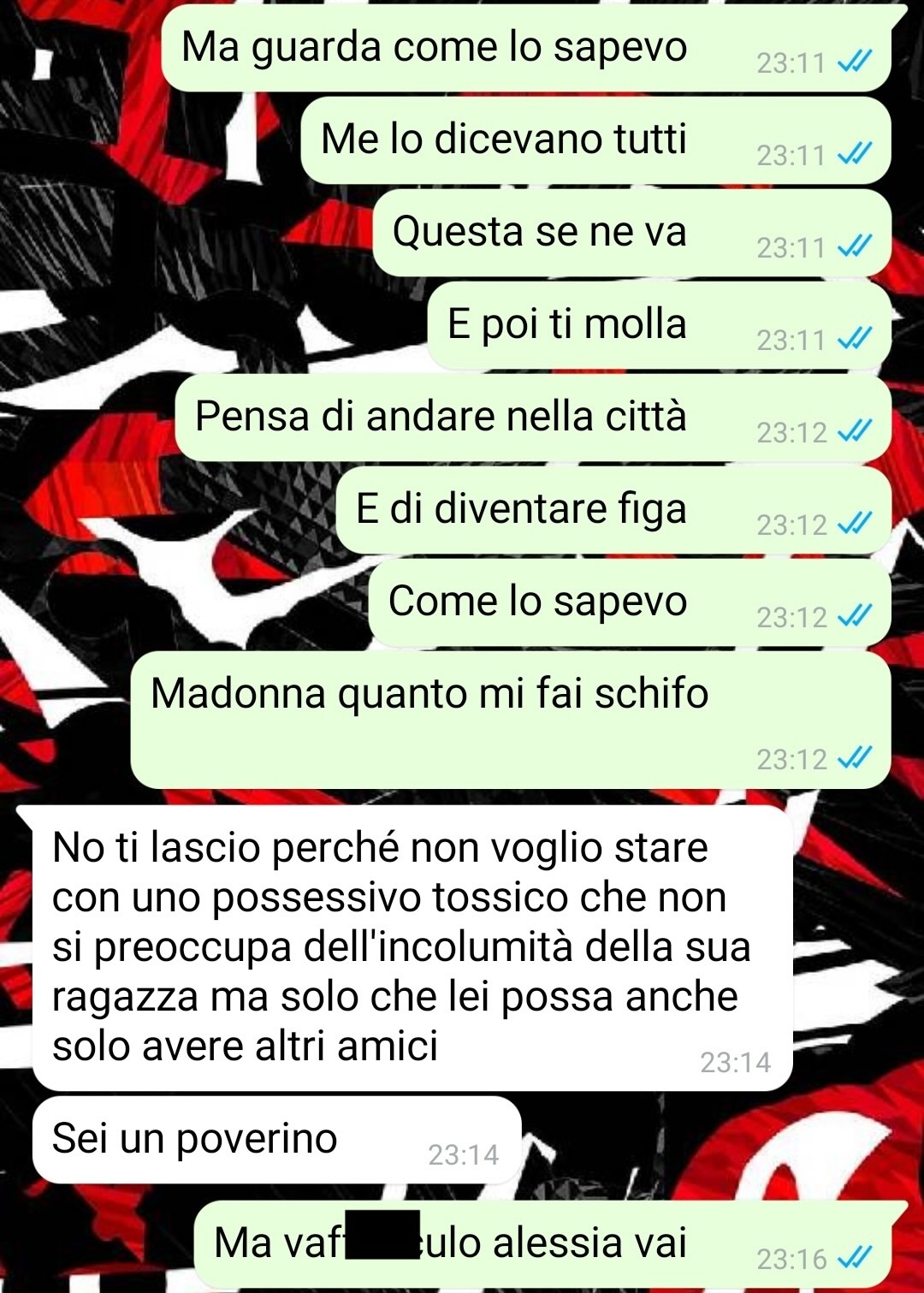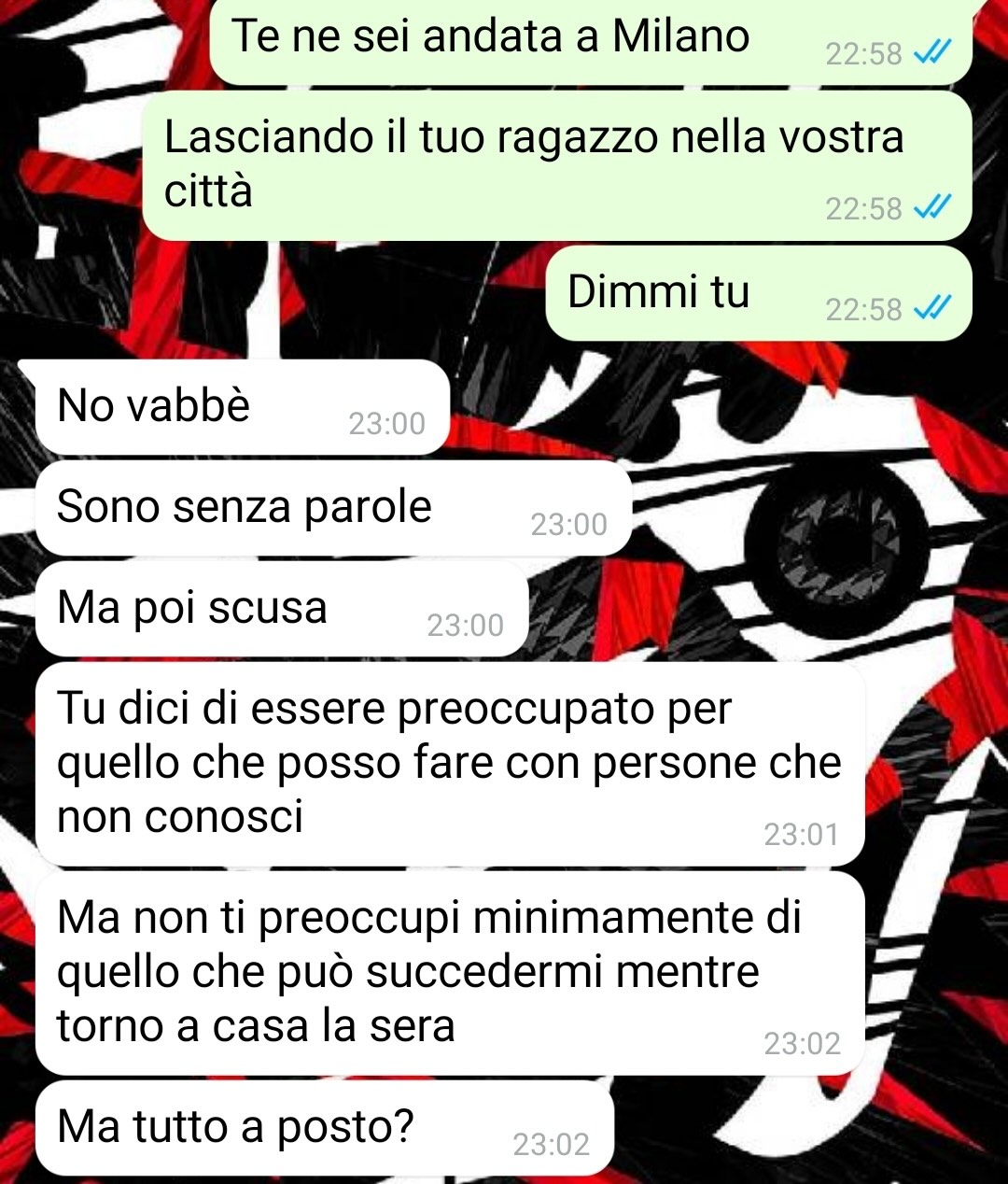Inoltre, il nostro follower esprime ulteriori riserve sulla vita che la compagna sta conducendo a Milano. Non approva il fatto che lei esca spesso, faccia nuove amicizie e torni a casa tardi. A suo dire, avrebbe dovuto concentrarsi esclusivamente sugli studi, evitando tutto ciò che considera superfluo o inopportuno in quella situazione.